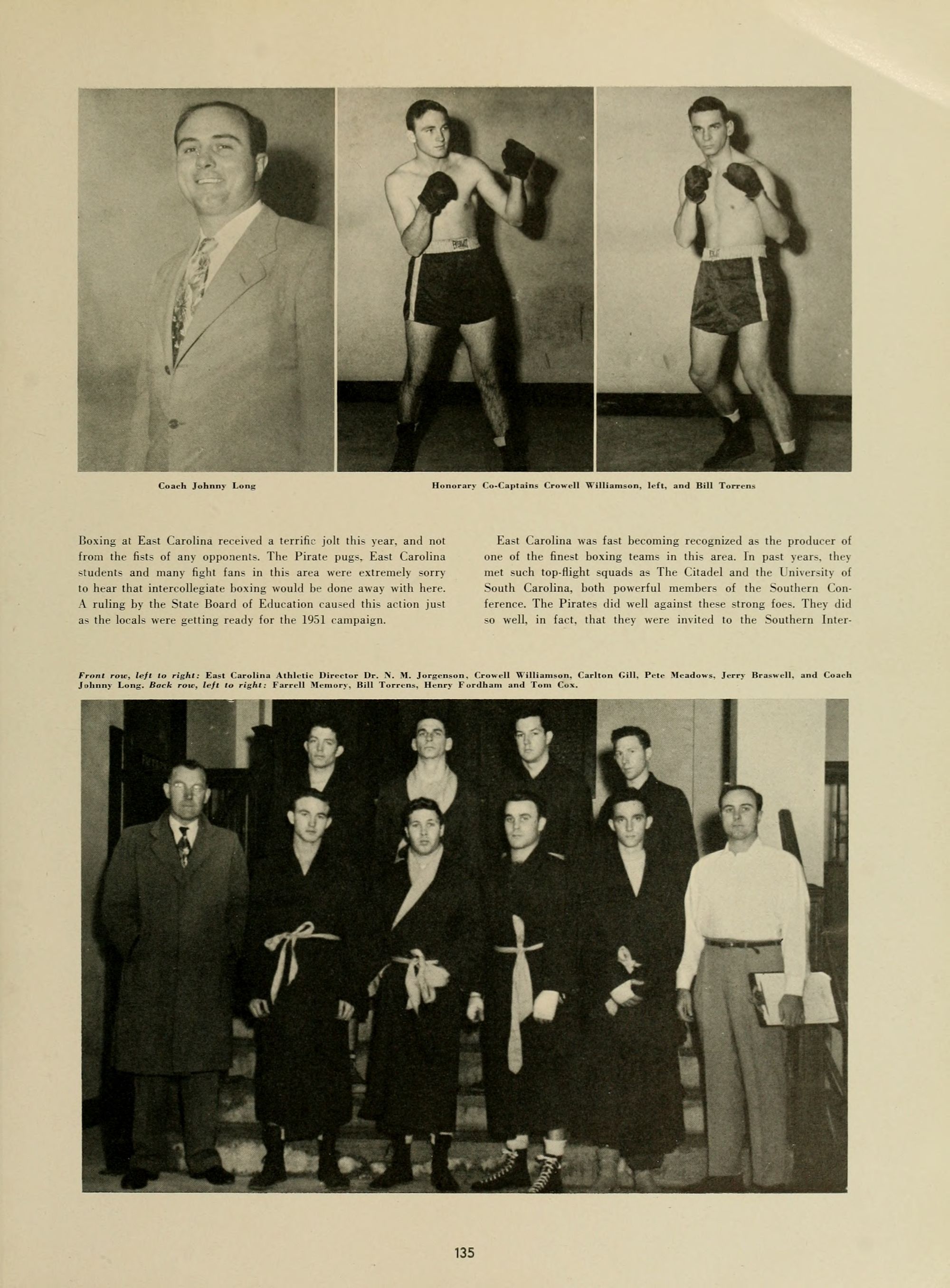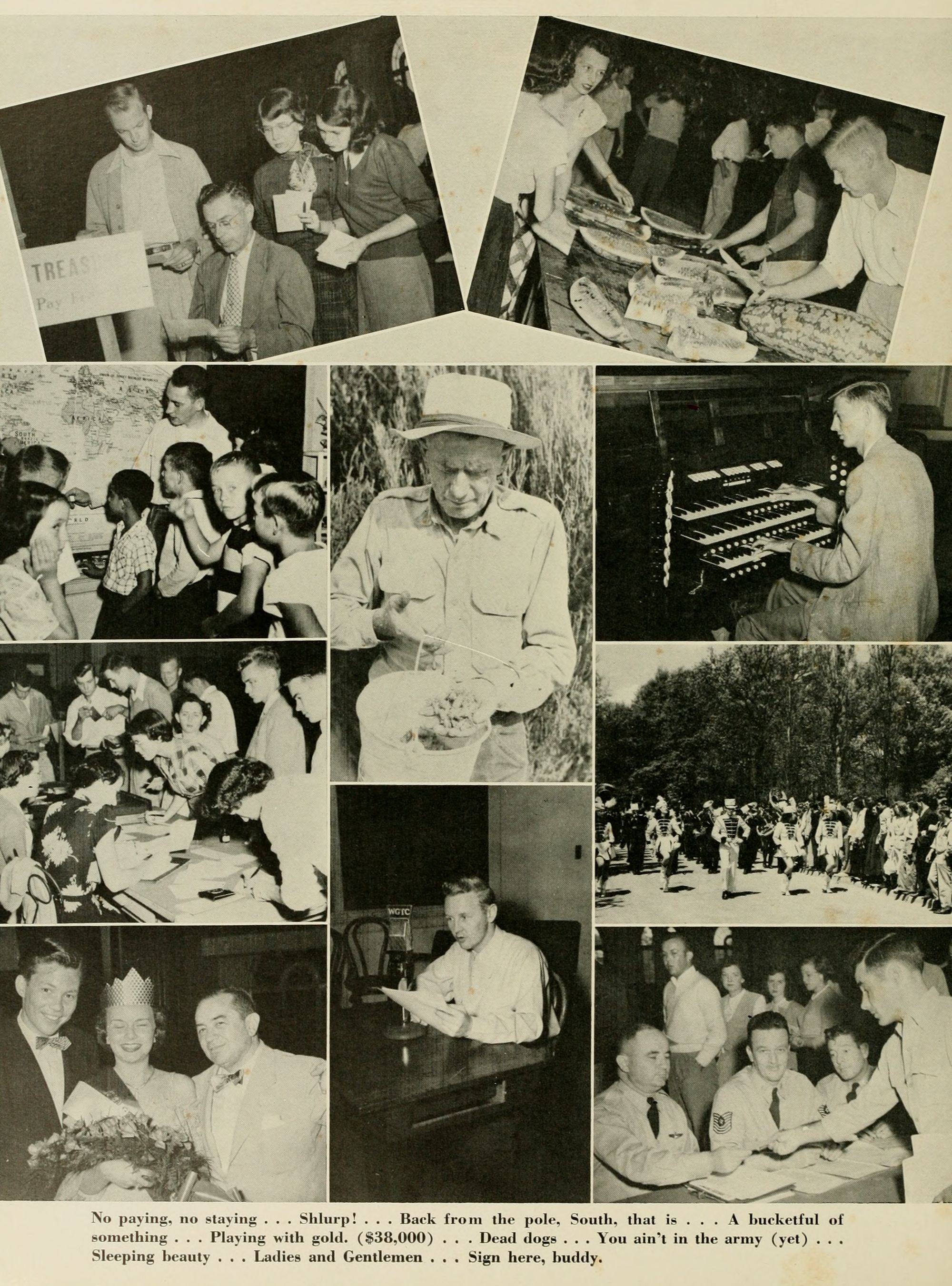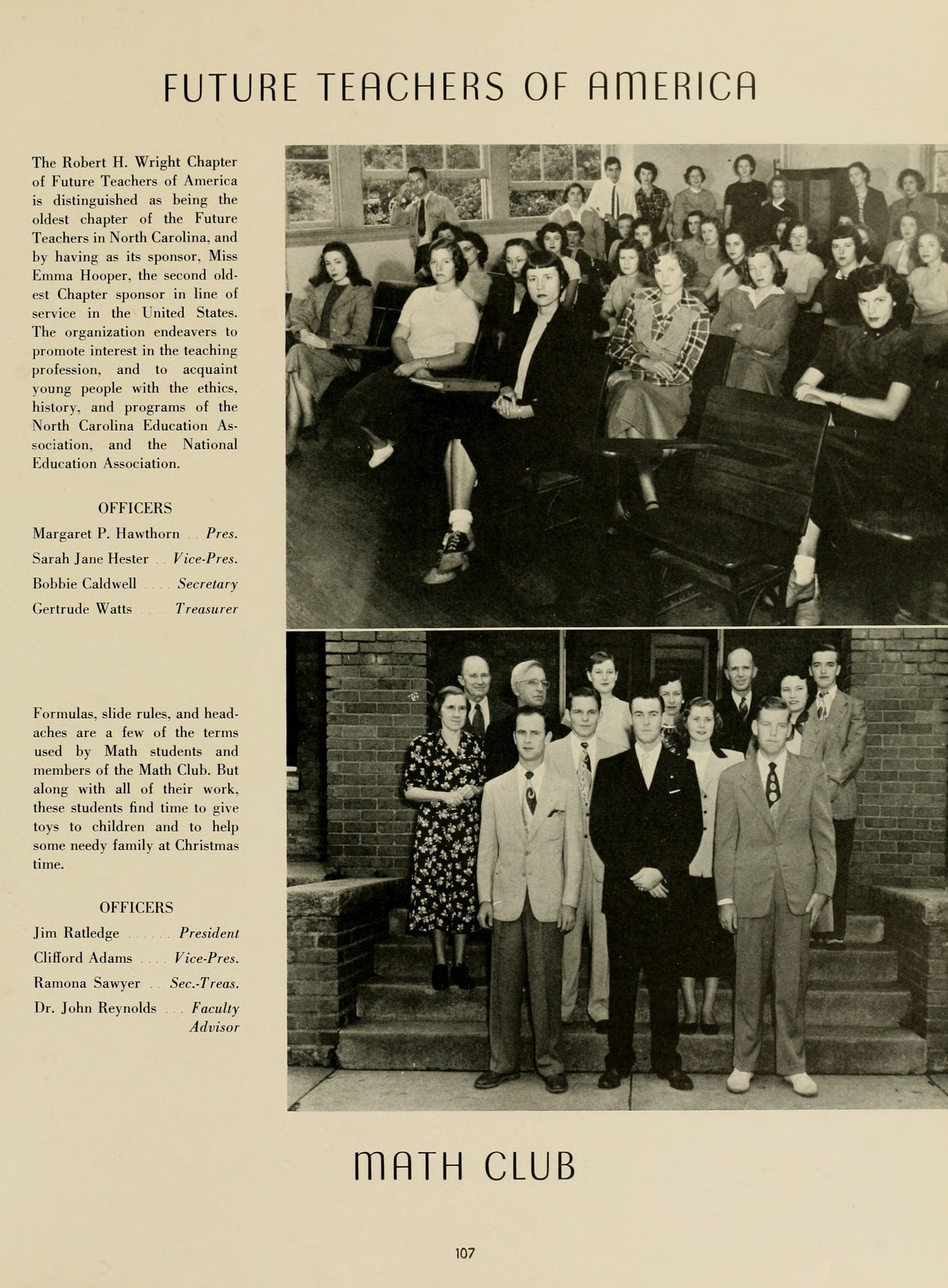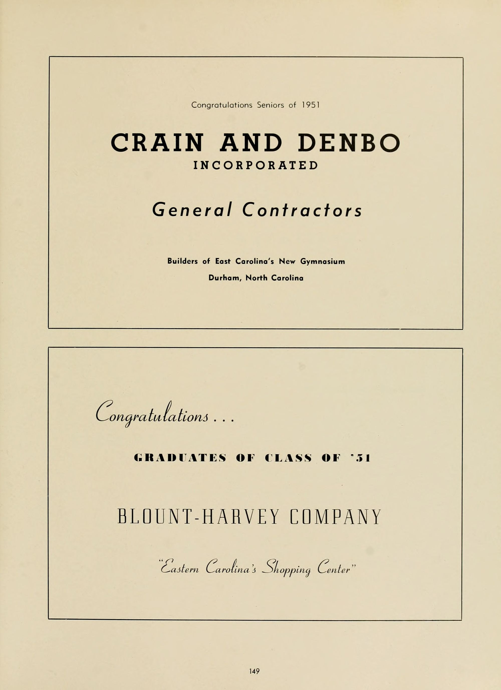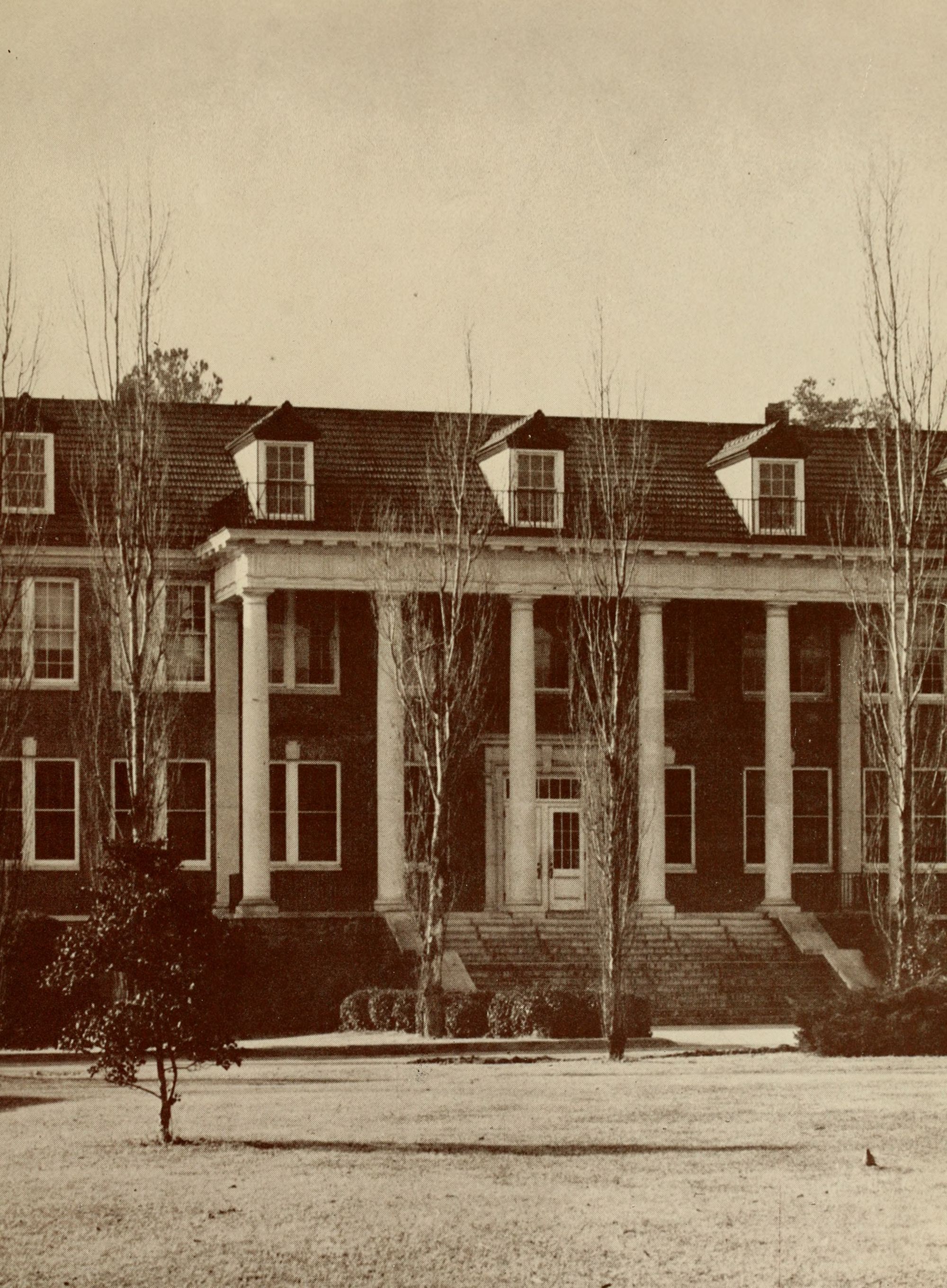 EAST CAROLINA ... the name and title which means so much to all who have trod upon her grounds ... the name which acts as a pin point, pricking and probing into the corners of one's mental machinery and bringing back phases of reminiscence that are so characteristic of well-rounded campus life. The pattern set for days and nights on the East Carolina campus sifts into a recipe of contentment and happiness. Classes in Graham, Flanagan, and grand old Austin . . . gym in Wright Building . . . crowds around post office boxes between classes, blocking the entrance to the dining hall ... the scurrying and confusion around Cotten Hall on Sunday nights when women students return to check in after week-ends off campus . . . the original jargon of the Soda Shop ciowd . . . the solemnity of the library . . . the variety of names dubbed on the men's dorms . . . these thoughts and so many more equally pleasant ones return spontaneously whenever EAST CAROLINA is mentioned. "Hail to thee, our dear ol' school!"