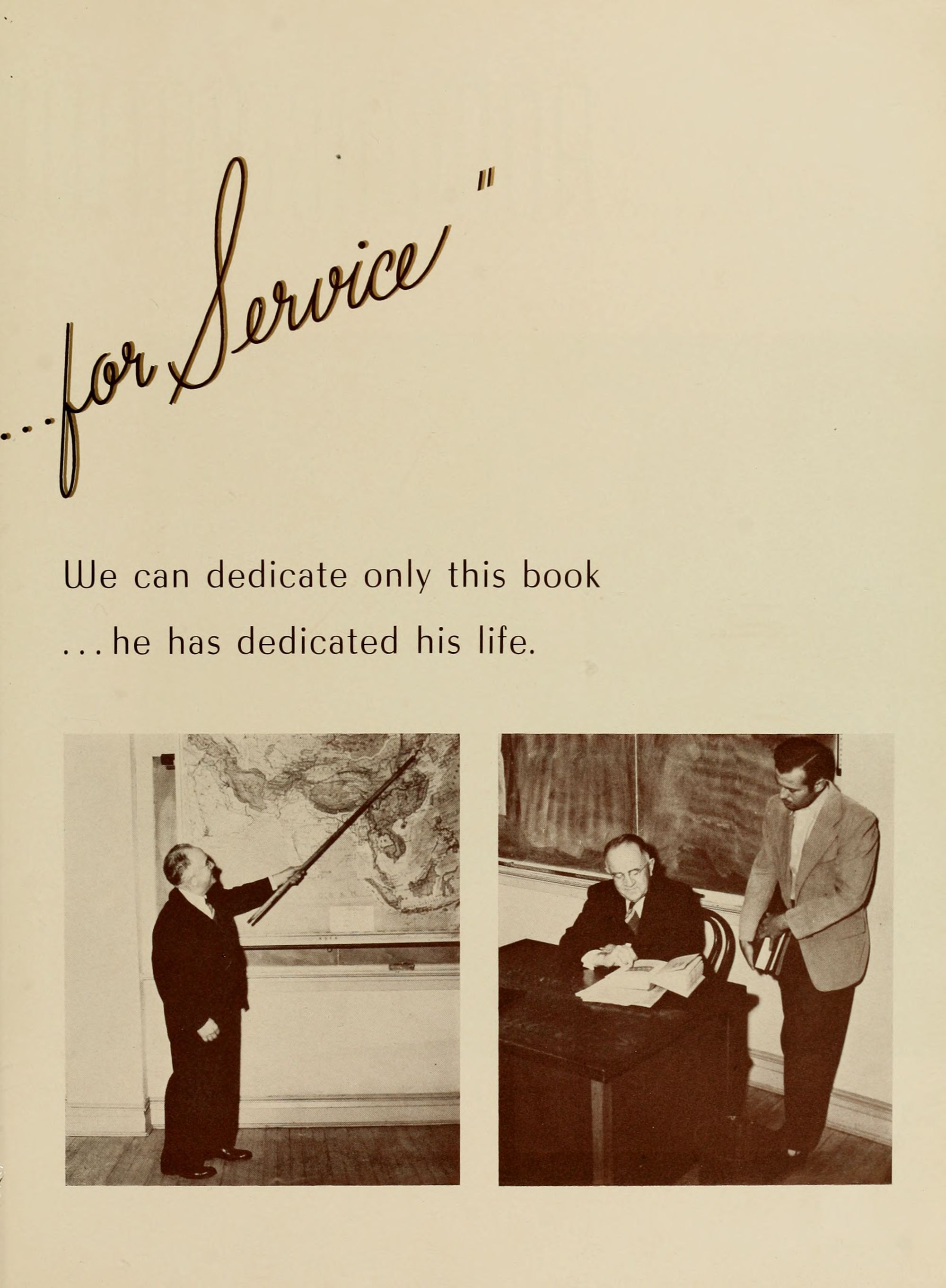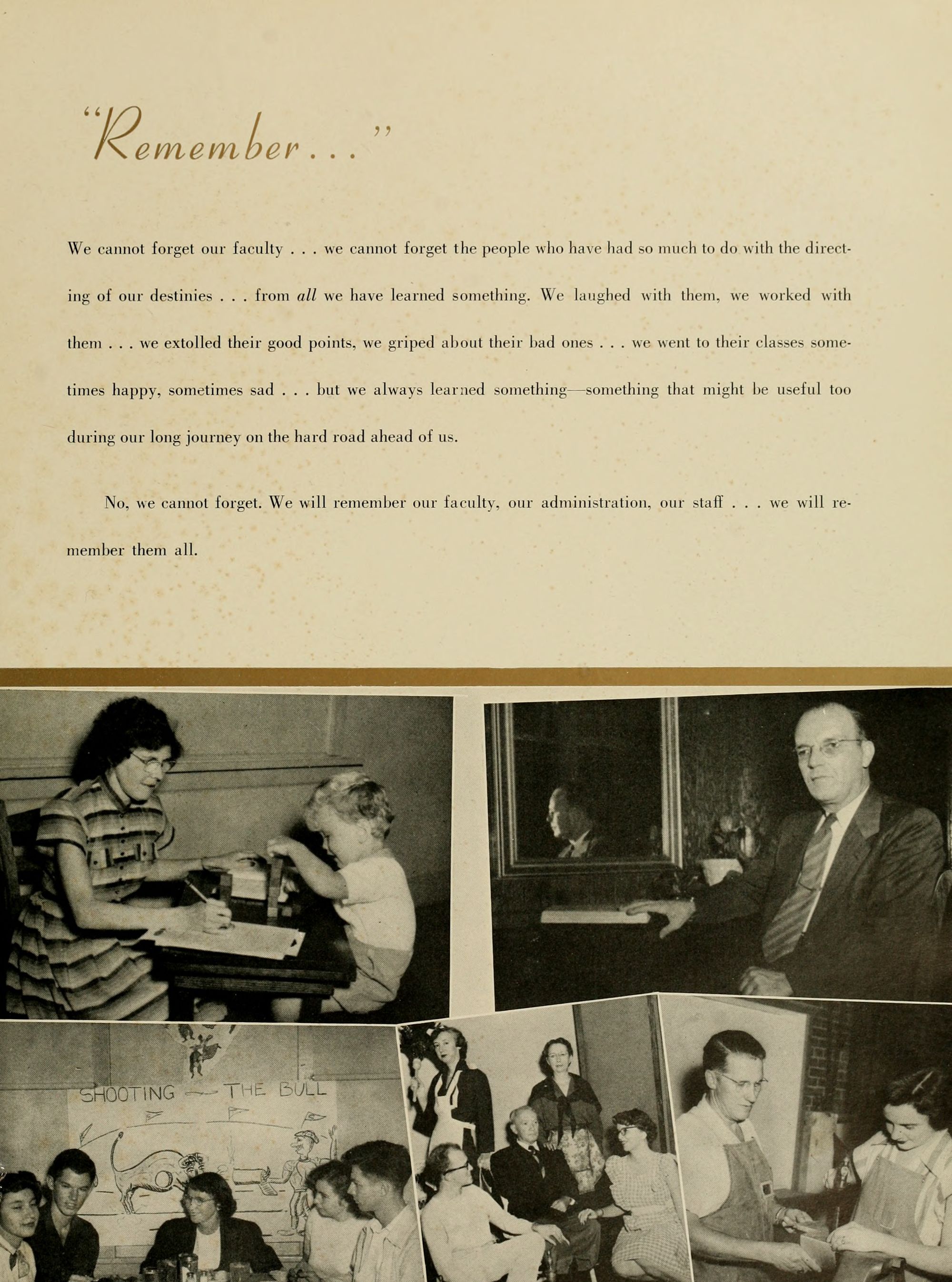 We cannot forget our faculty ... we cannot forget the people who have hadd so much to do with the directing of our destinies . . . from all we have learned something. We laughed with them, we worked with them . . . we extolled their good points, we griped about their had ones ... we went to their classes sometimes happy, sometimes sad . . . but we always learned something - something that might he useful too during our long journey on the hard road ahead of us.