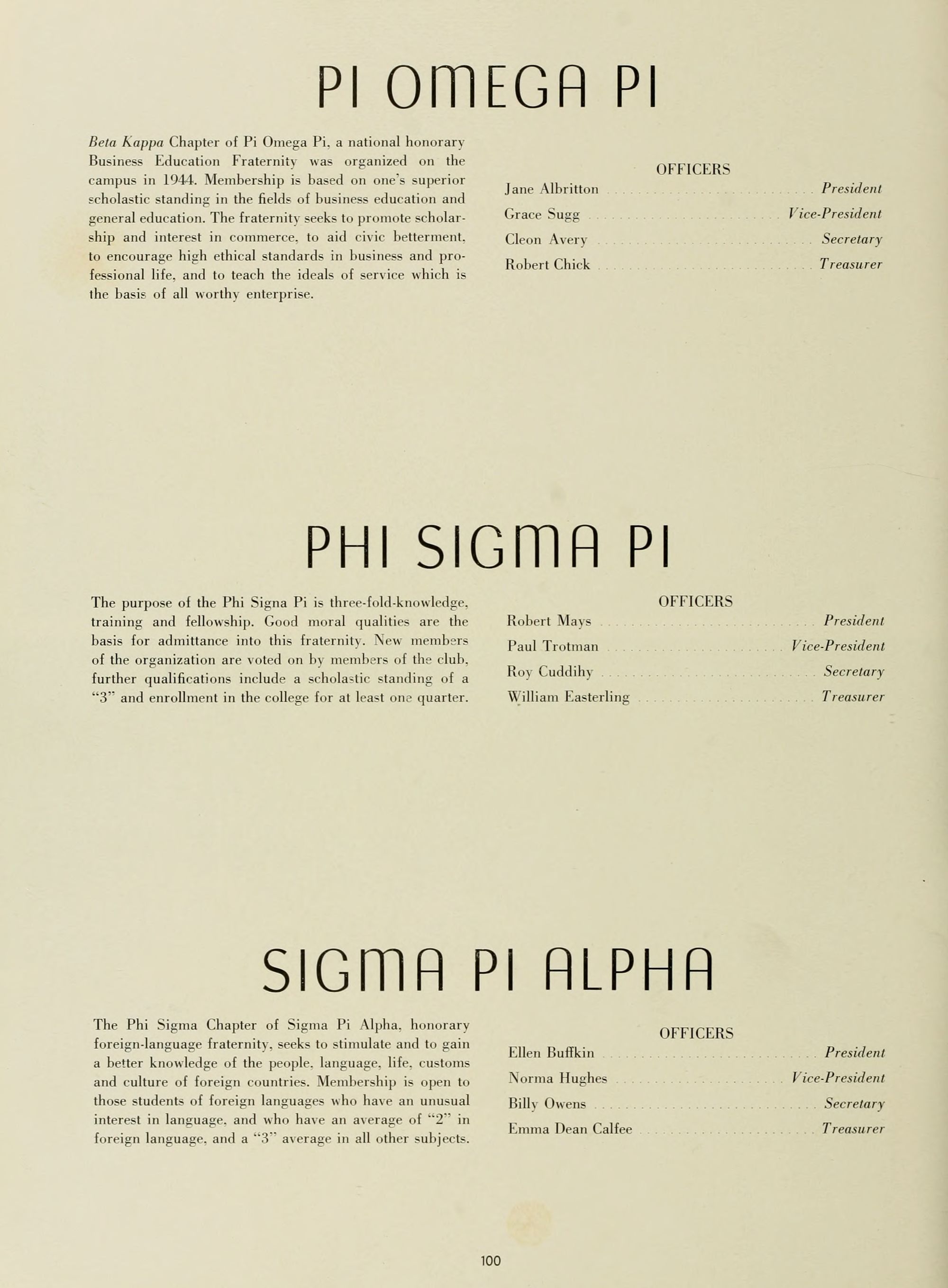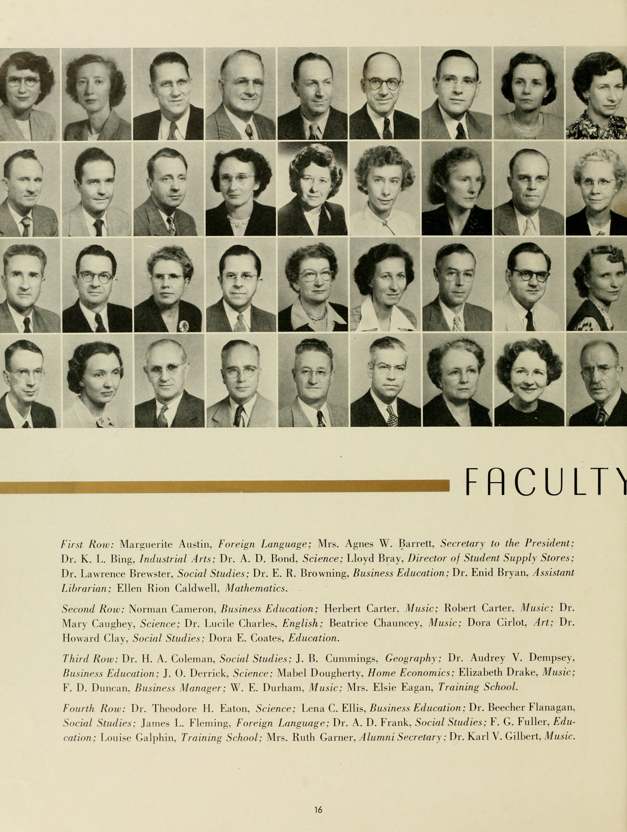 Fourth Row: Dr. Theodore H. Eaton, Science: Lena C. Ellis, Business Ecducation; Dr. Beecher Flanagan, Social Studies; James L. Fleming, Foreign Language; Dr. A. D. Frank, Social Studies; F. G. Fuller, Education; Louise Galphin, Training School; Mrs. Ruth Garner, Alumni Secretary; Dr. Karl V. Gilbert, Music.