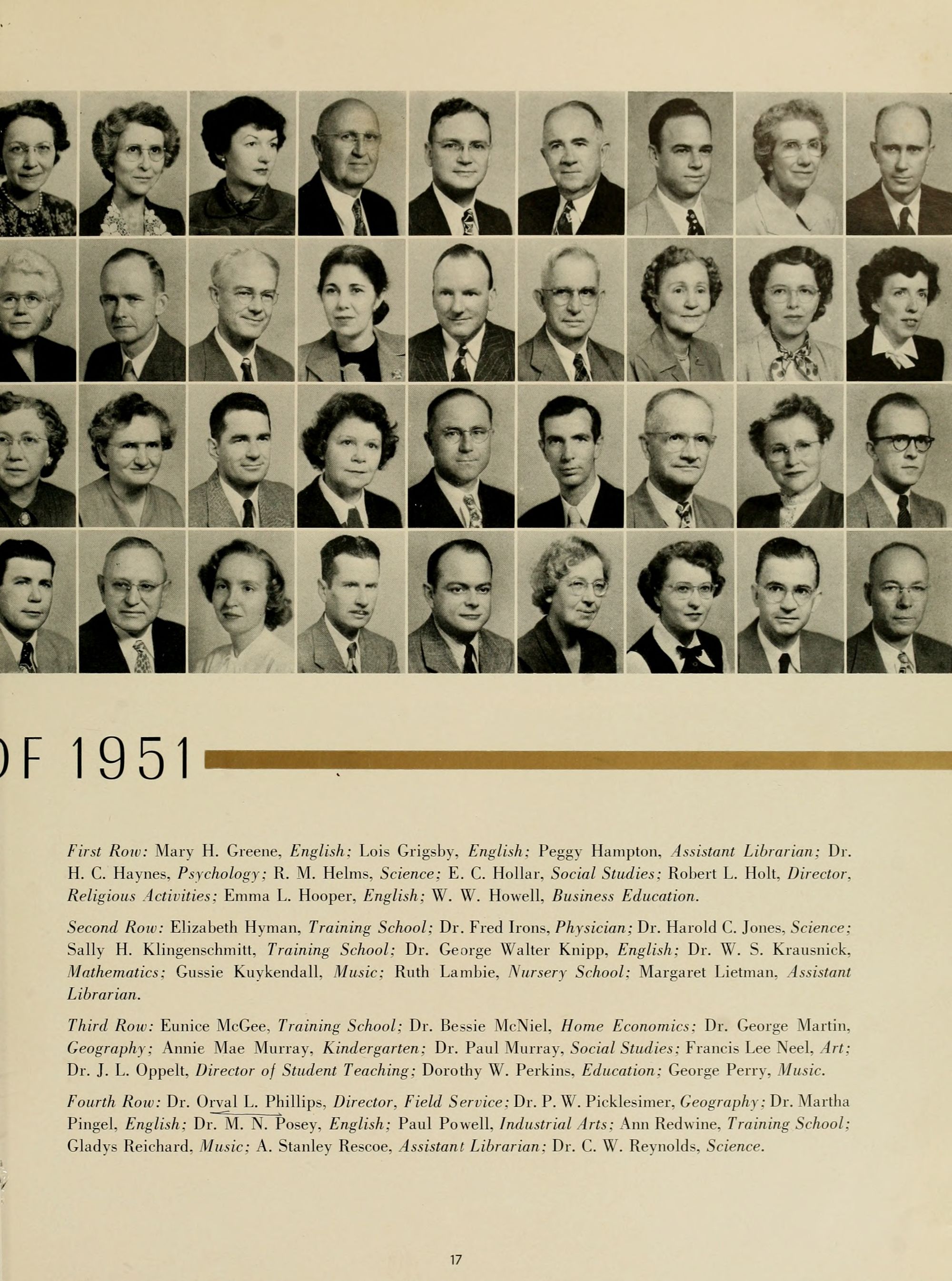 Third Row: Eunice McGee, Training School; Dr. Bessie McNiel, Home Economics; Dr. George Martin, Geography; Annie Mae Murray, Kindergarten; Dr. Paul Murray, Social Studies; Francis Lee Neel, Art; Dr. J. L. Oppelt, Director of Student Teaching; Dorothy W. Perkins, Education; George Perry, Music.