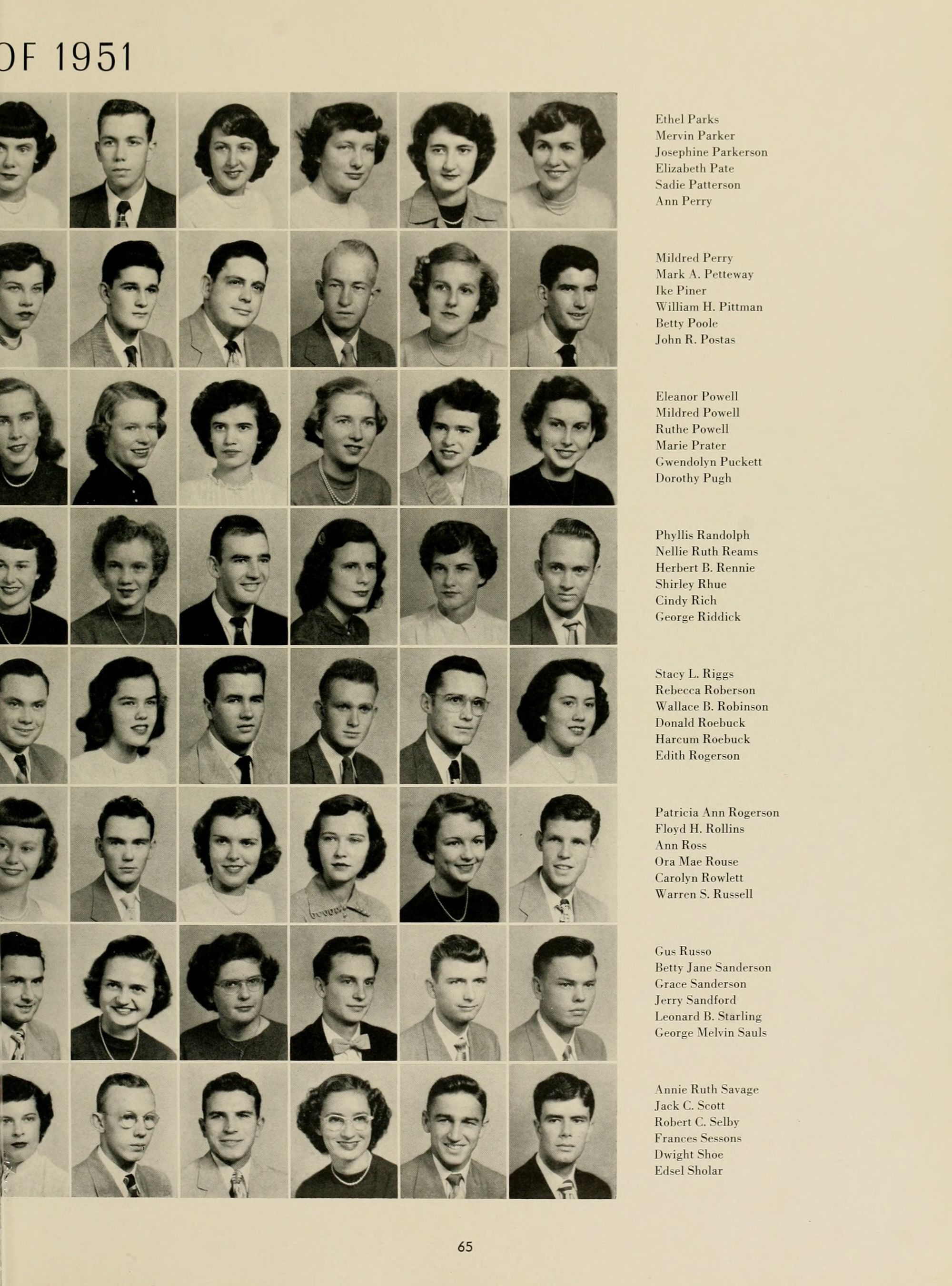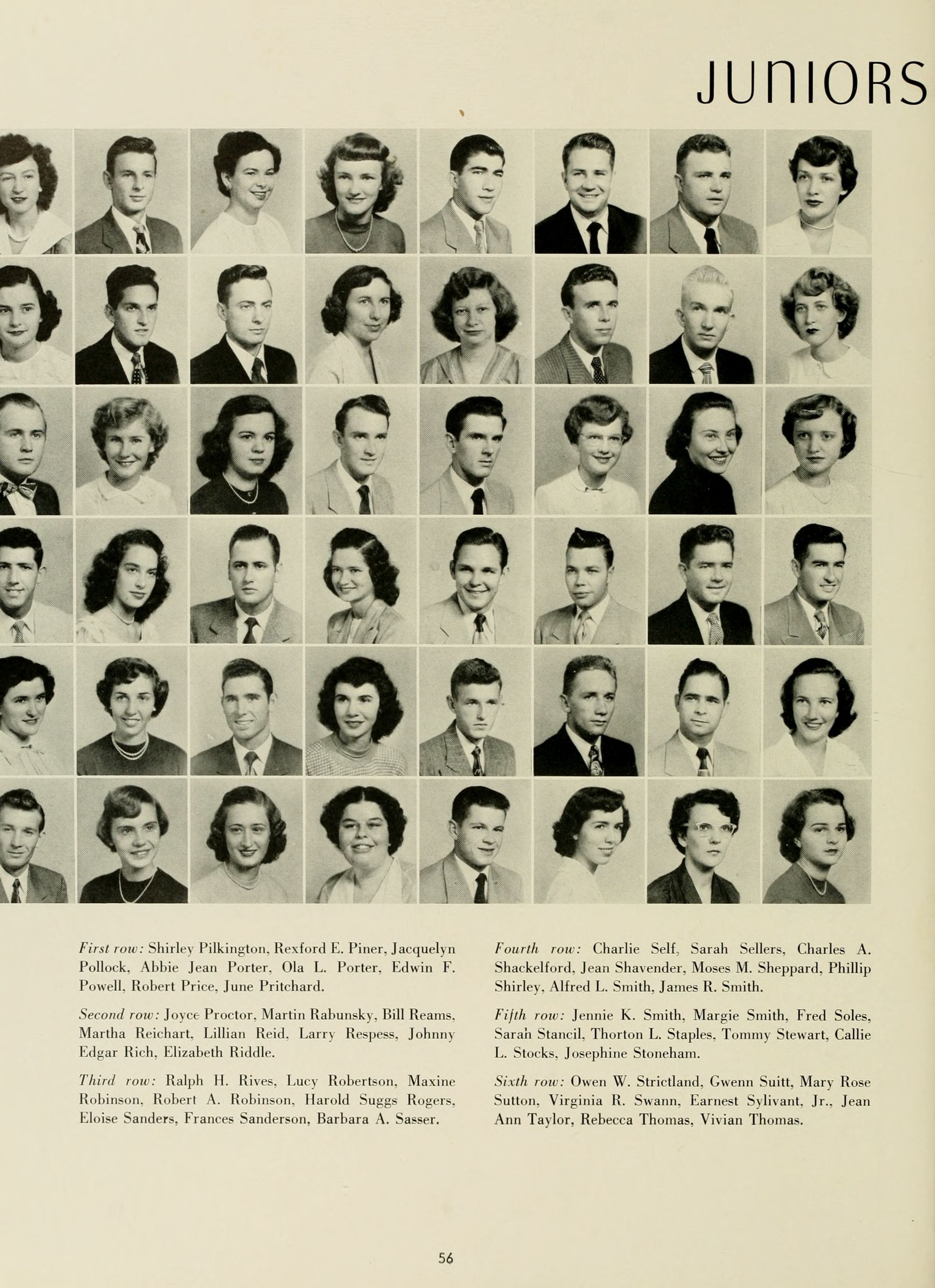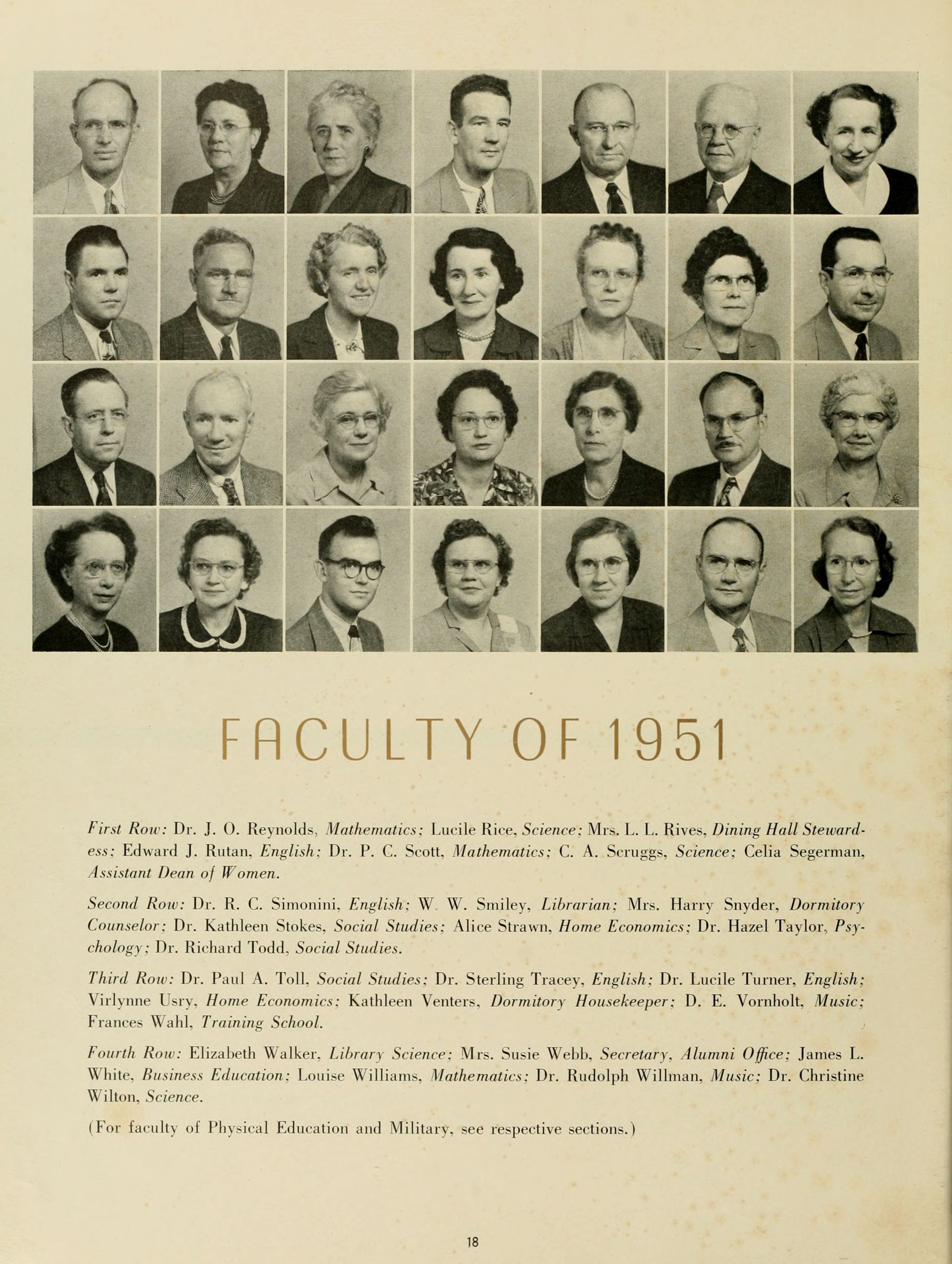 Third Row: Dr. Paul A. Toll, Social Studies; Dr. Sterling Tracey, English; Dr. Lucile Turner, English; Virlynne Usry, Home Economics; Kathleen Venters, Dormitory Housekeeper; D. E. Vornholt, Music; Frances Wahl, Training School.