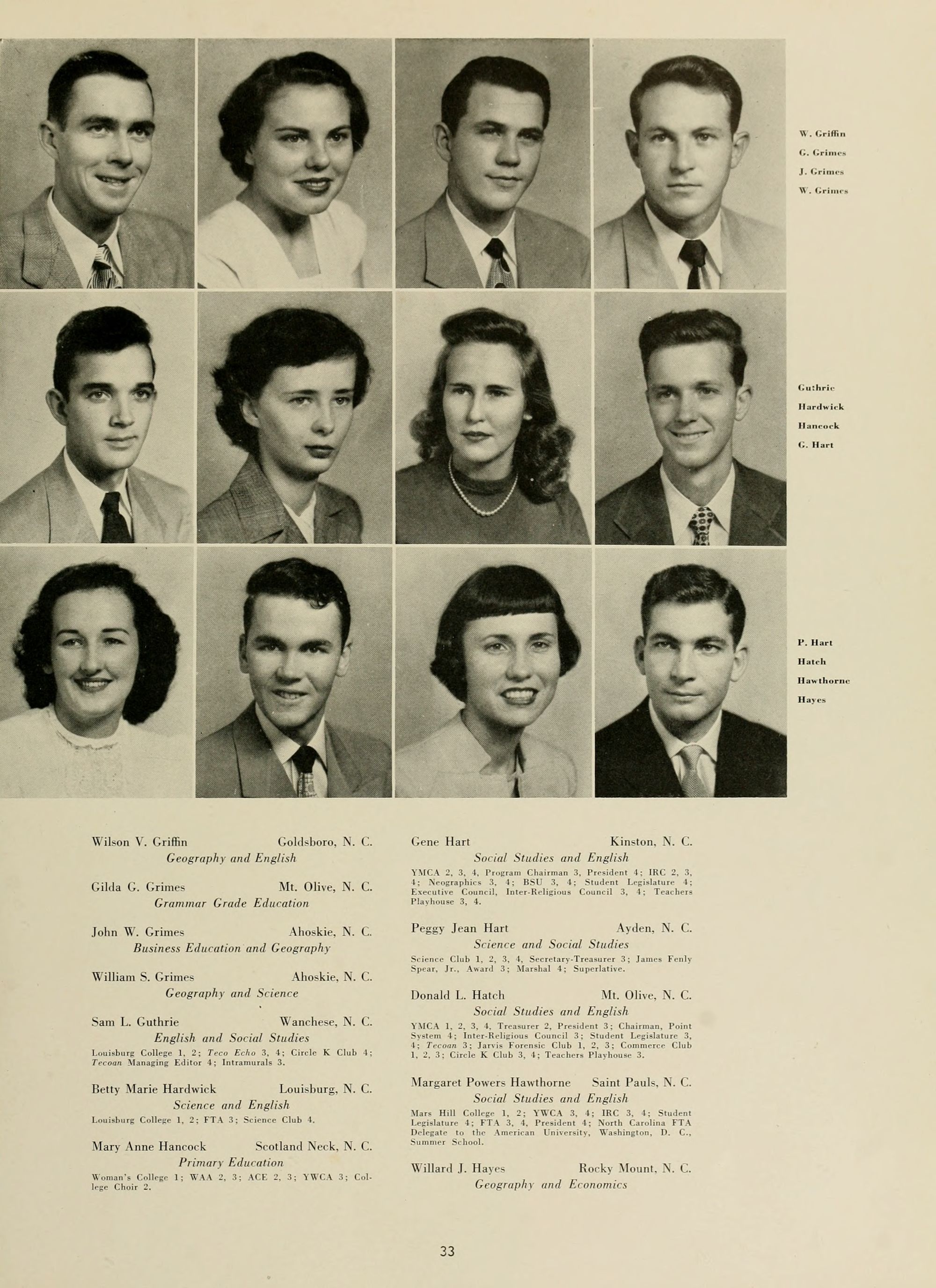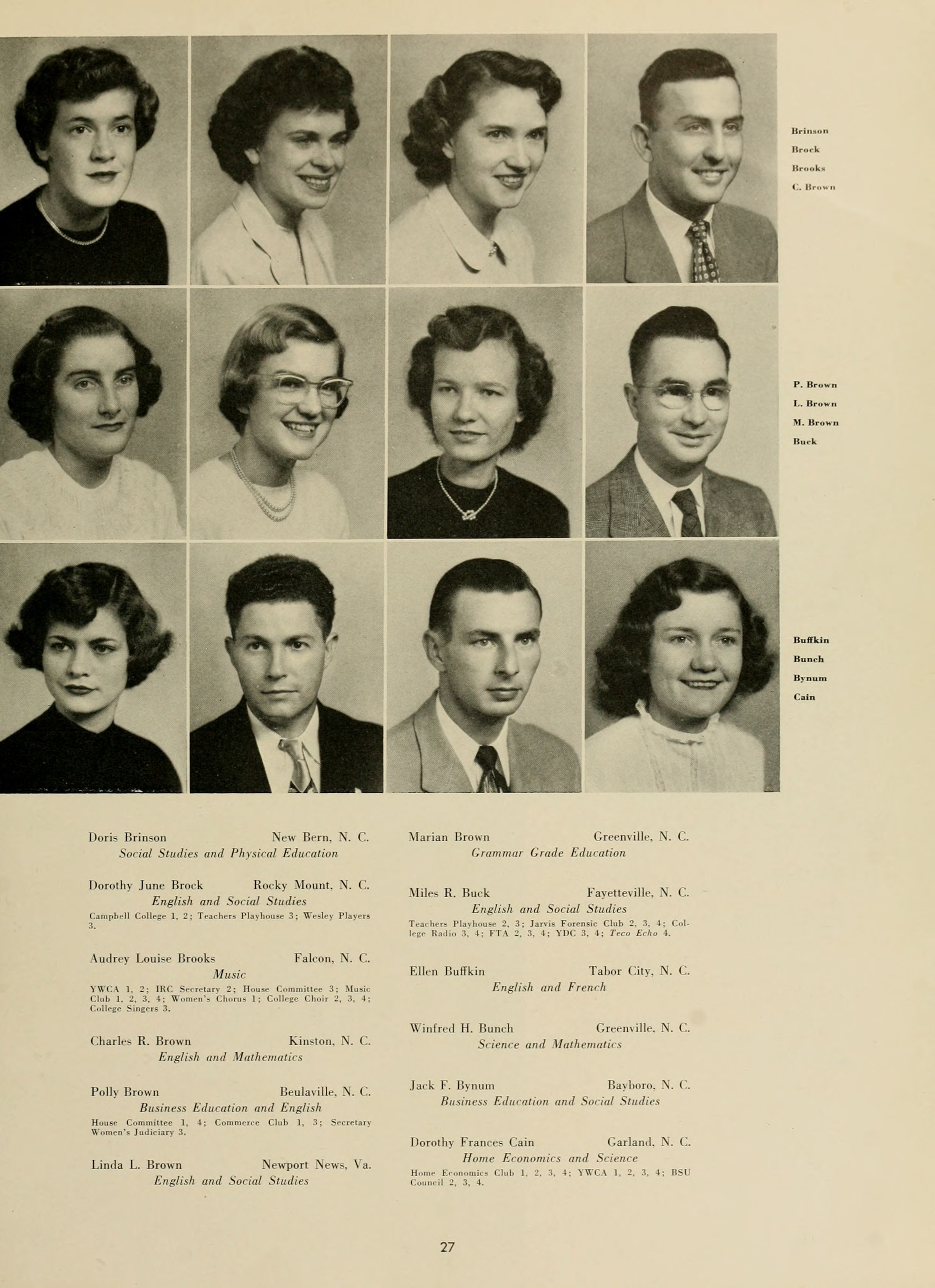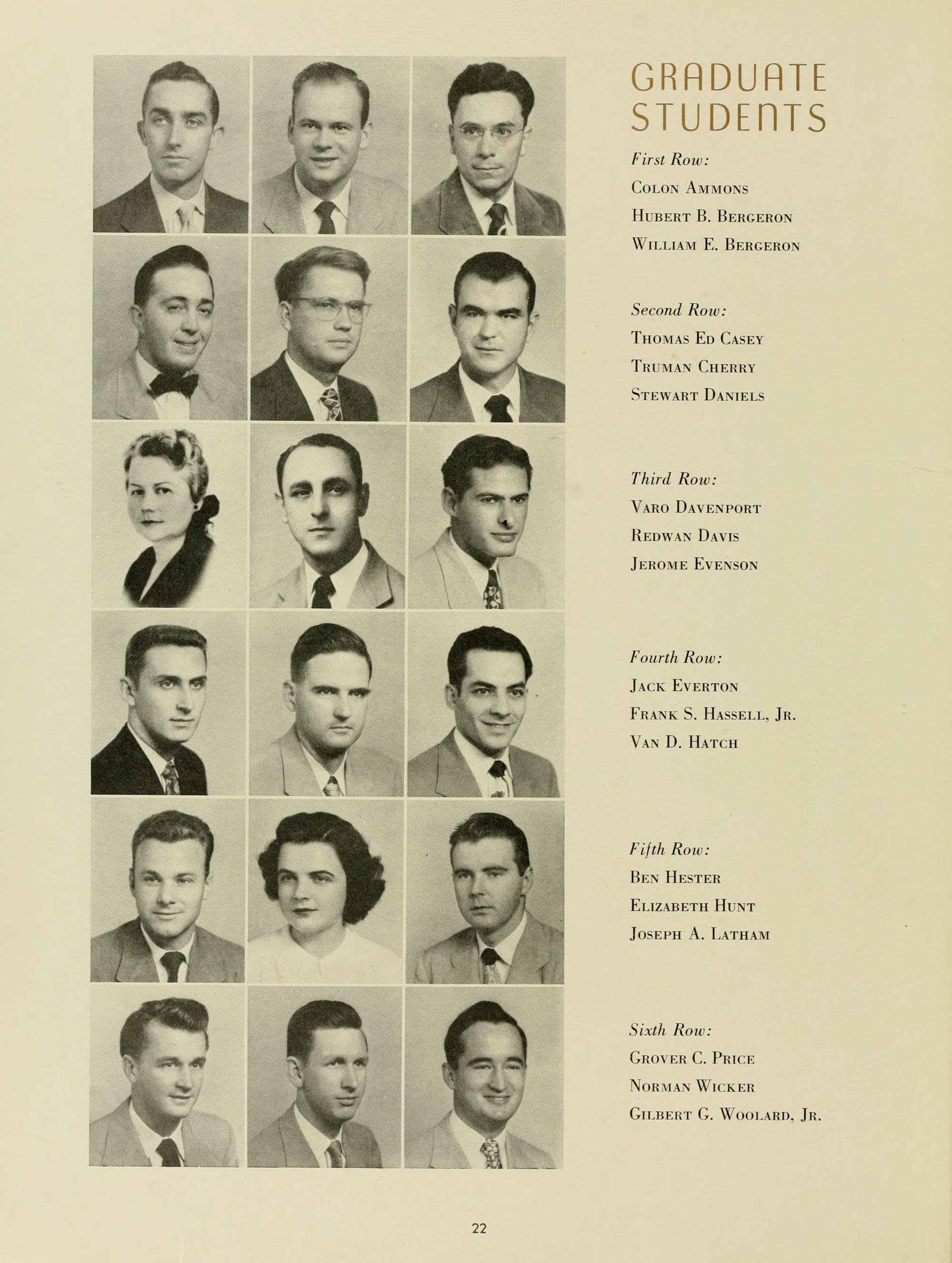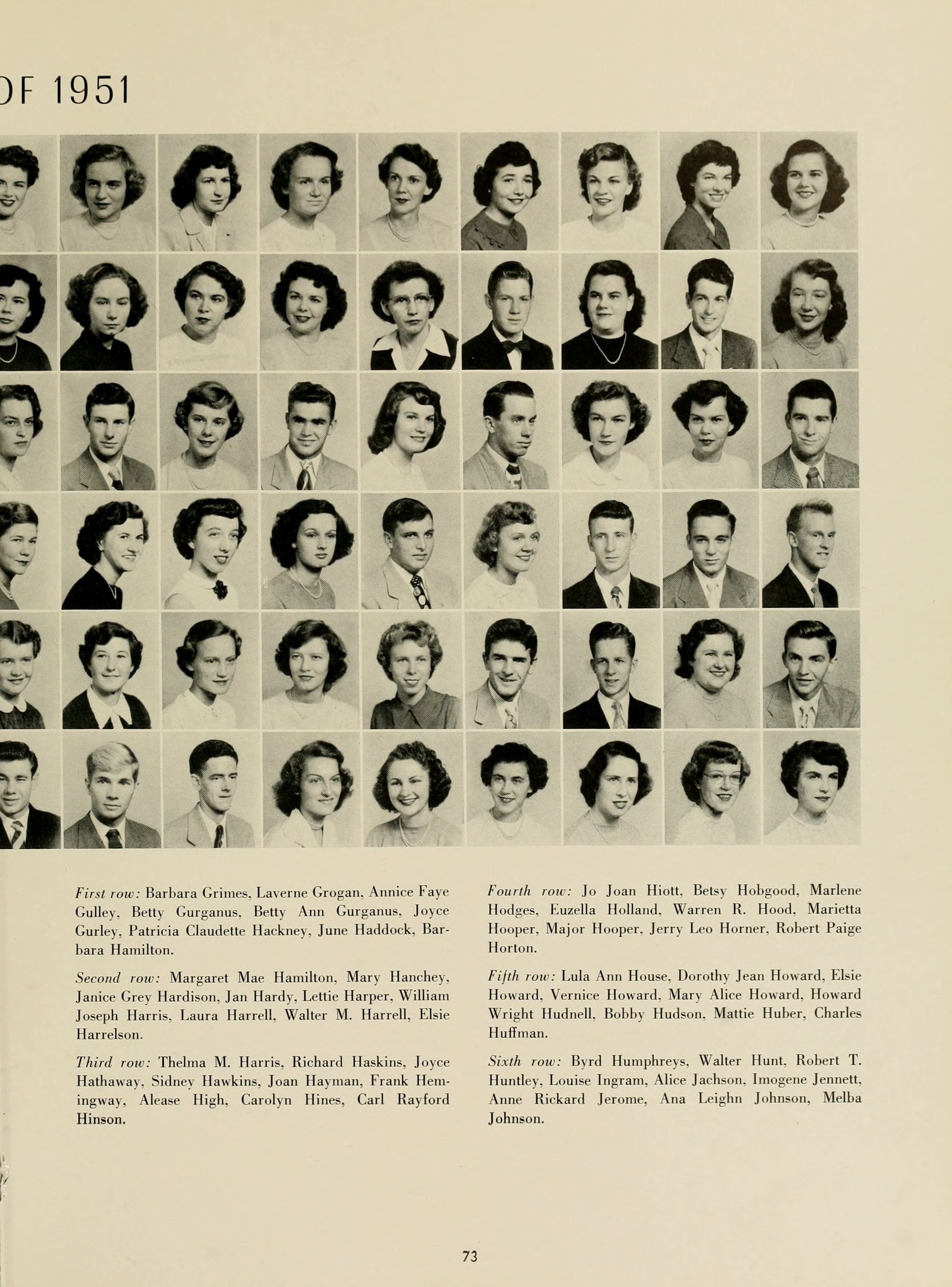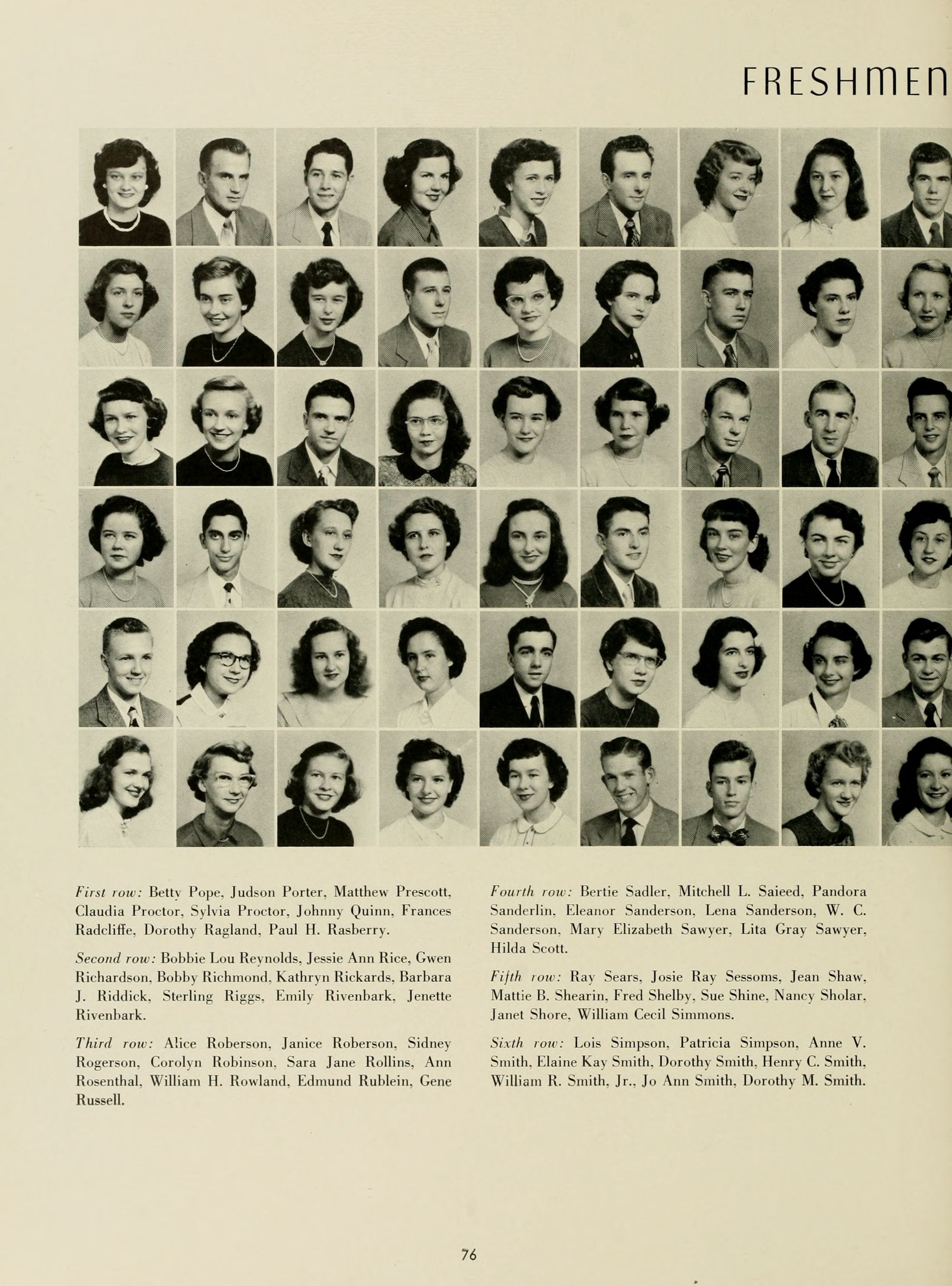 First Row: Mary H. Greene, English; Lois Grigsby, English; Peggy Hampton, Assistant Librarian; Dr. H. C. Haynes, Psychology; R. M. Helms, Science; E. C. Hollar, Social Studies; Robert L. Holt, Director, Religious Activities; Emma L. Hooper, English; W. W. Howell, Business Education.