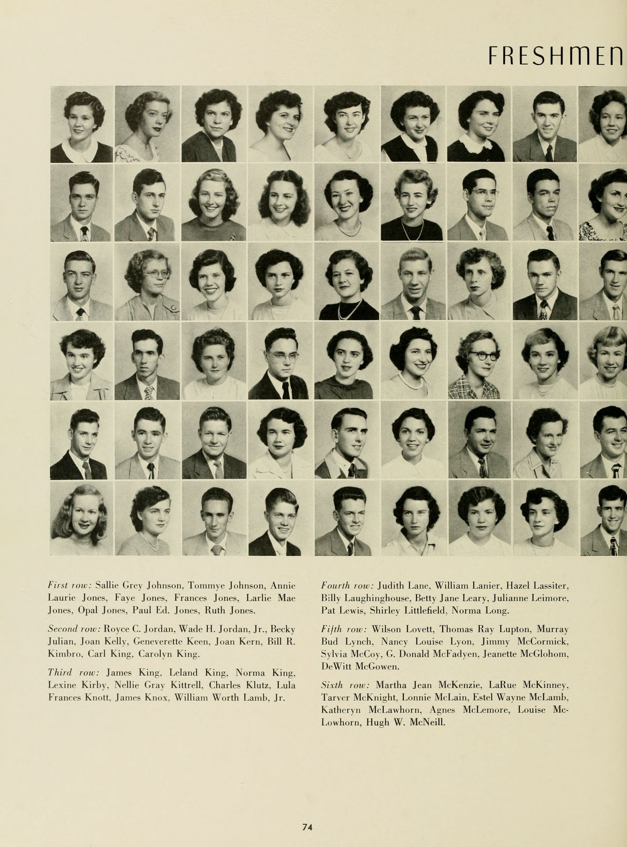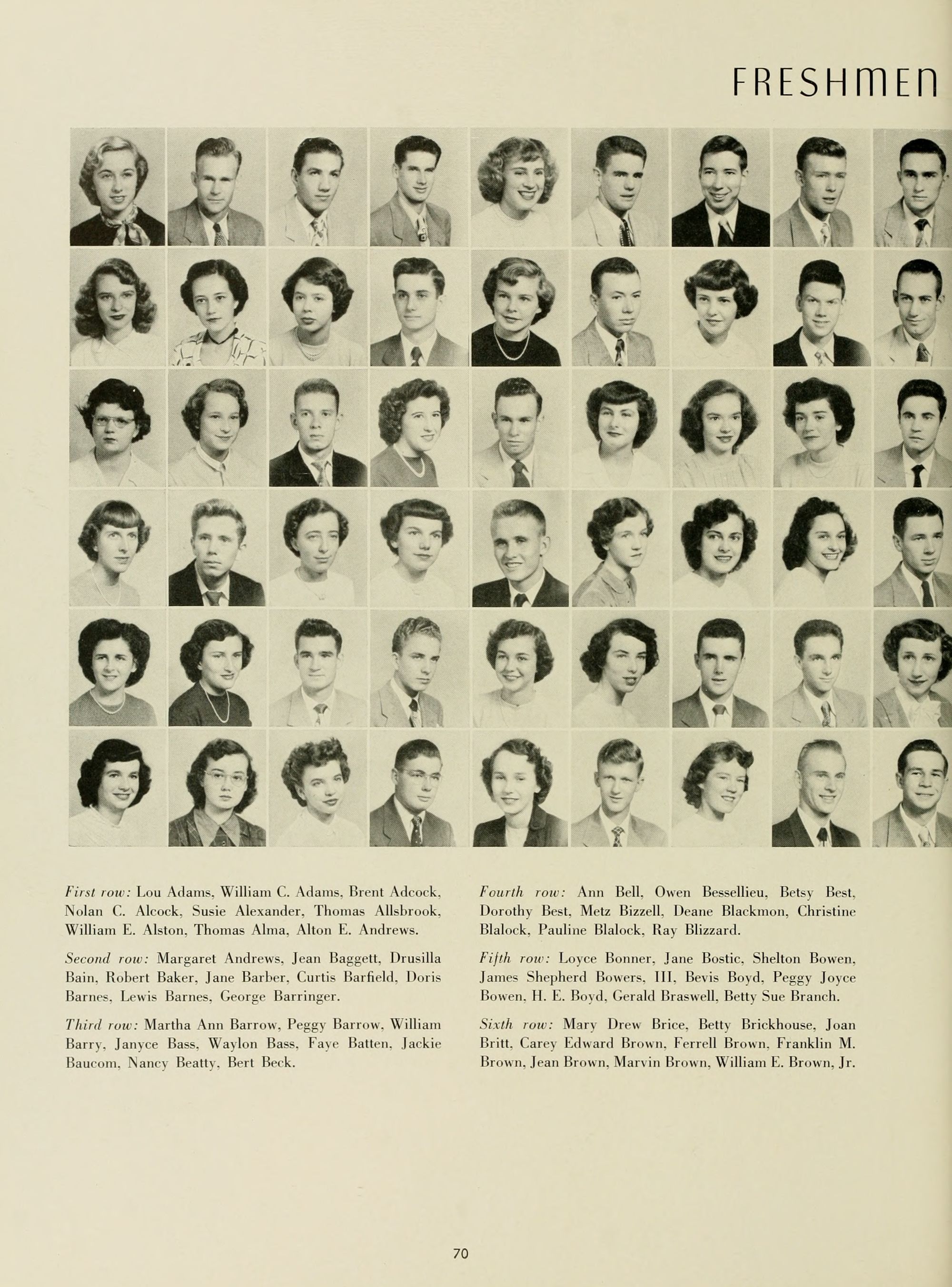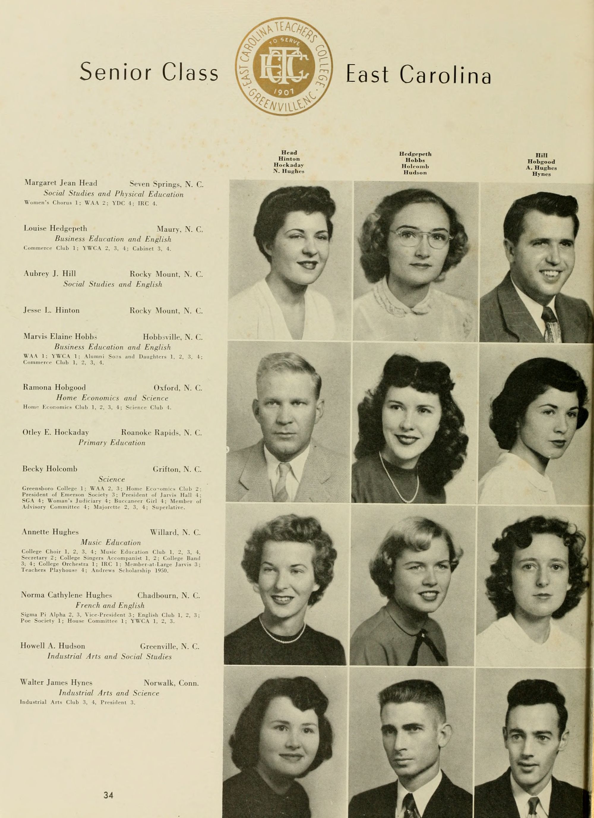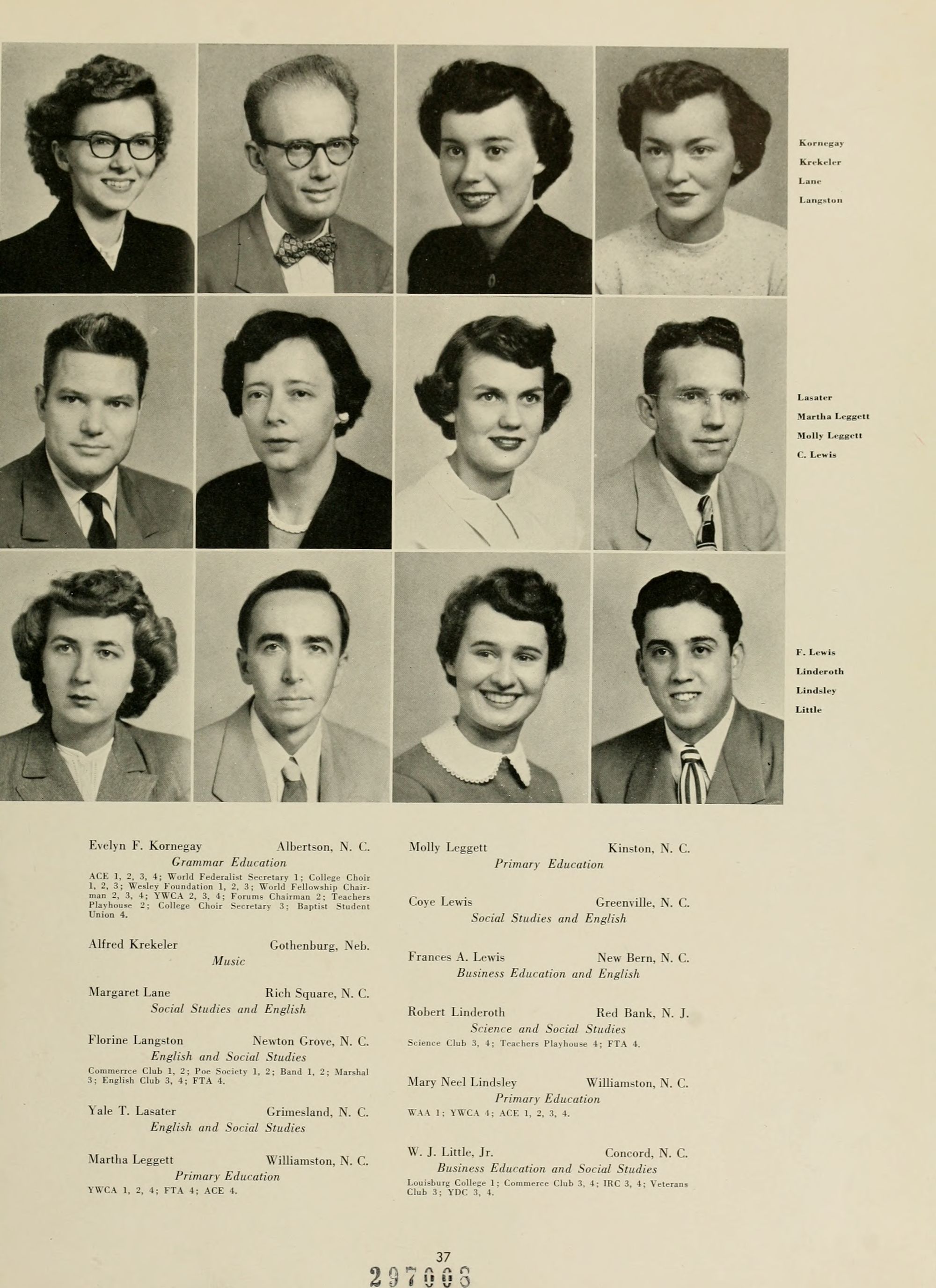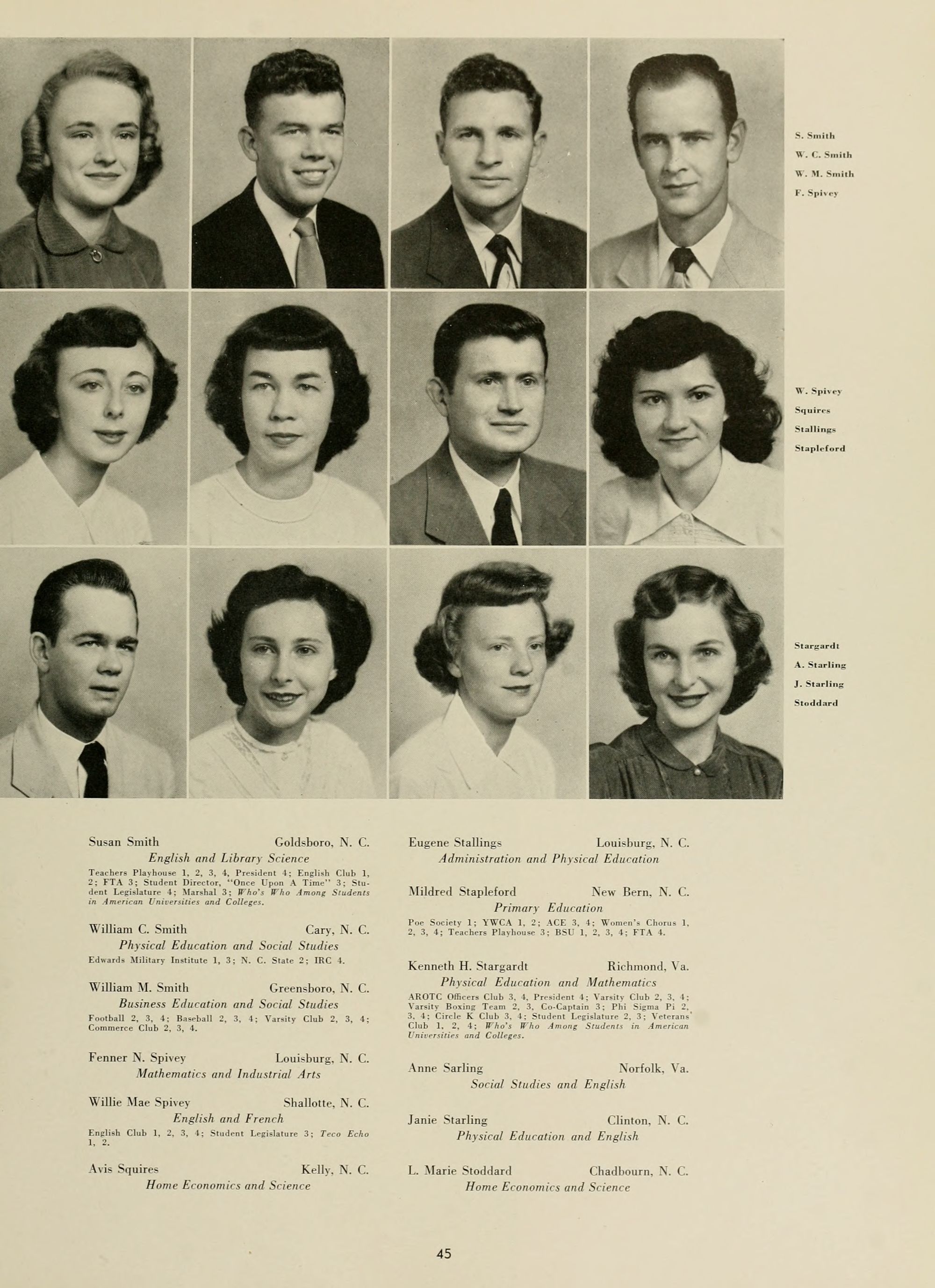 First Row: Mary H. Greene, English; Lois Grigsby, English; Peggy Hampton, Assistant Librarian; Dr. H. C. Haynes, Psychology; R. M. Helms, Science; E. C. Hollar, Social Studies; Robert L. Holt, Director, Religious Activities; Emma L. Hooper, English; W. W. Howell, Business Education.