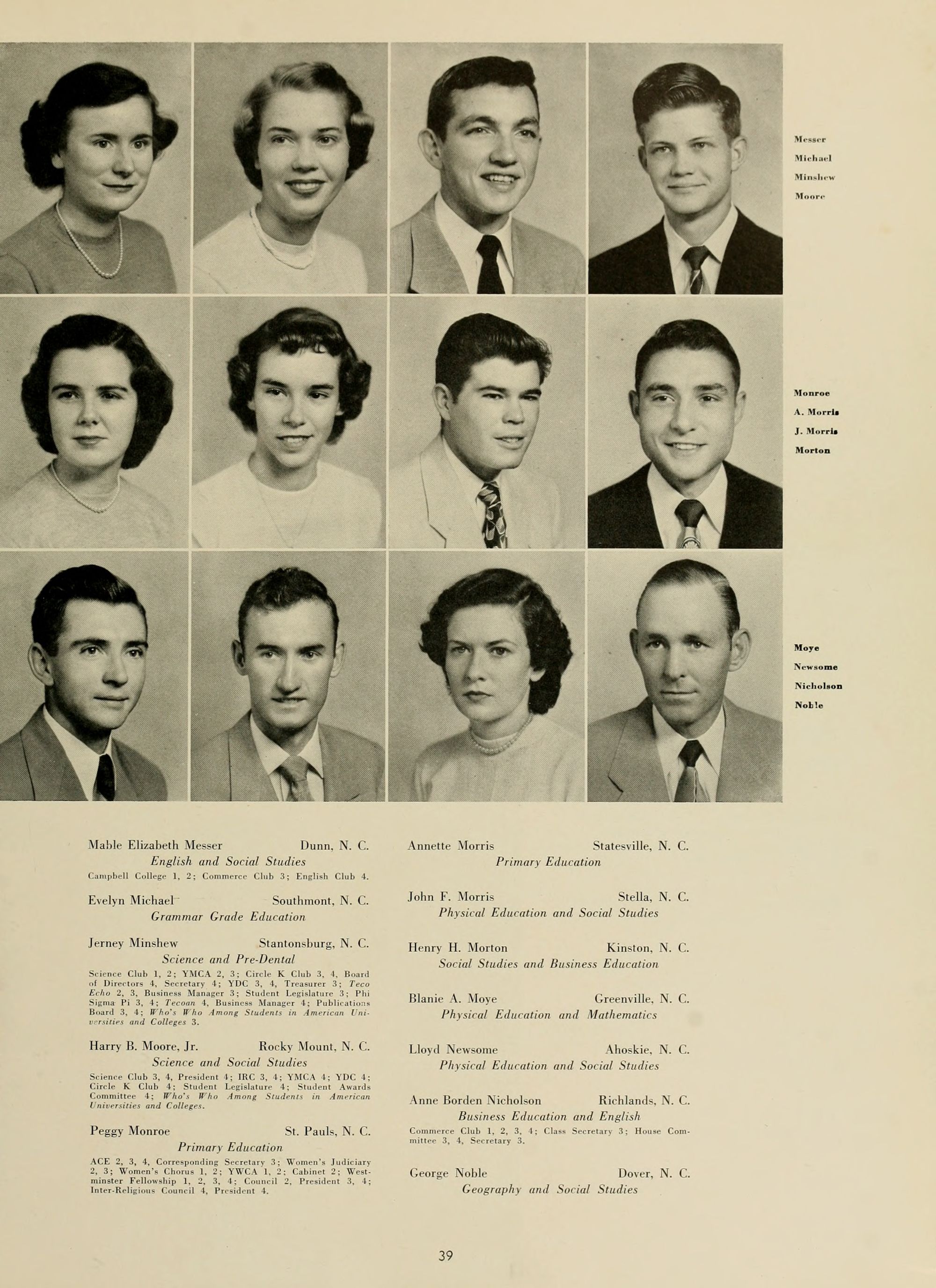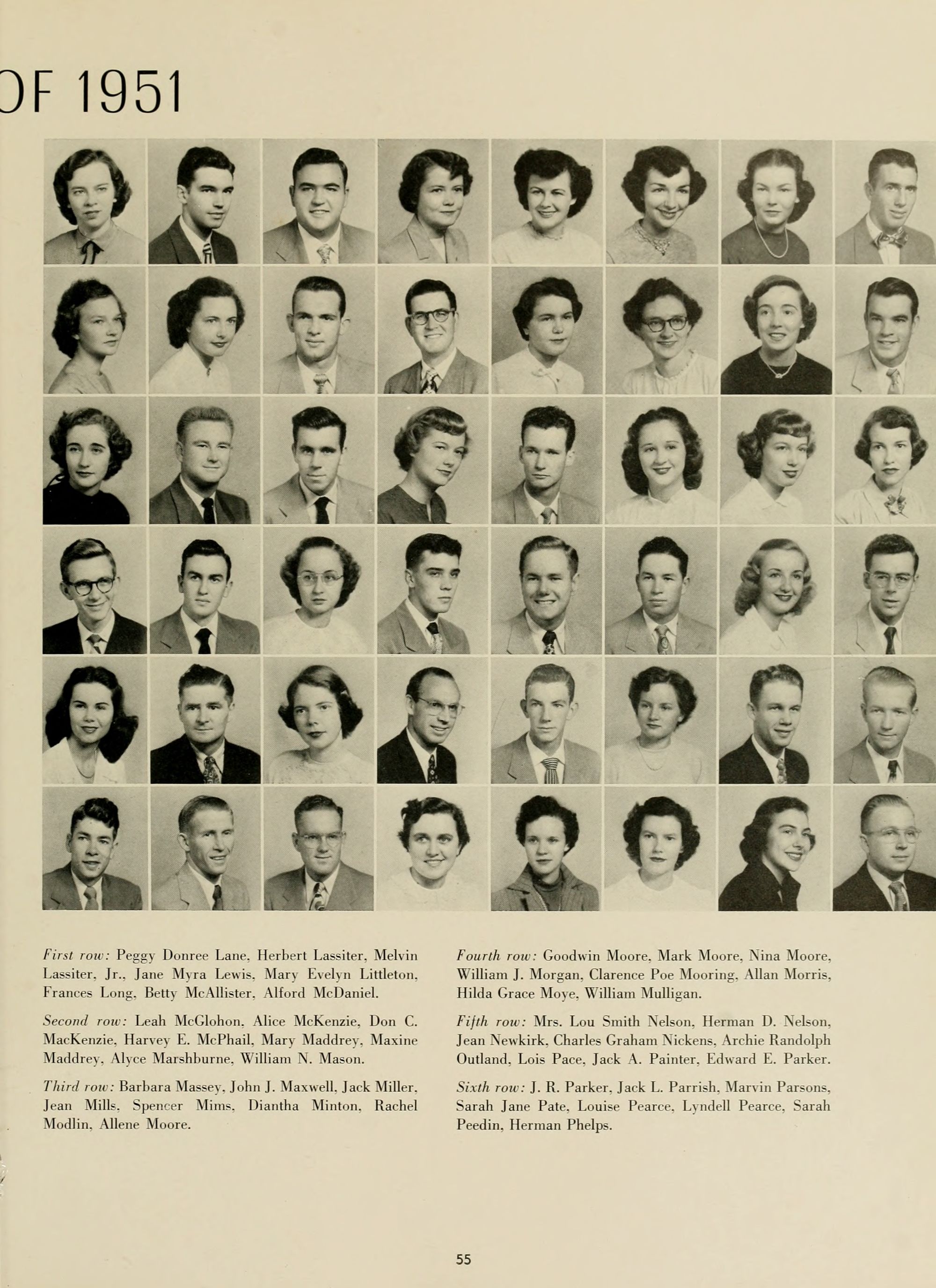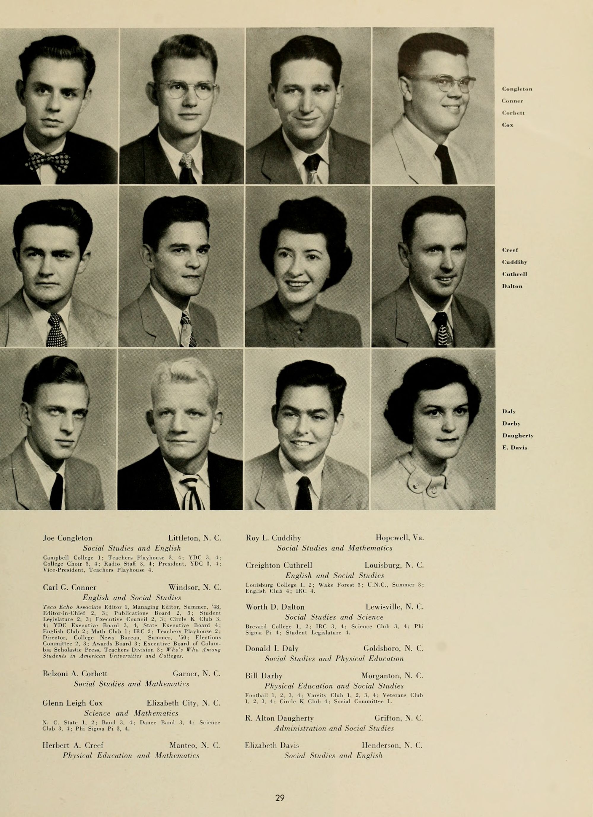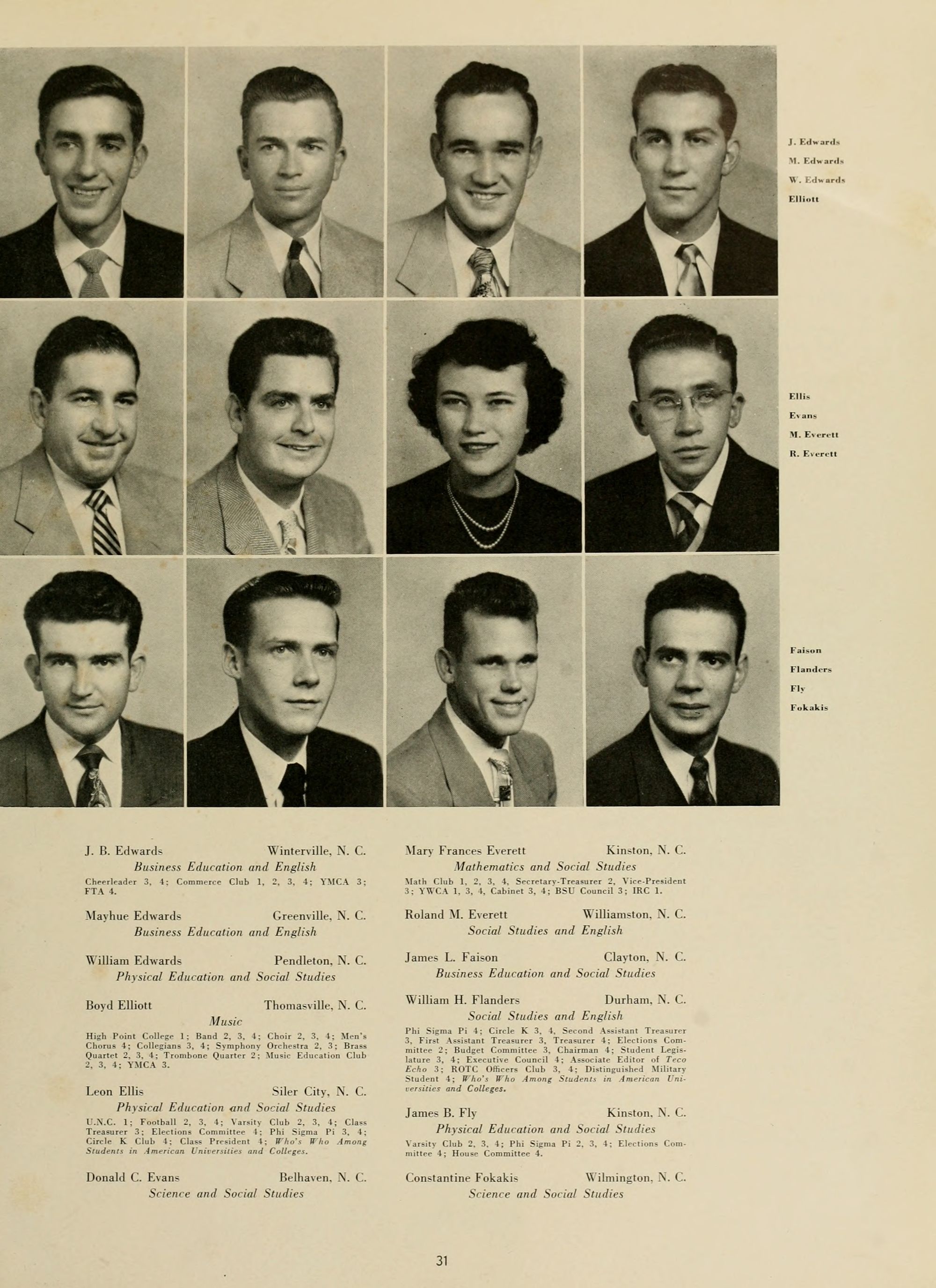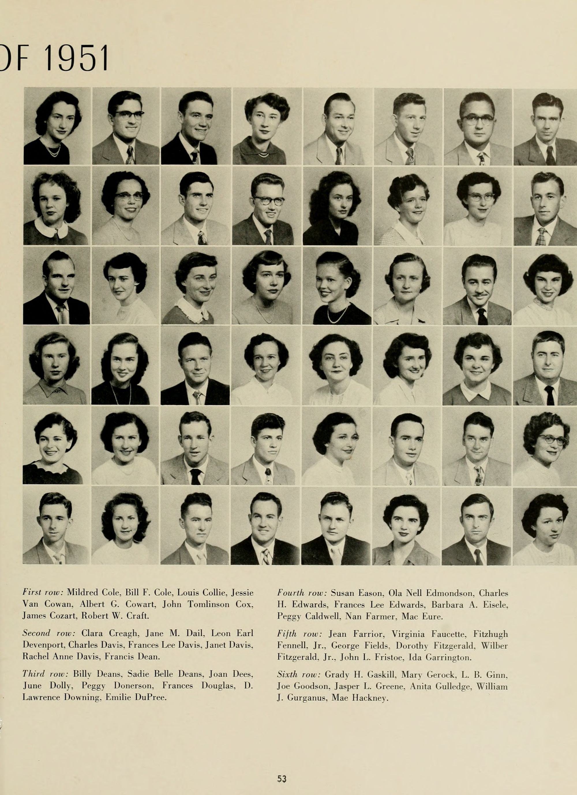 Third Row: Dr. H. A. Coleman, Social Studies; J. B. Cummings, Geography; Dr. Audrey V. Dempsey, Business Education; J. 0. Derrick, Science; Mabel Dougherty, Home Economics; Elizabeth Drake, Music; F. D. Duncan, Business Manager; W. E. Durham, Music; Mrs. Elsie Eagan, Training School.