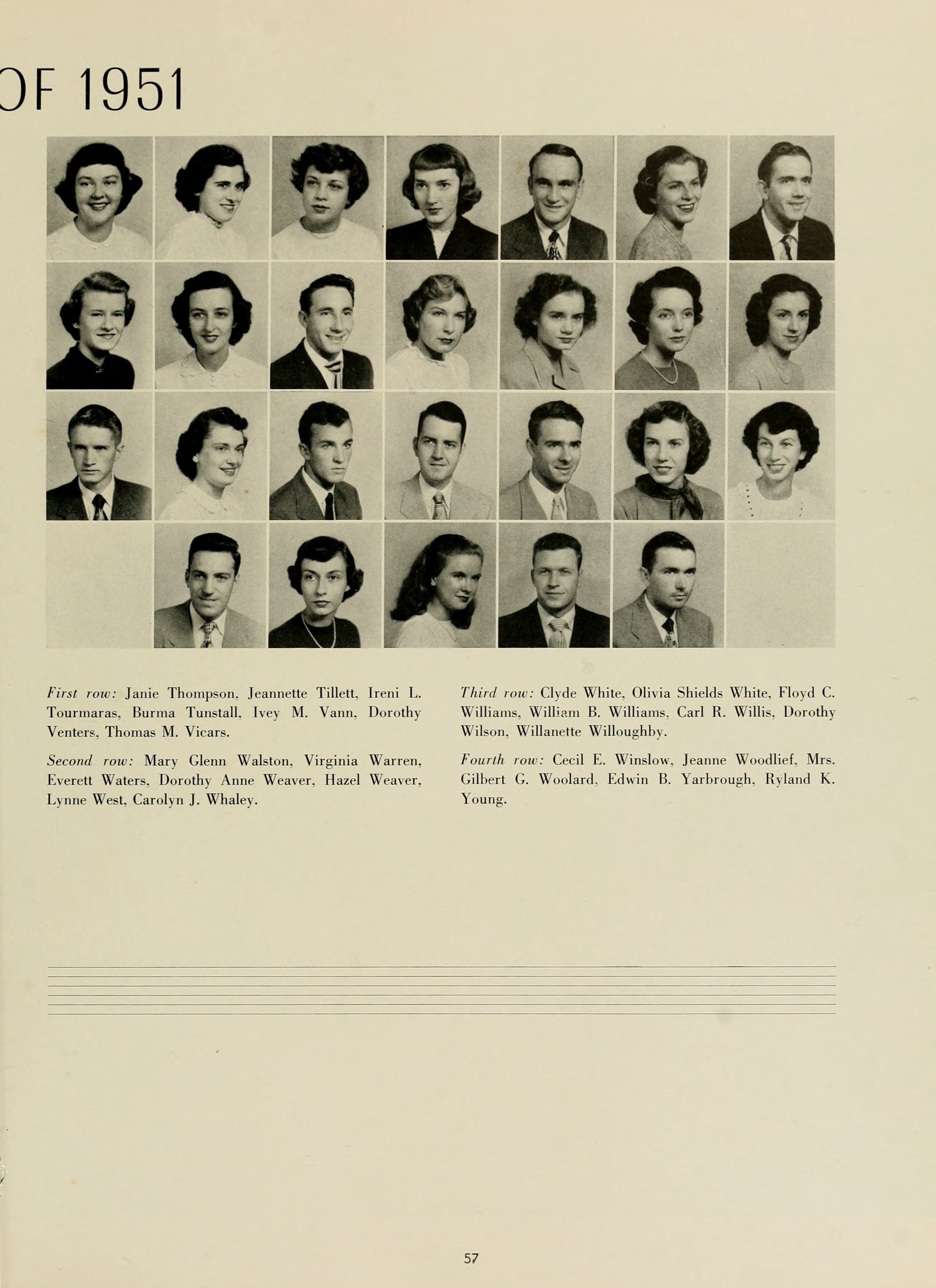 Fourth Row: Elizabeth Walker, Library Science; Mrs. Susie Webb, Secretary, Alumni Office; James L. White, Business Education: Louise Williams, Mathematics: Dr. Rudolph Willman, Music; Dr. Christine Wilton, Science.
