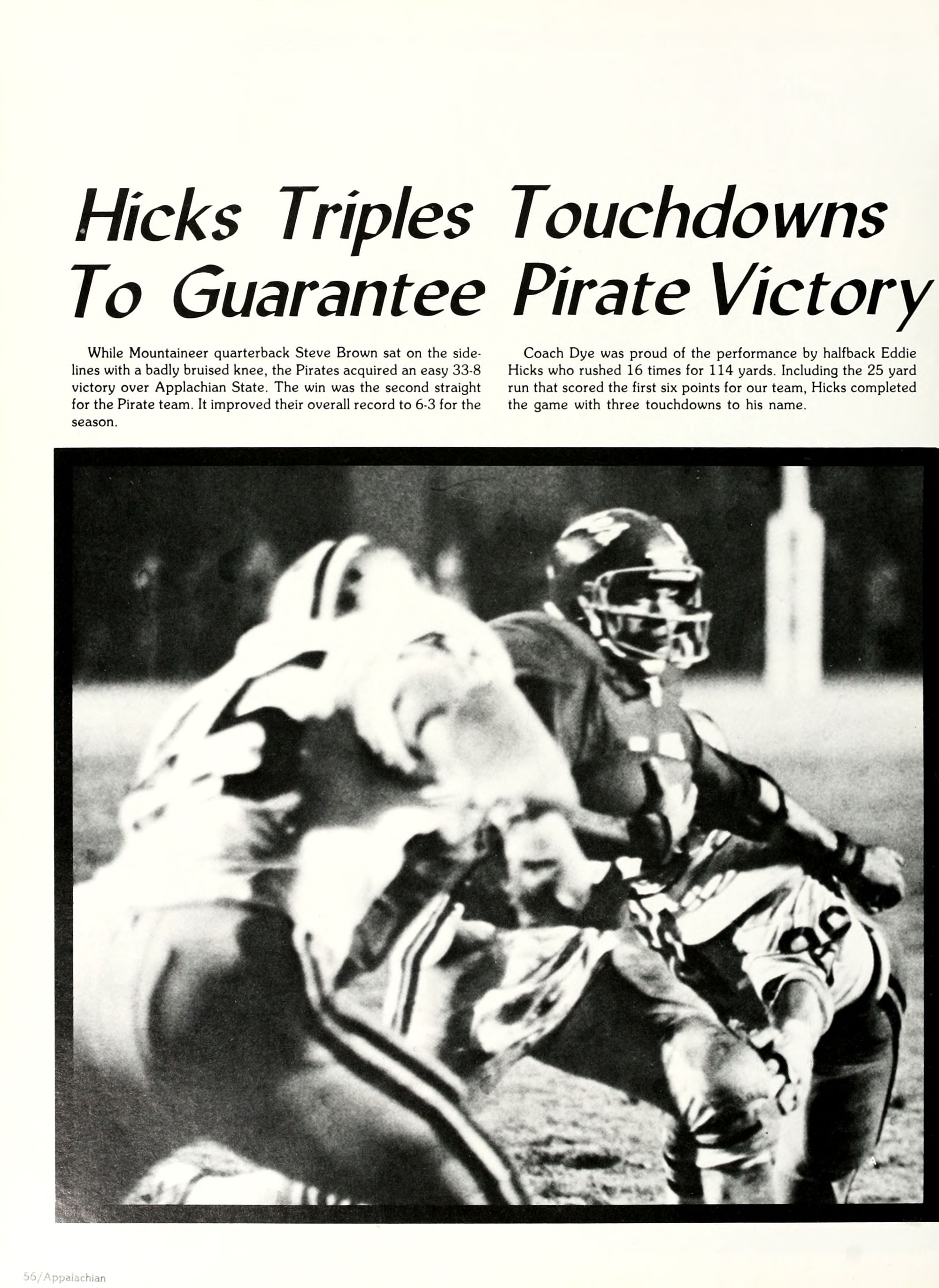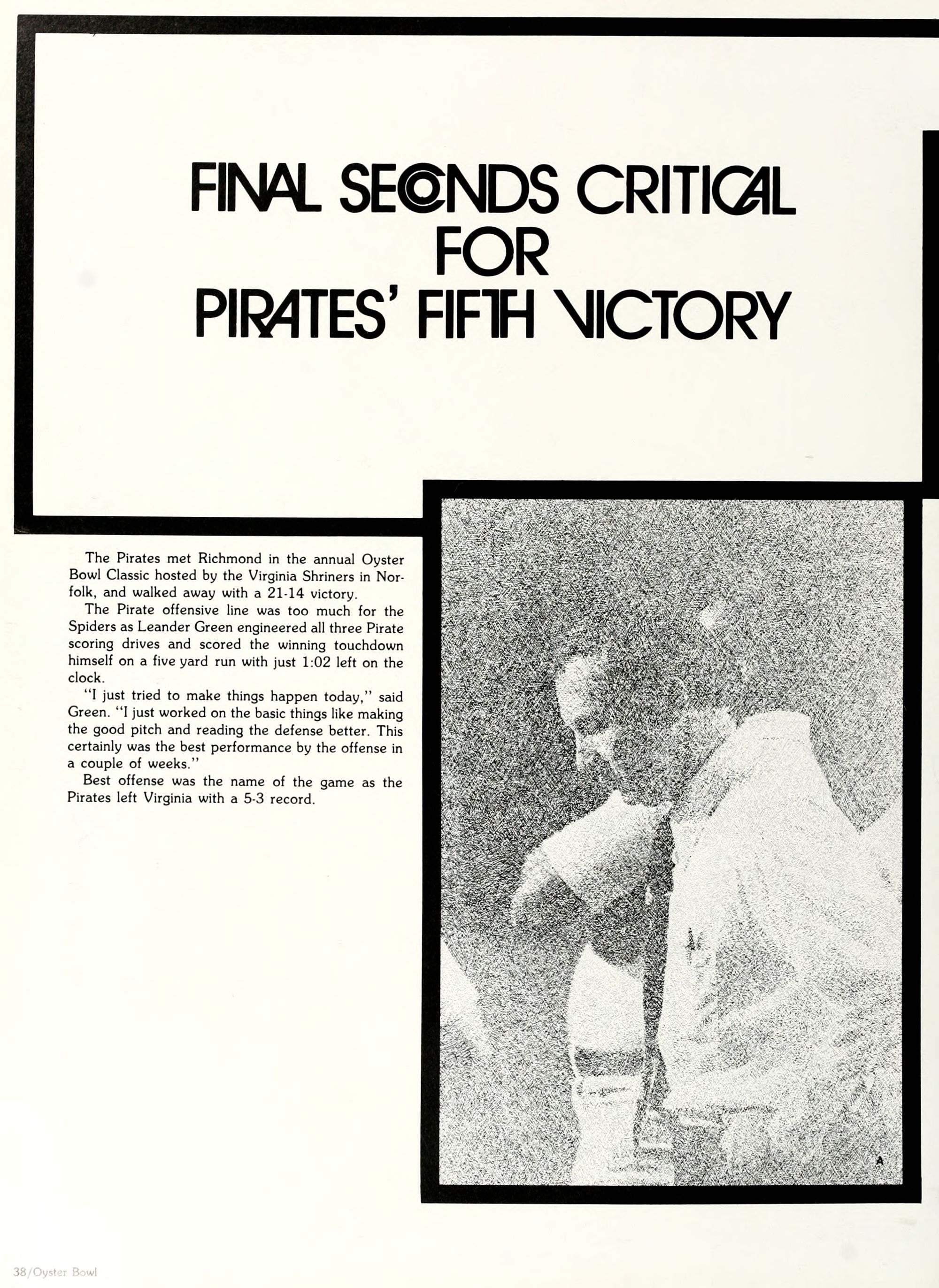 Cover: Ficklen Stadium is expanded to seat 35,000. Pirates defeat Western Carolina 14-6 in dedication game. Ficklen is now the 3rd largest stadium in NC.