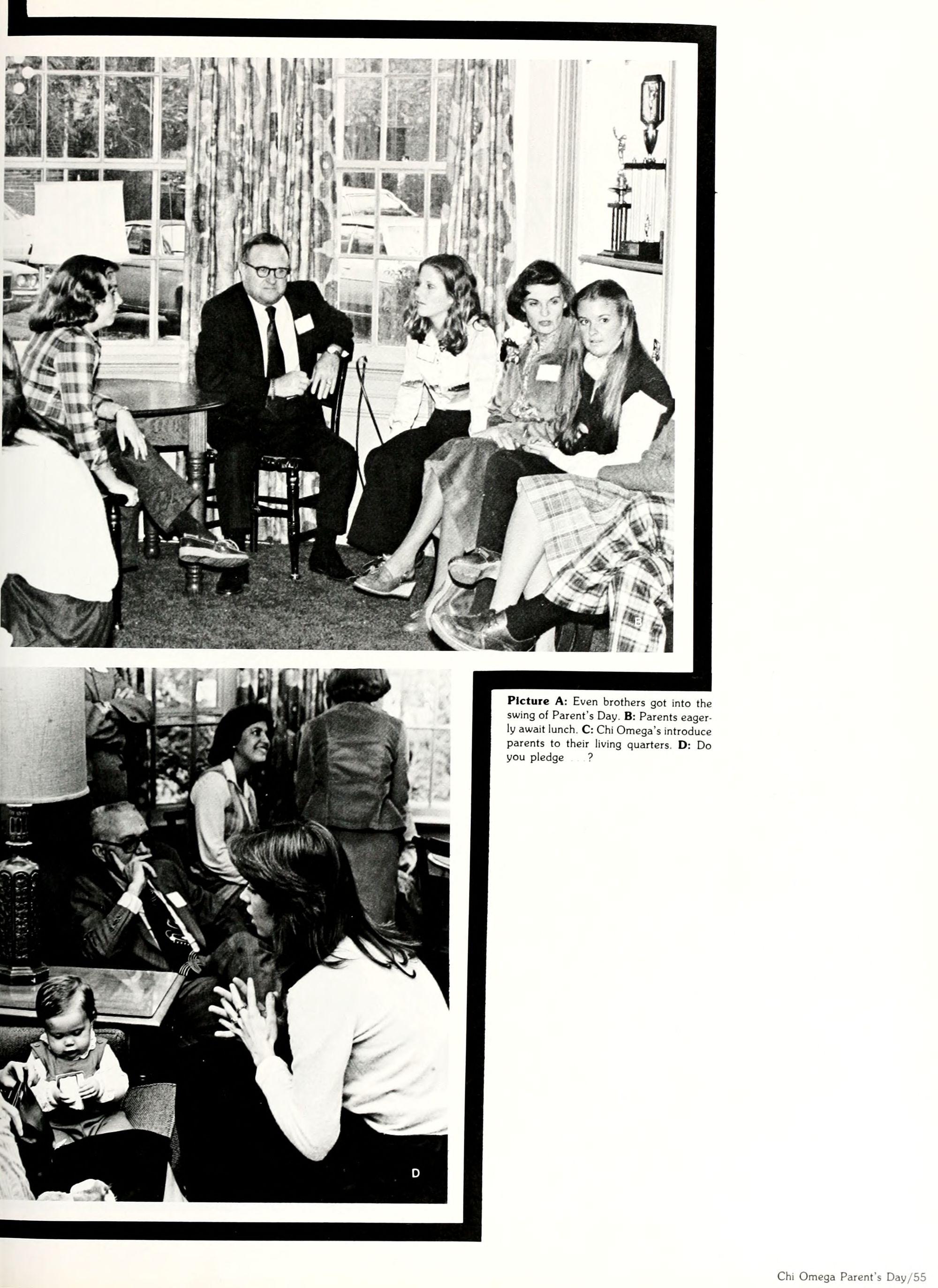 Picture A: A service provided by the SGA, rental refrigerators were a valuable addition to many dorm rooms. B: Carrying assorted parcels, two students struggle to climb the stairs. C: A smiling co-ed comes prepared for the chilly winter mornings to come.