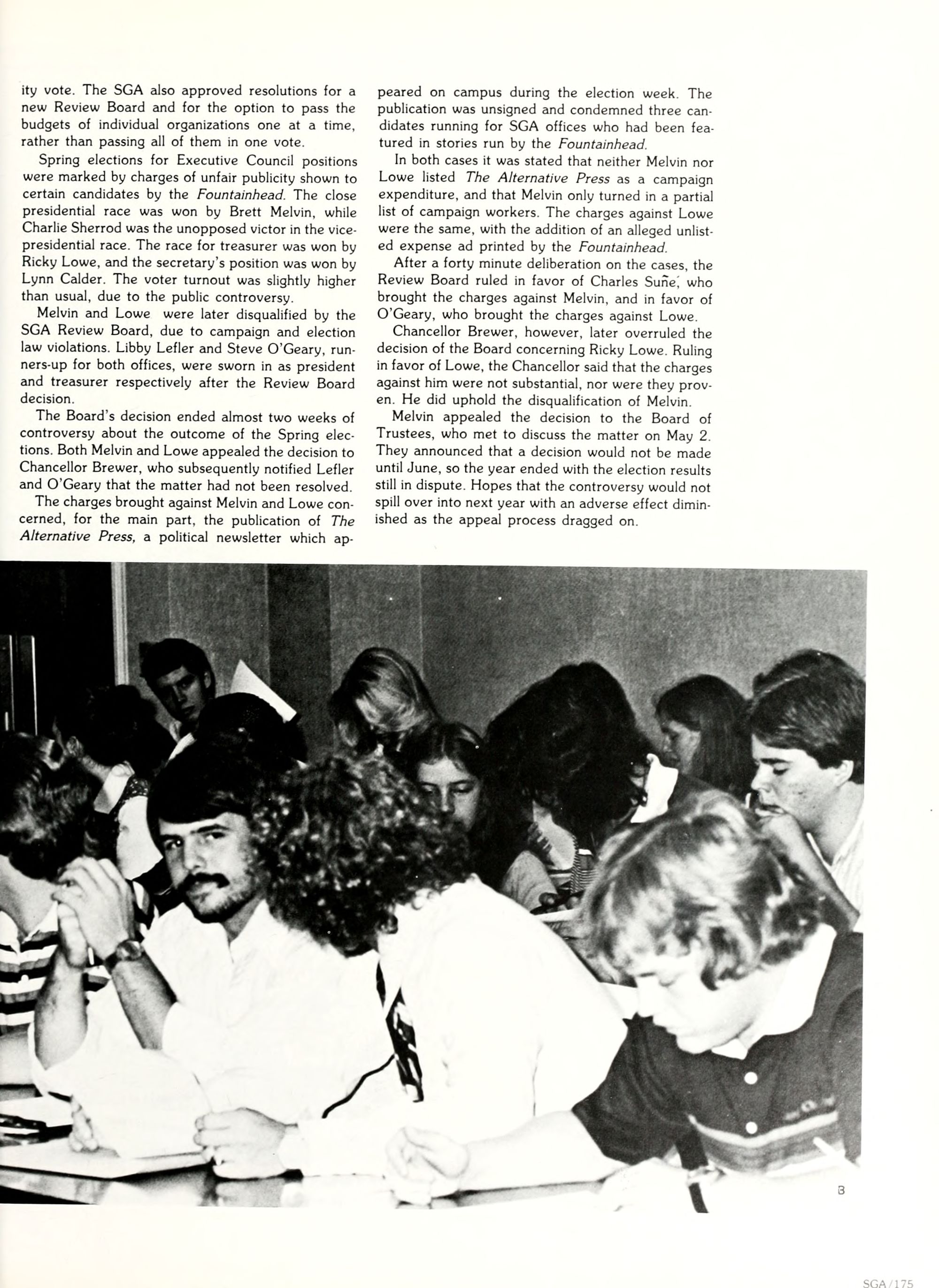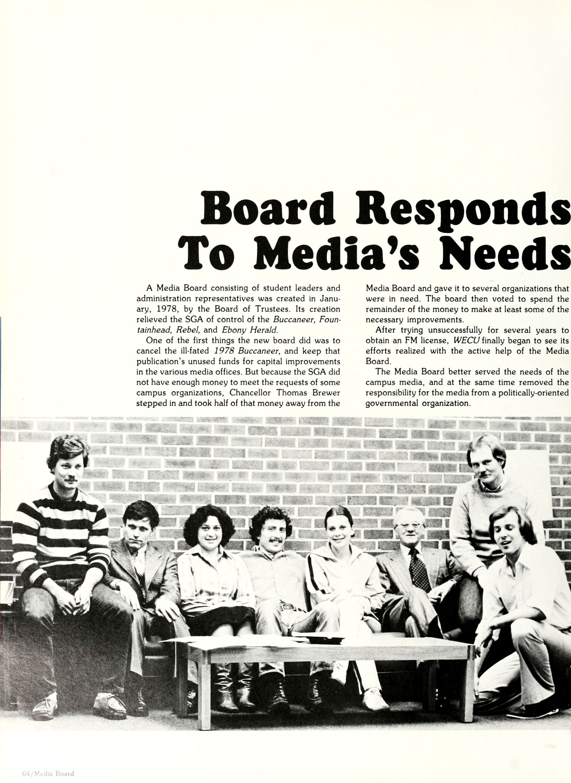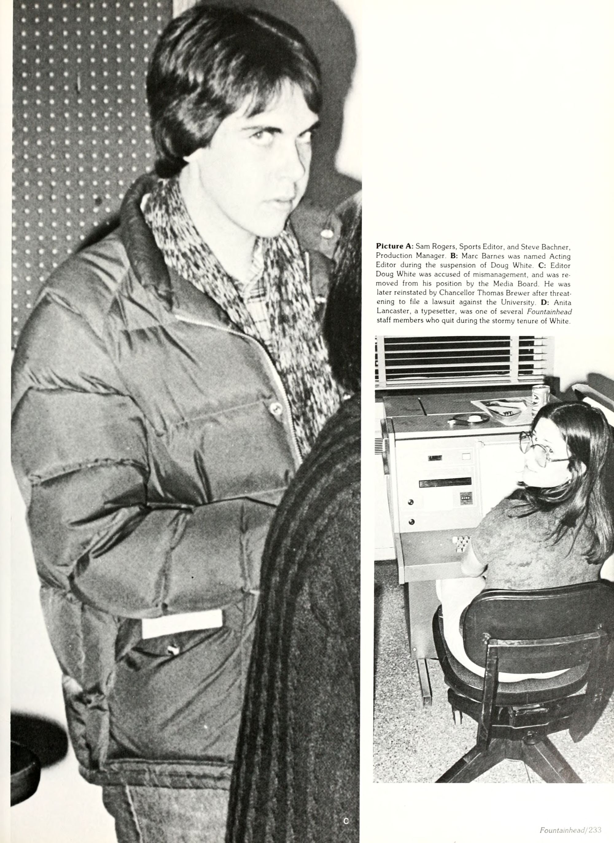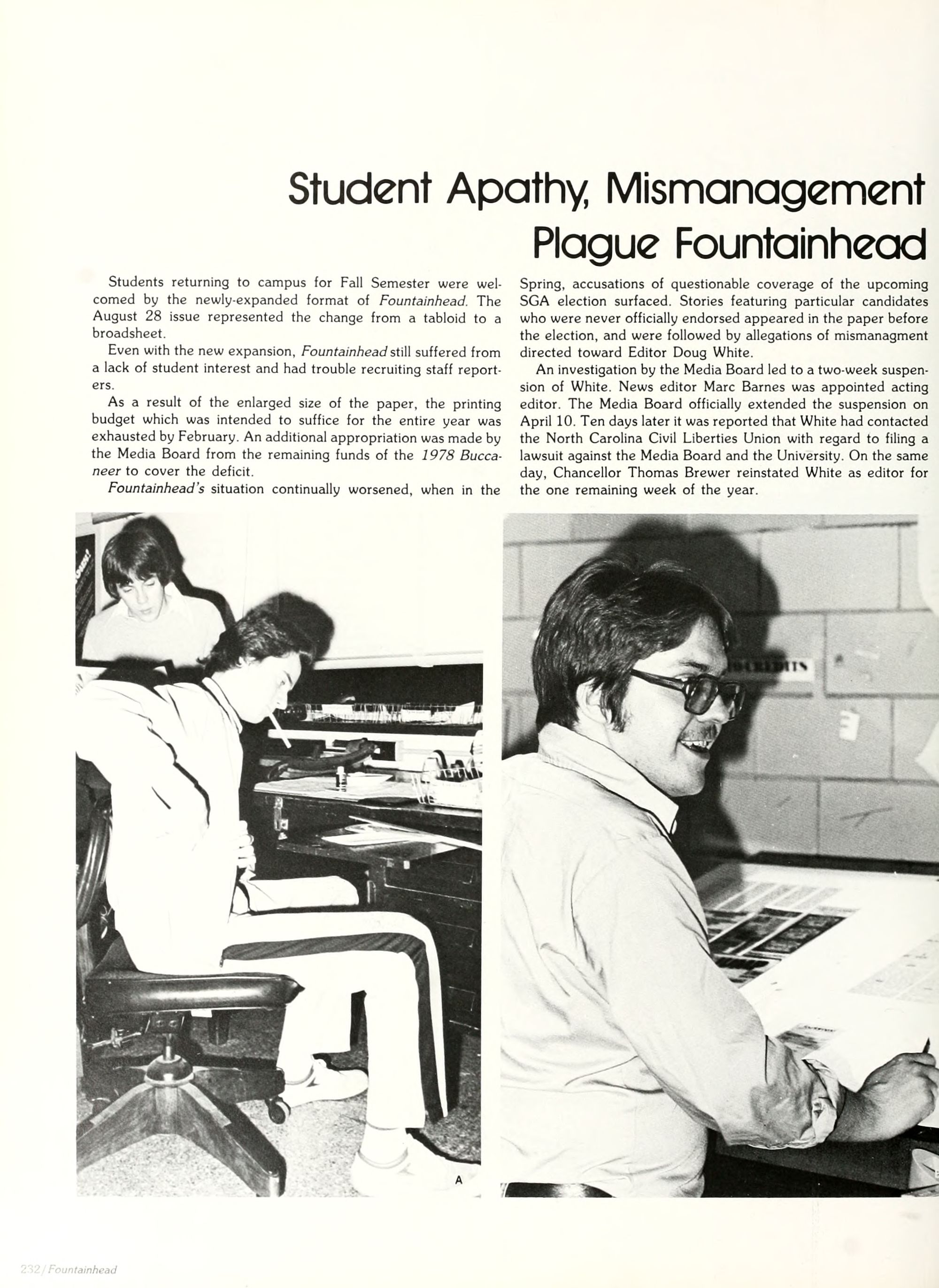 The next year saw the same second editor attempting to pick up the pieces and get a yearbook out. The facts behind this second failure are much harder to understand and accept than those of the first. No one realized a problem existed until the beginning of Fall Semester 1978. Suddenly, a Fountainhead story claimed that the yearbook was in serious trouble for the second year in a row. The story claimed that nothing had been done for a year - no plans were made, no pictures were taken, and the staff was never told what to do. Amidst promises by the editor that the book would be finished, the student body waited. November 1978 came, and with no progress made, the Media Board cancelled the publication of the book.