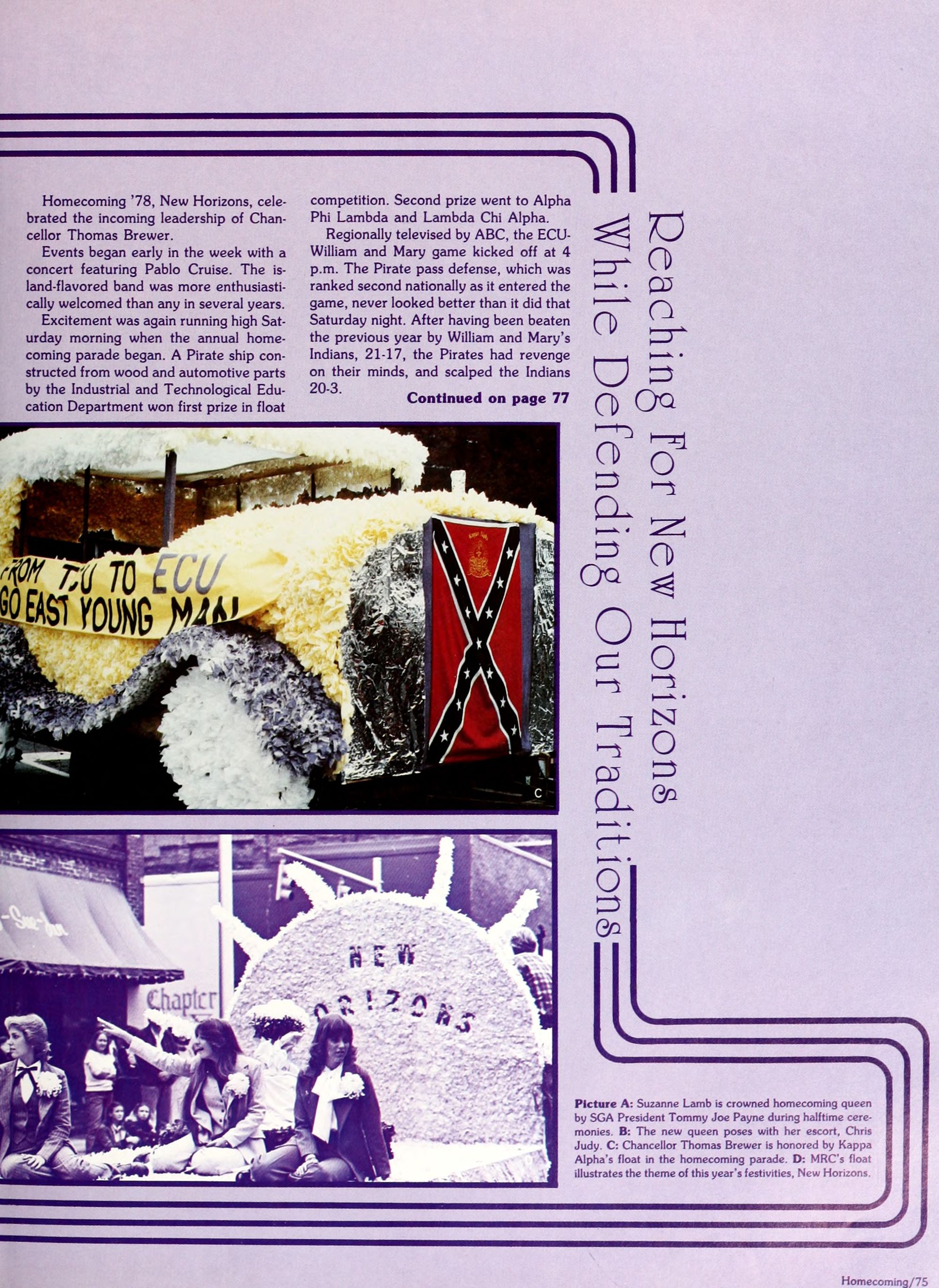It is no secret that this is the first volume of the Buccaneer to be published in three years. That is not the only thing that makes this volume of the Buc special and unique. This volume contains more color pages and more special effects than any yearbook ever published at East Carolina. It covers the year in a way new to this university - a magazine-style format. By covering the events of the 1978-79 year chronologically, this volume presents a clearer perspective of the times.