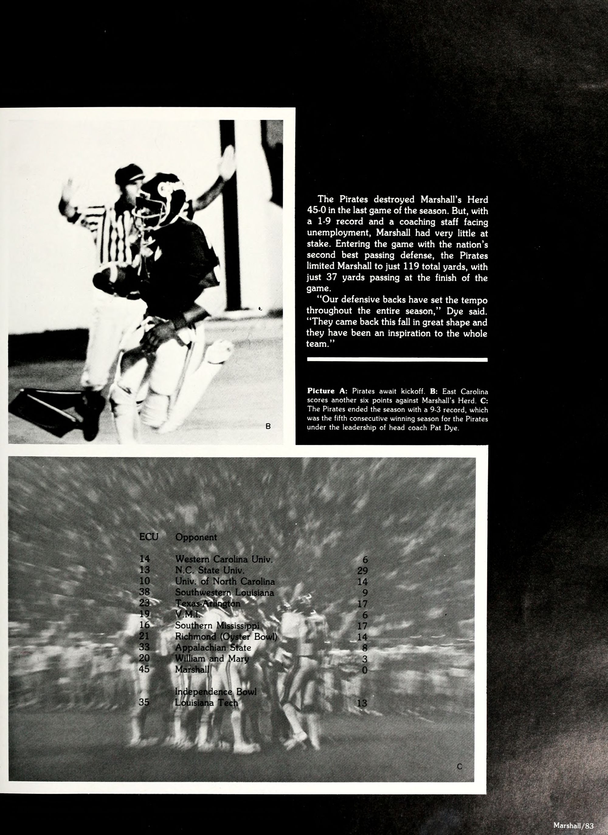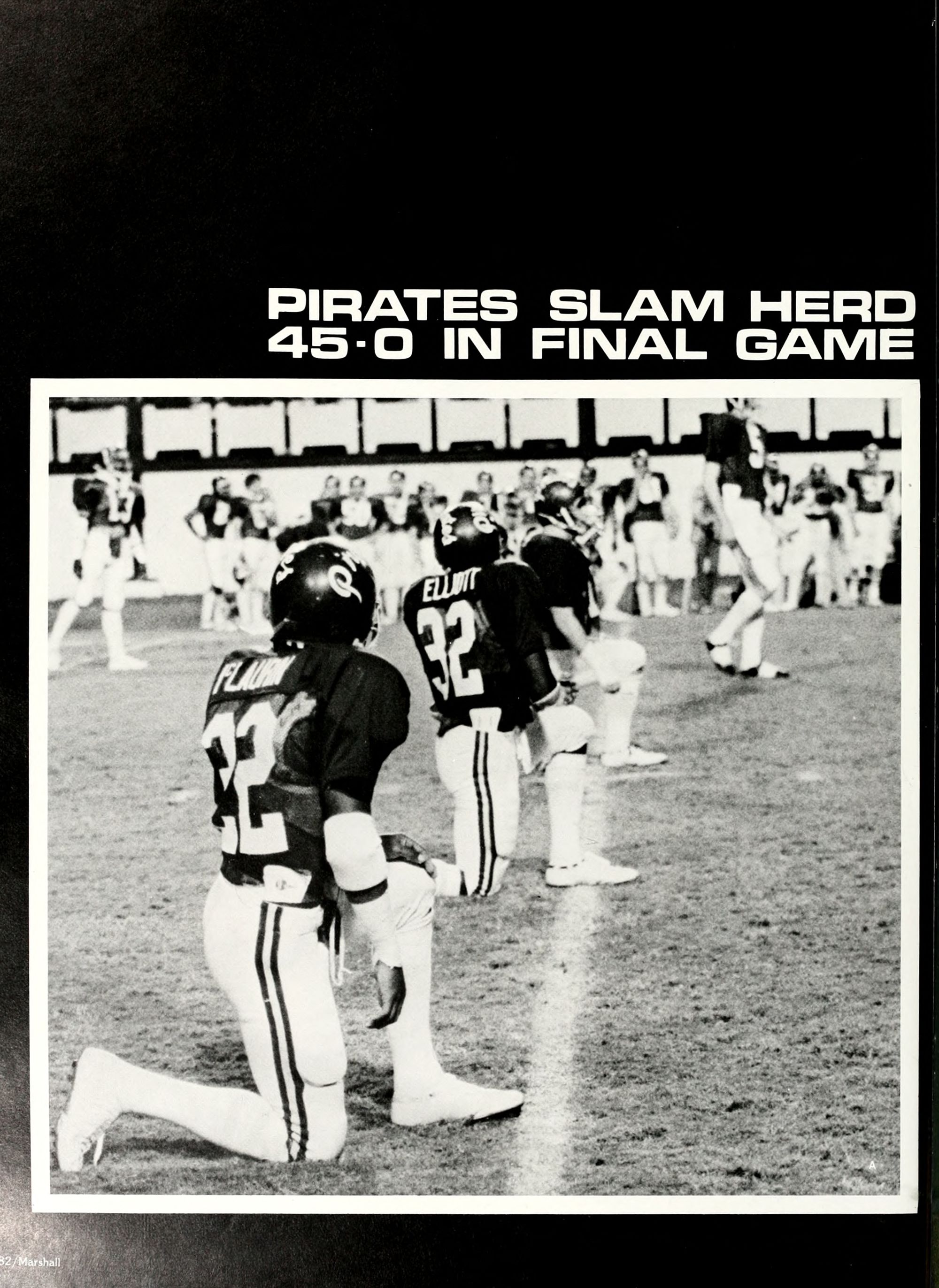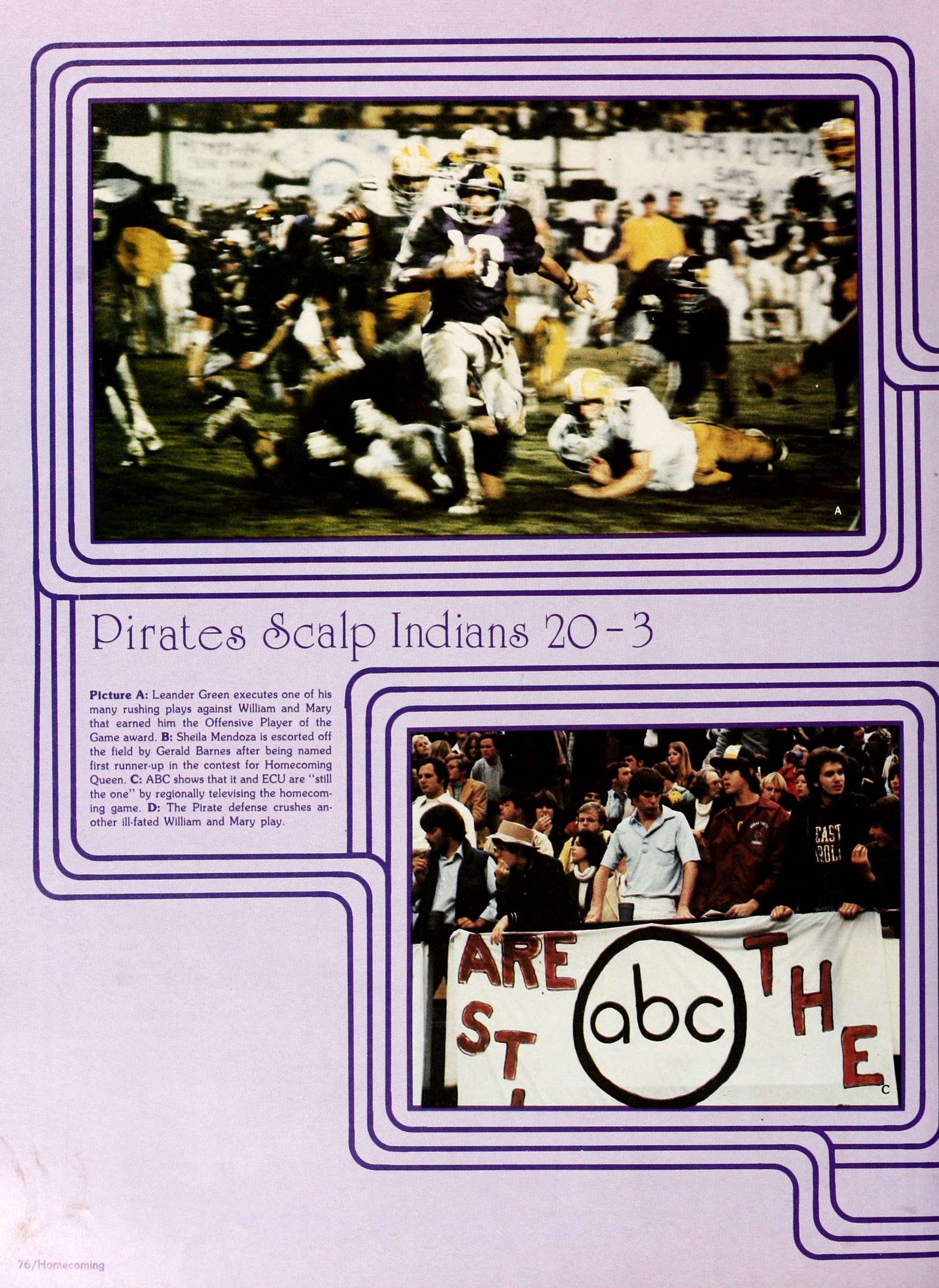 The Pirates christened their new stadium with a lackluster win over WCU, 14 to 6. A lack of offensive concentration and a total of seven turnovers in the second half led Head Coach Pat Dye to characterize the Buc's performance as "a comedy of errors."
