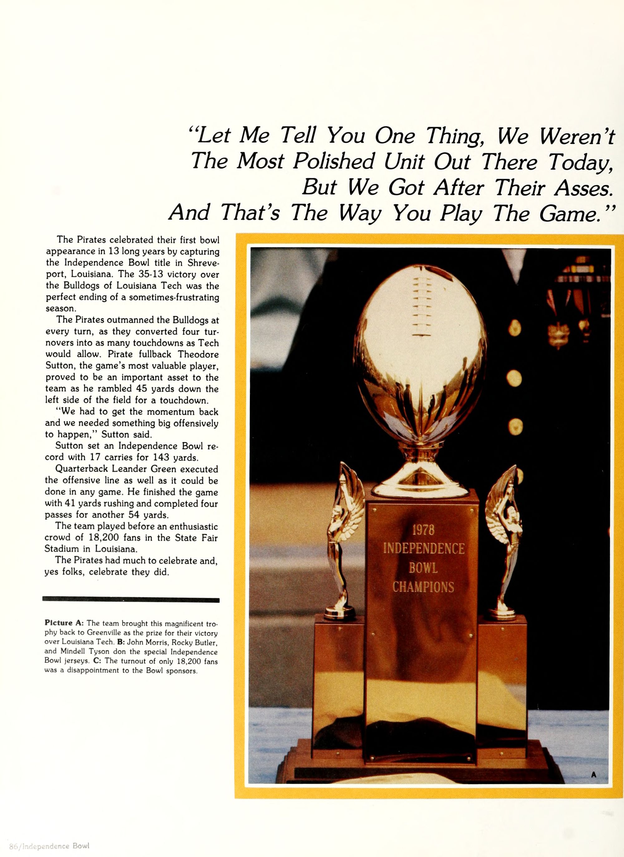 ECU makes its 1st bowl appearance in 15 years, and defeats Louisiana Tech 35-13, in 3rd Independence Bowl.
