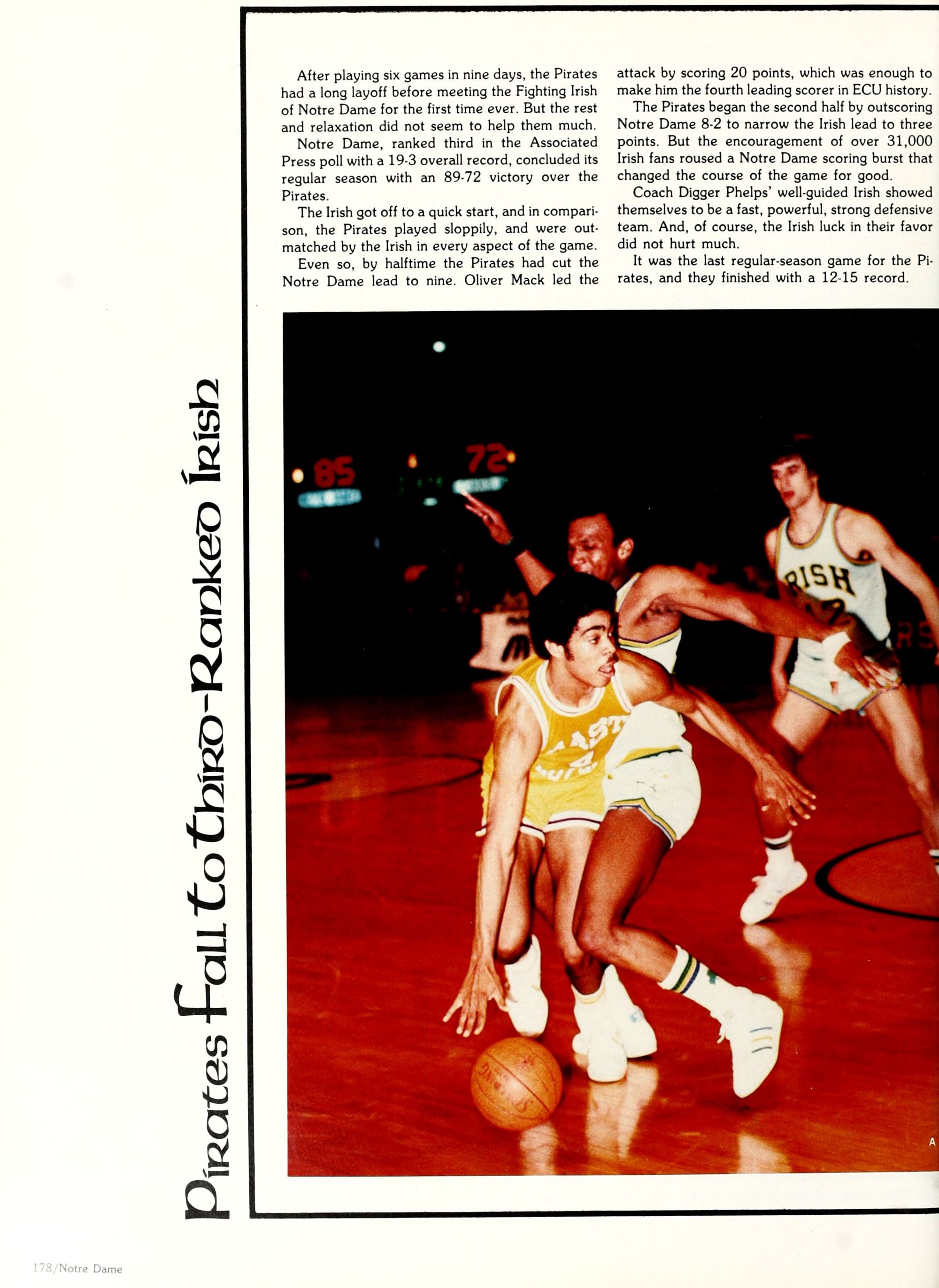 Pirates fall to Notre Dame 89-72, in last regular-season game played at South Bend, Indiana.