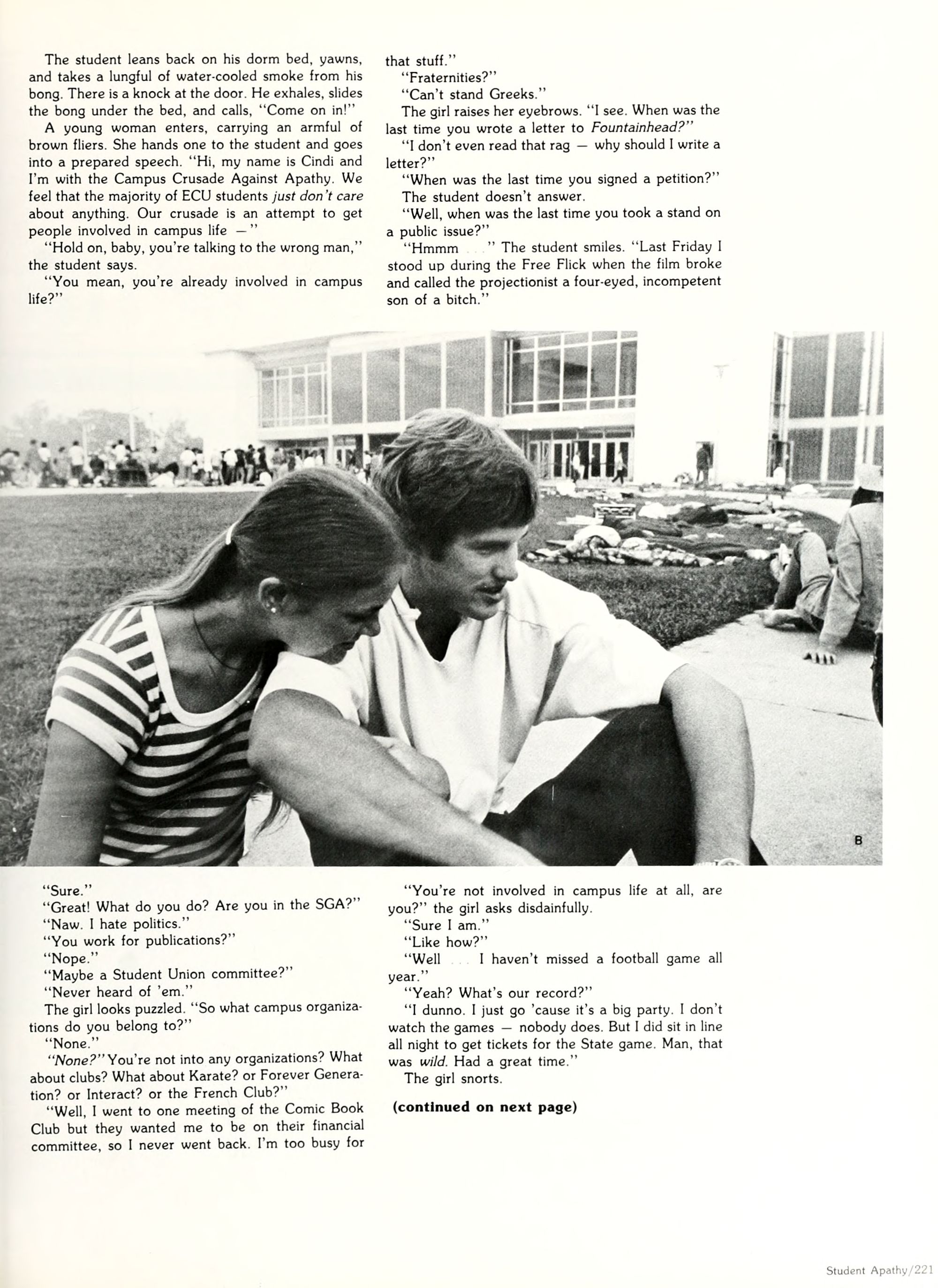 No judgments will be made here. But there is one comment that must be stated - it could have been avoided if more people had taken the time to care. Apathy has plagued this campus for several years. It is sad that no one was willing to put forth enough effort to insure a yearbook.