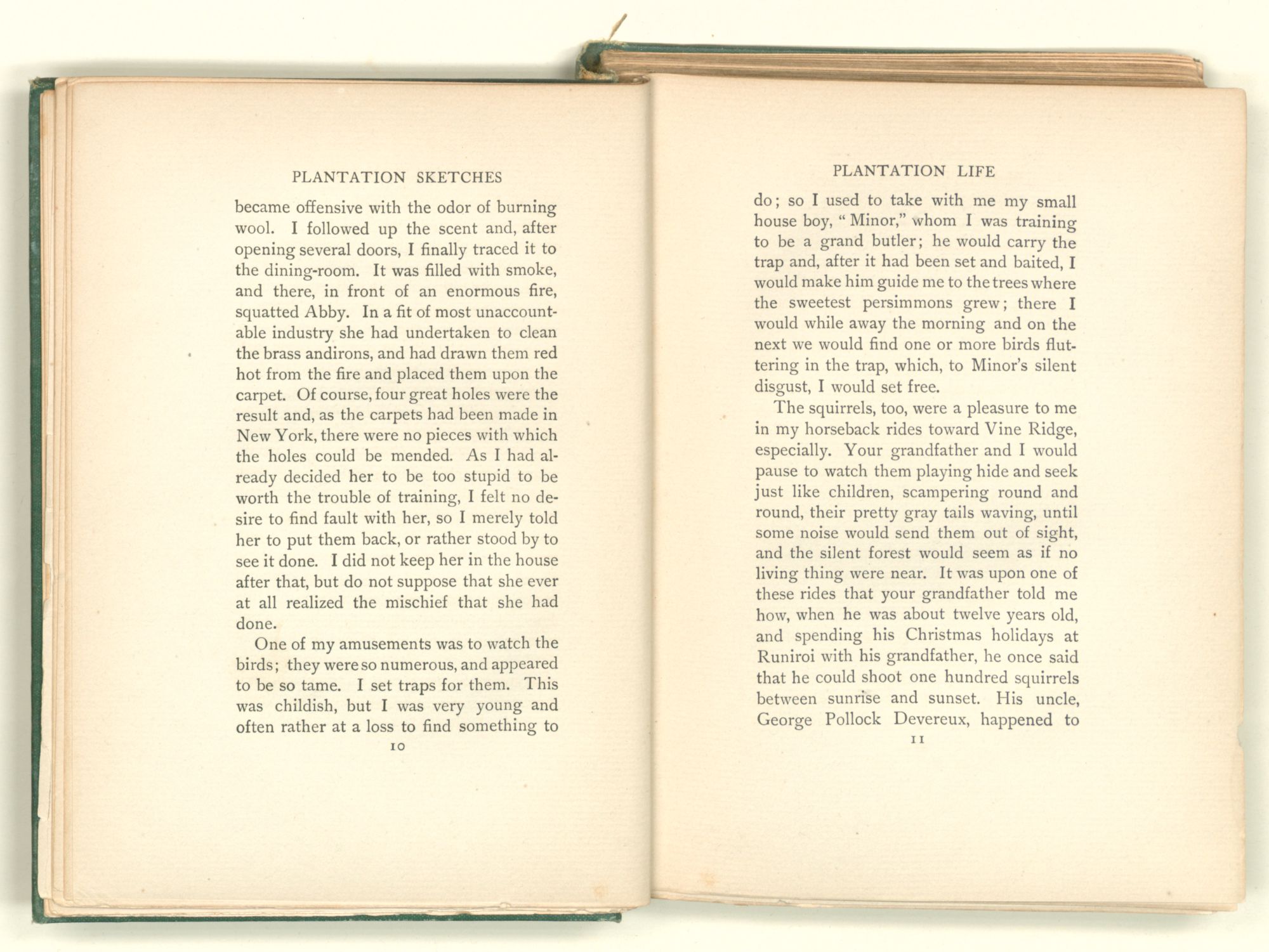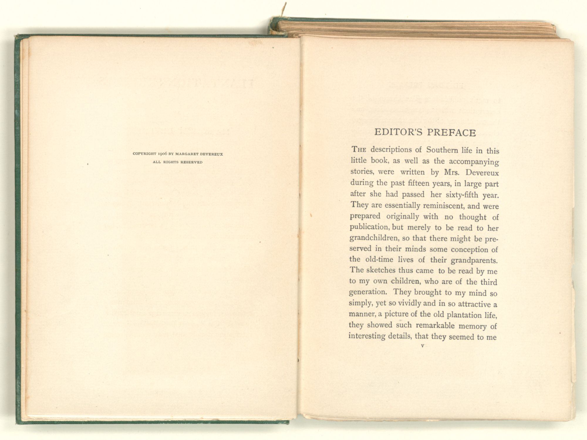 EDITOR'S PREFACEThe descriptions of Southern life in this little book, as well as the accompanying stories, were written by Mrs. Devereux during the past fifteen years, in large part after she had passed her sixty-fifth year. They are essentially reminiscent, and were prepared originally with no thought of publication, but merely to be read to her grandchildren, so that there might be preserved in their minds some conception of the old-time lives of their grandparents. The sketches thus came to be read by me to my own children, who are of the third generation. They brought to my mind so simply, yet so vividly and in so attractive a manner, a picture of the old plantation life, they showed such remarkable memory of interesting details, that they seemed to me