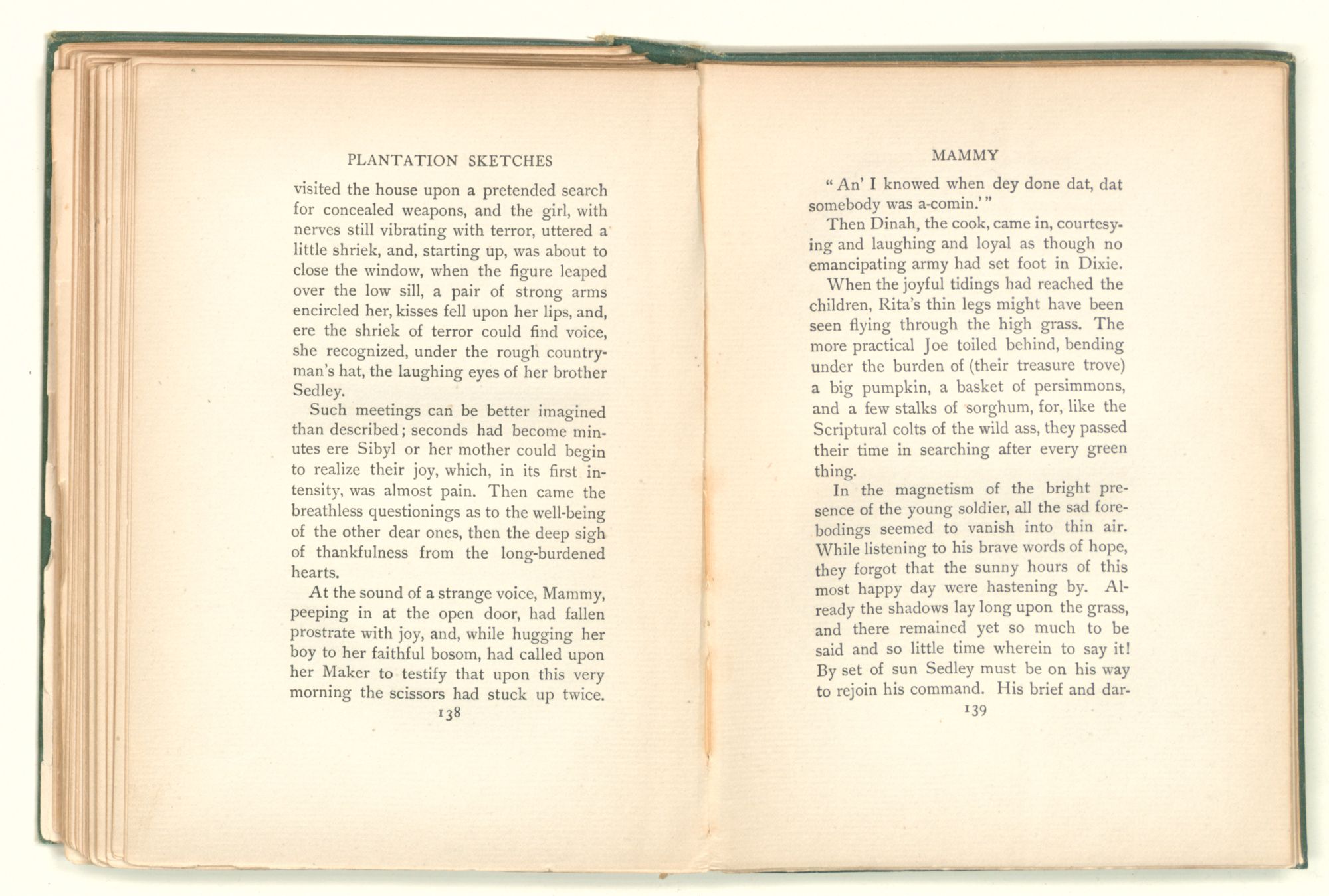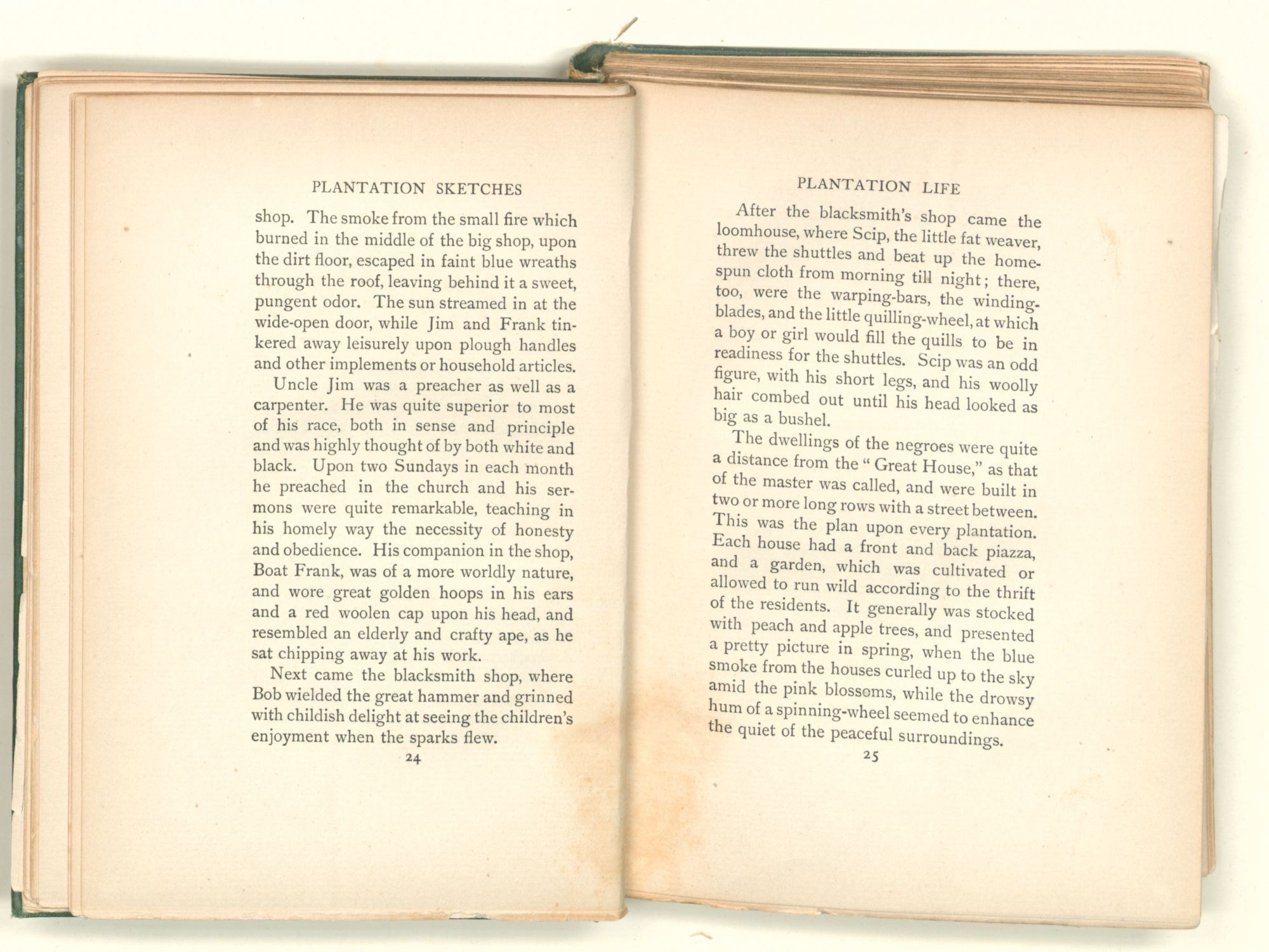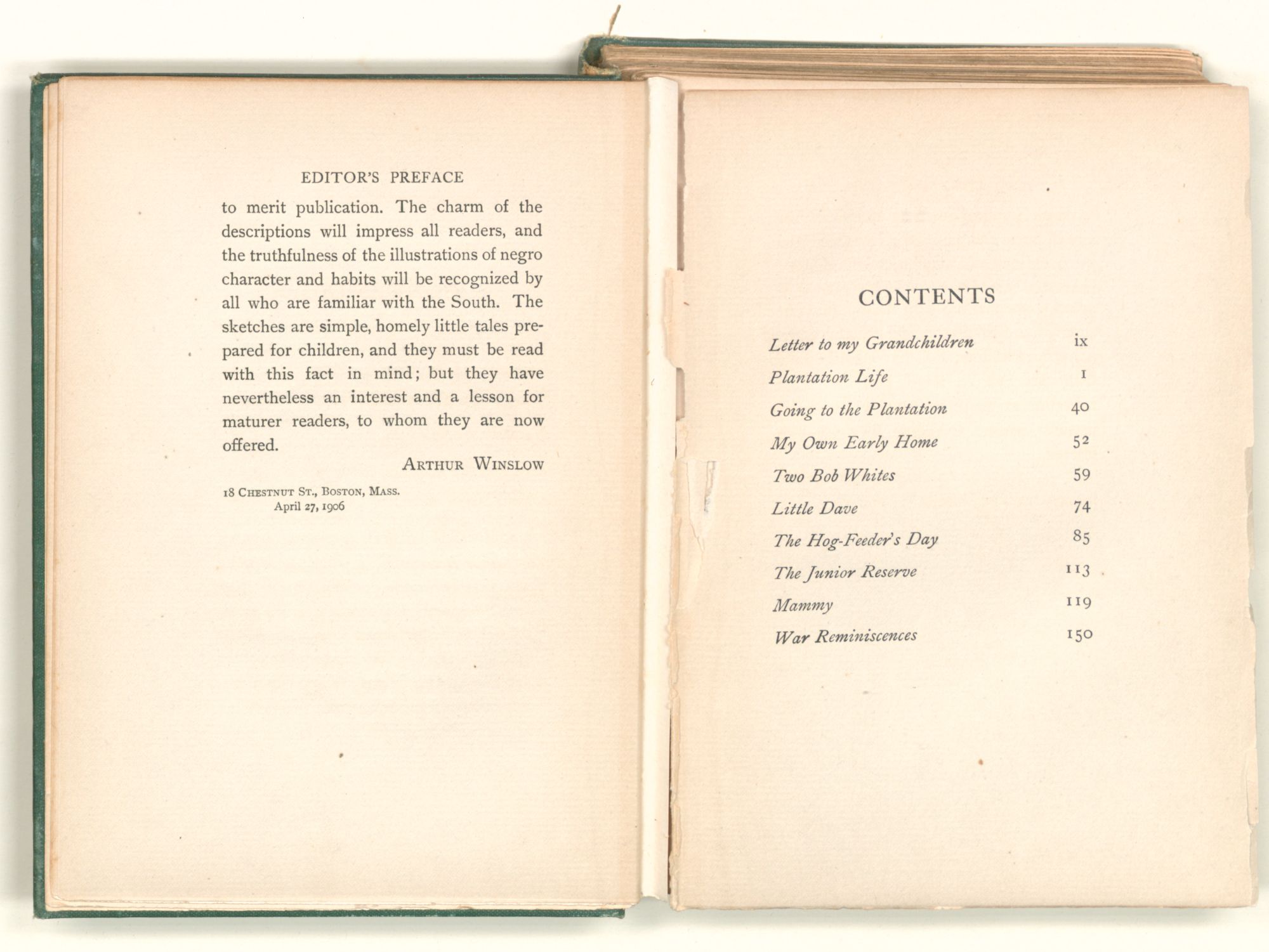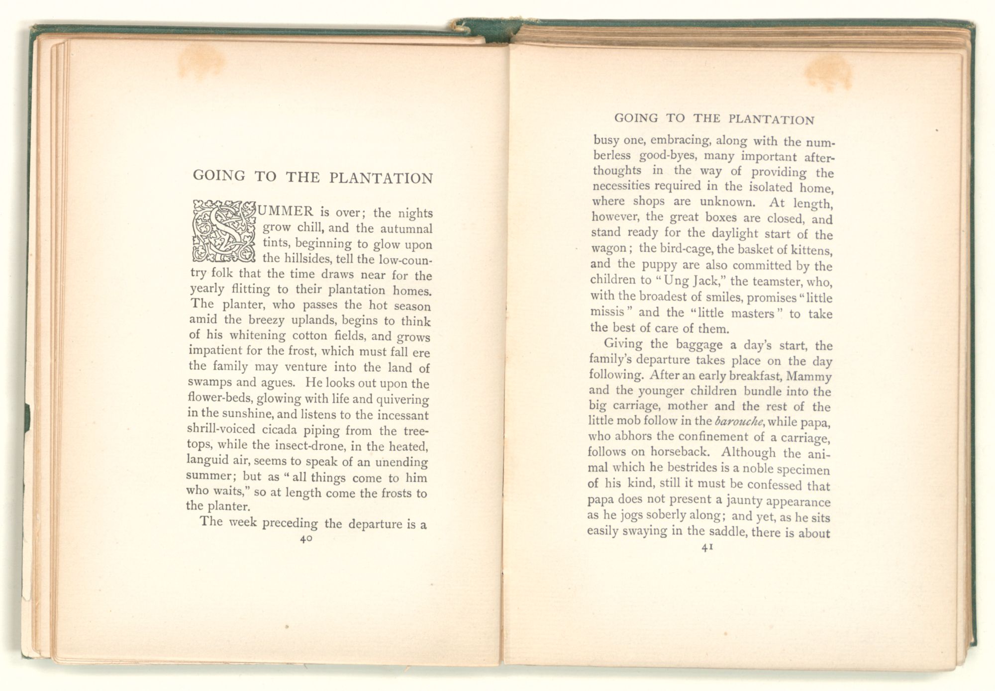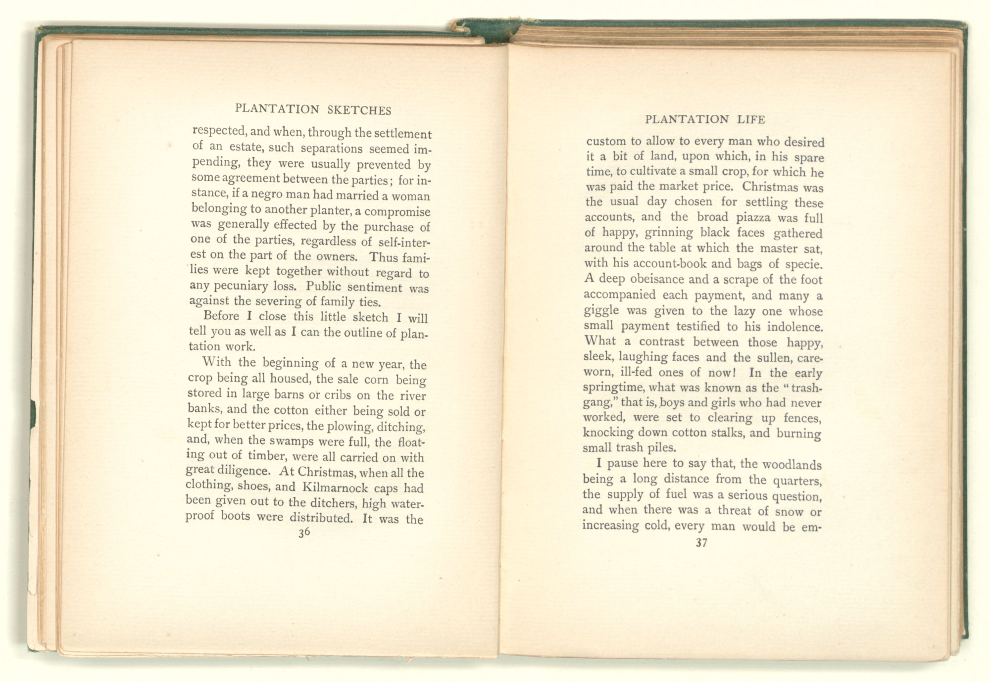 As the “New South,” with all its changes and improvements, rises above the horizon, those whose hearts still cling to the “Old South” look sadly backward and sigh to see it fade away into dimness, to be soon lost to sight and to live only in the memory of the few. Hoping to rescue from oblivion a few of the habits, thoughts, and feelings of the people who made our South what it was, I have drawn from memory a few pen sketches of plantation life, based upon actual events, in which are recorded some of the good and even noble traits of character which were brought forth under the yoke of slavery.