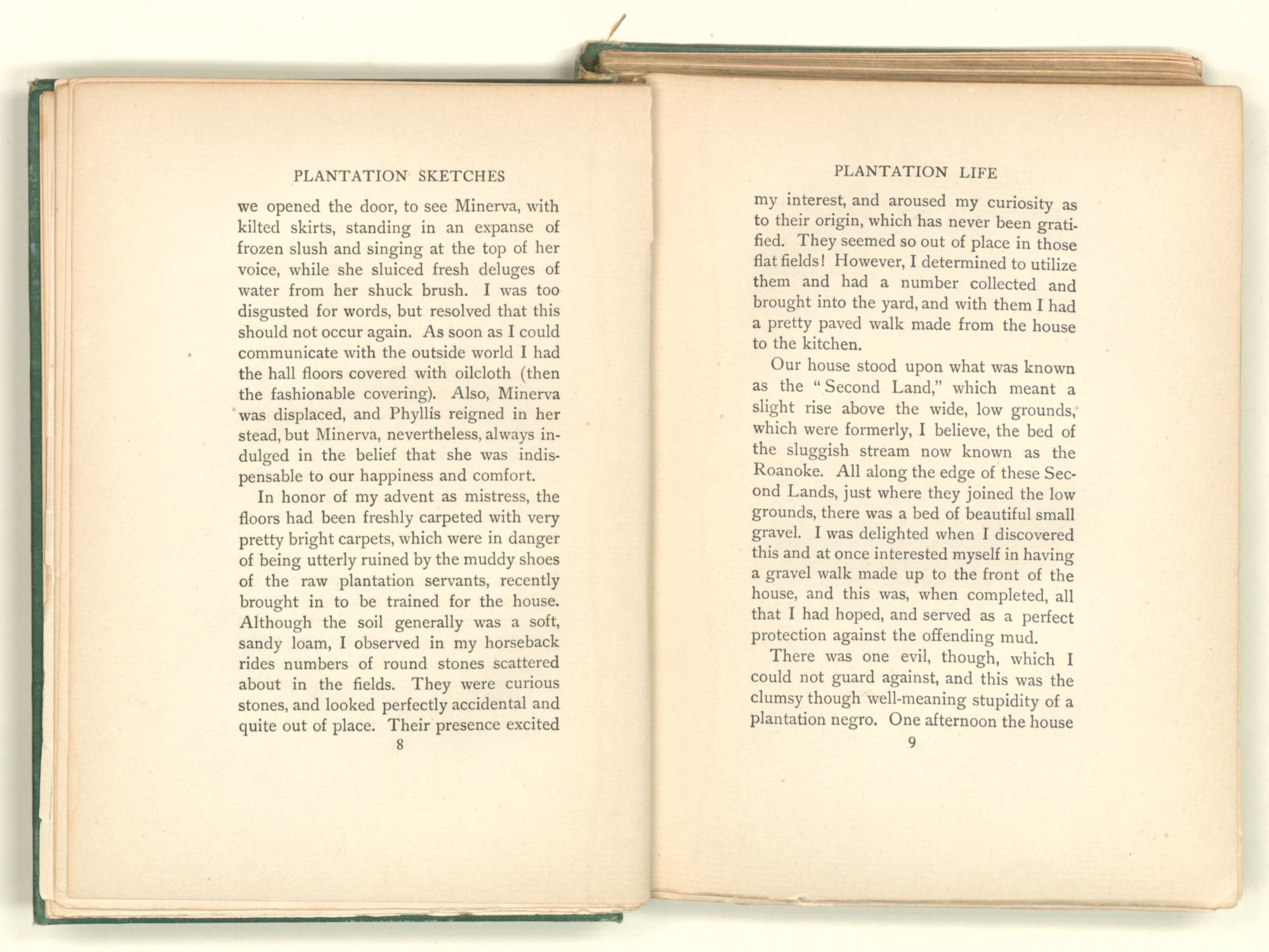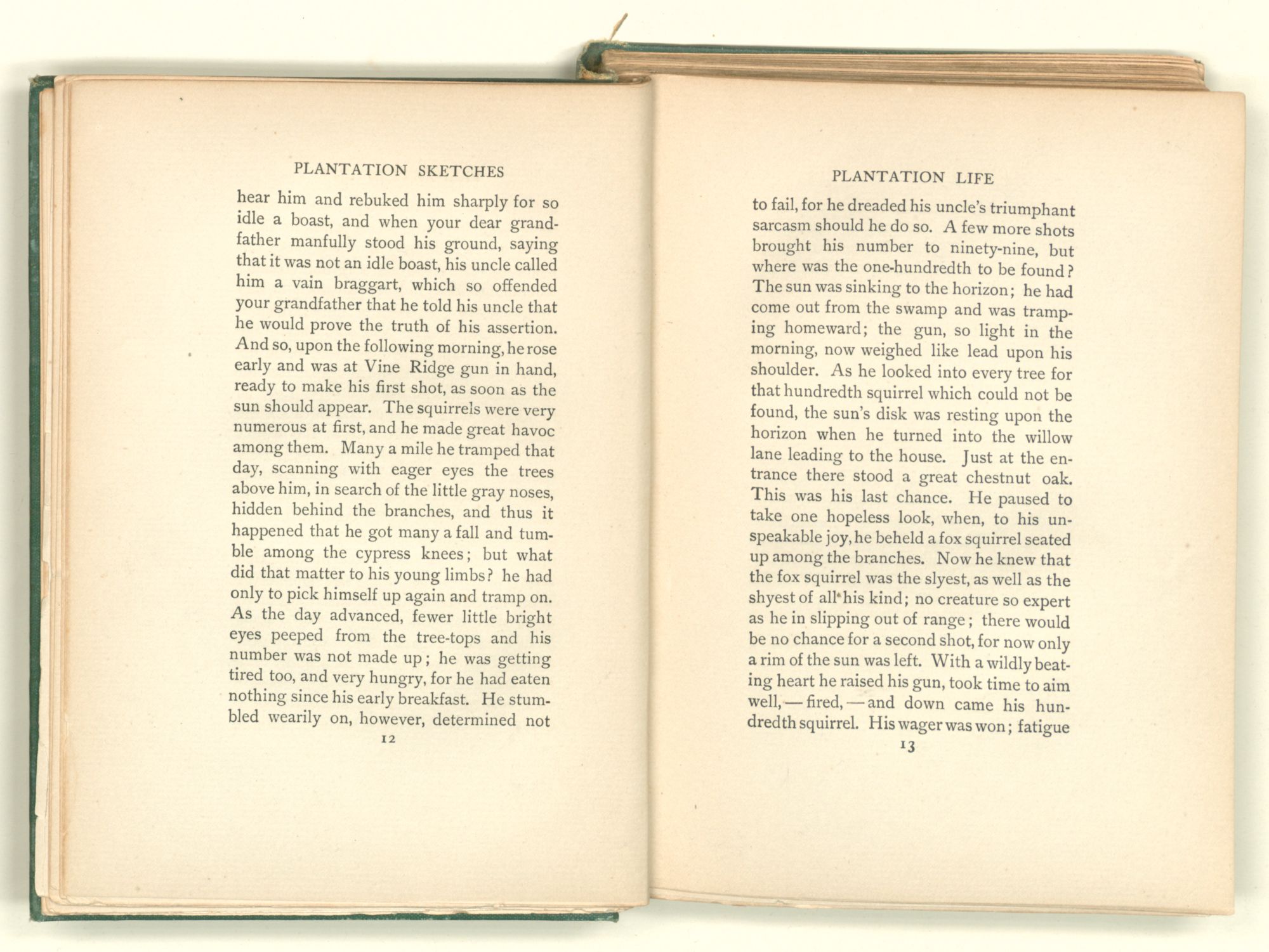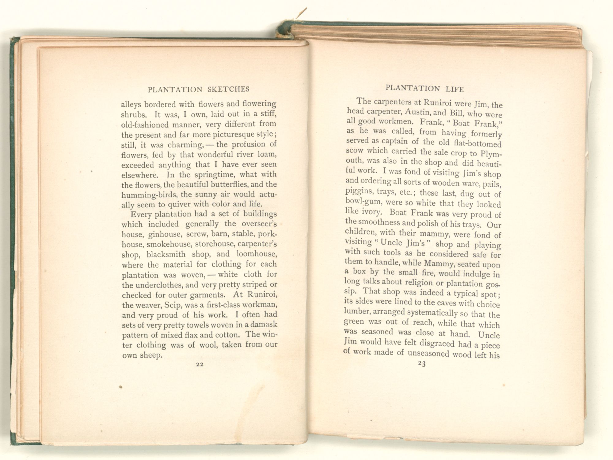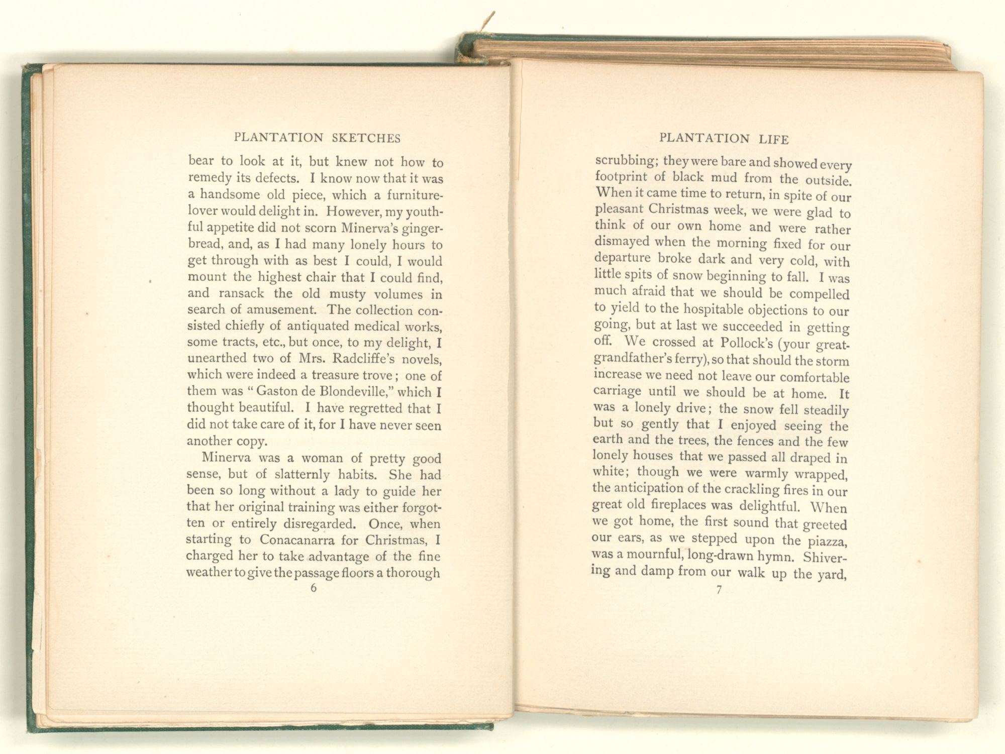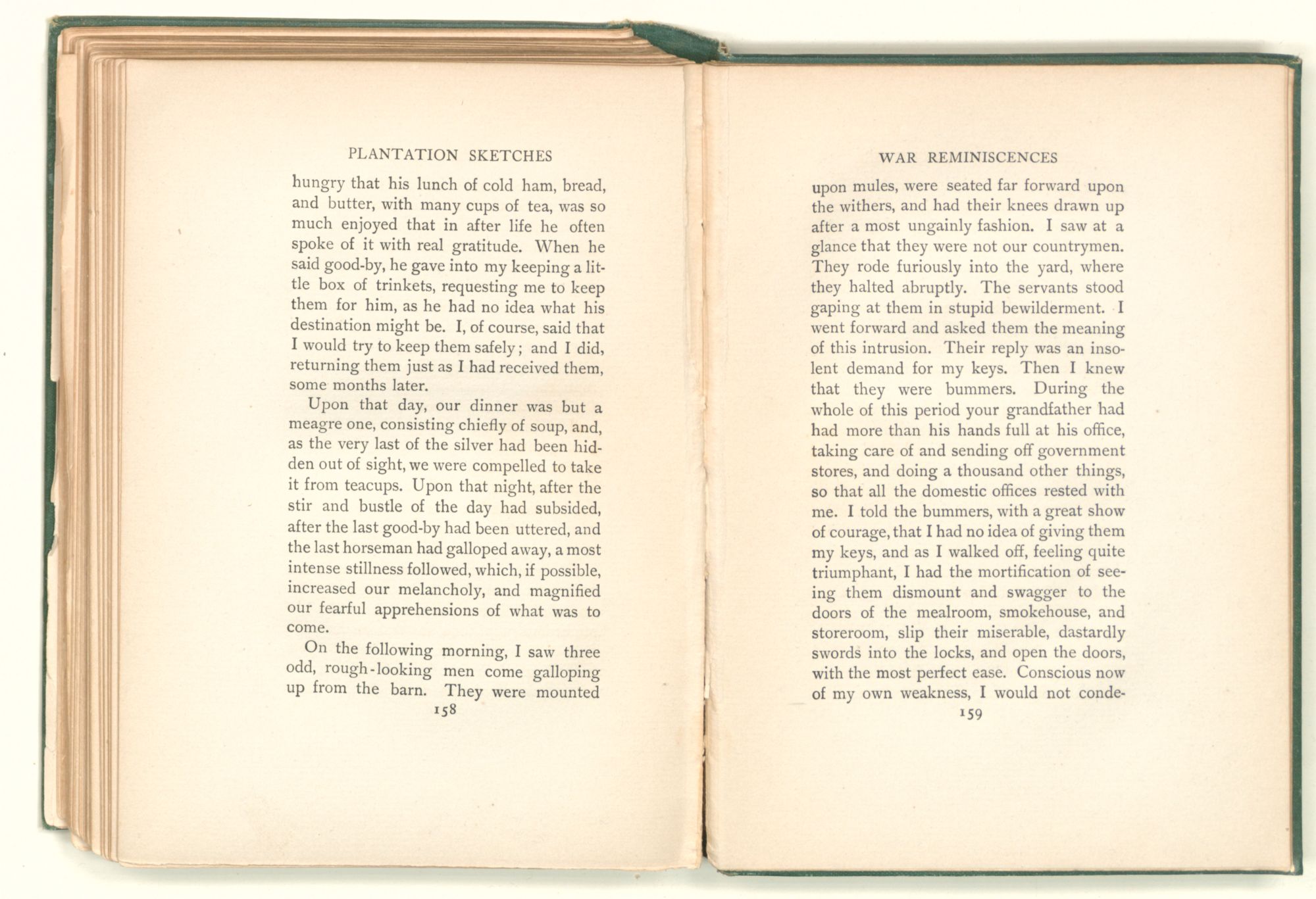 As the “New South,” with all its changes and improvements, rises above the horizon, those whose hearts still cling to the “Old South” look sadly backward and sigh to see it fade away into dimness, to be soon lost to sight and to live only in the memory of the few. Hoping to rescue from oblivion a few of the habits, thoughts, and feelings of the people who made our South what it was, I have drawn from memory a few pen sketches of plantation life, based upon actual events, in which are recorded some of the good and even noble traits of character which were brought forth under the yoke of slavery.