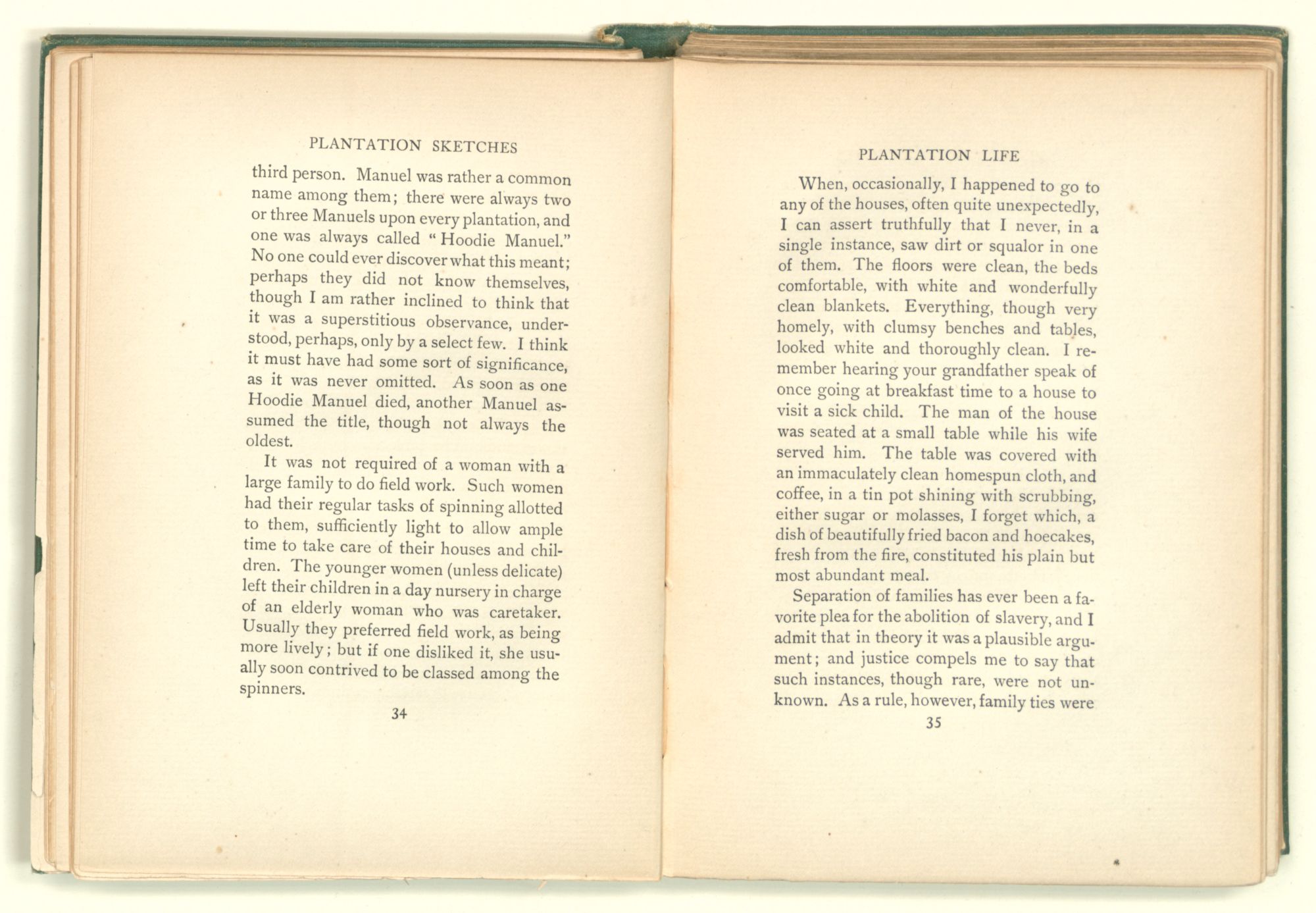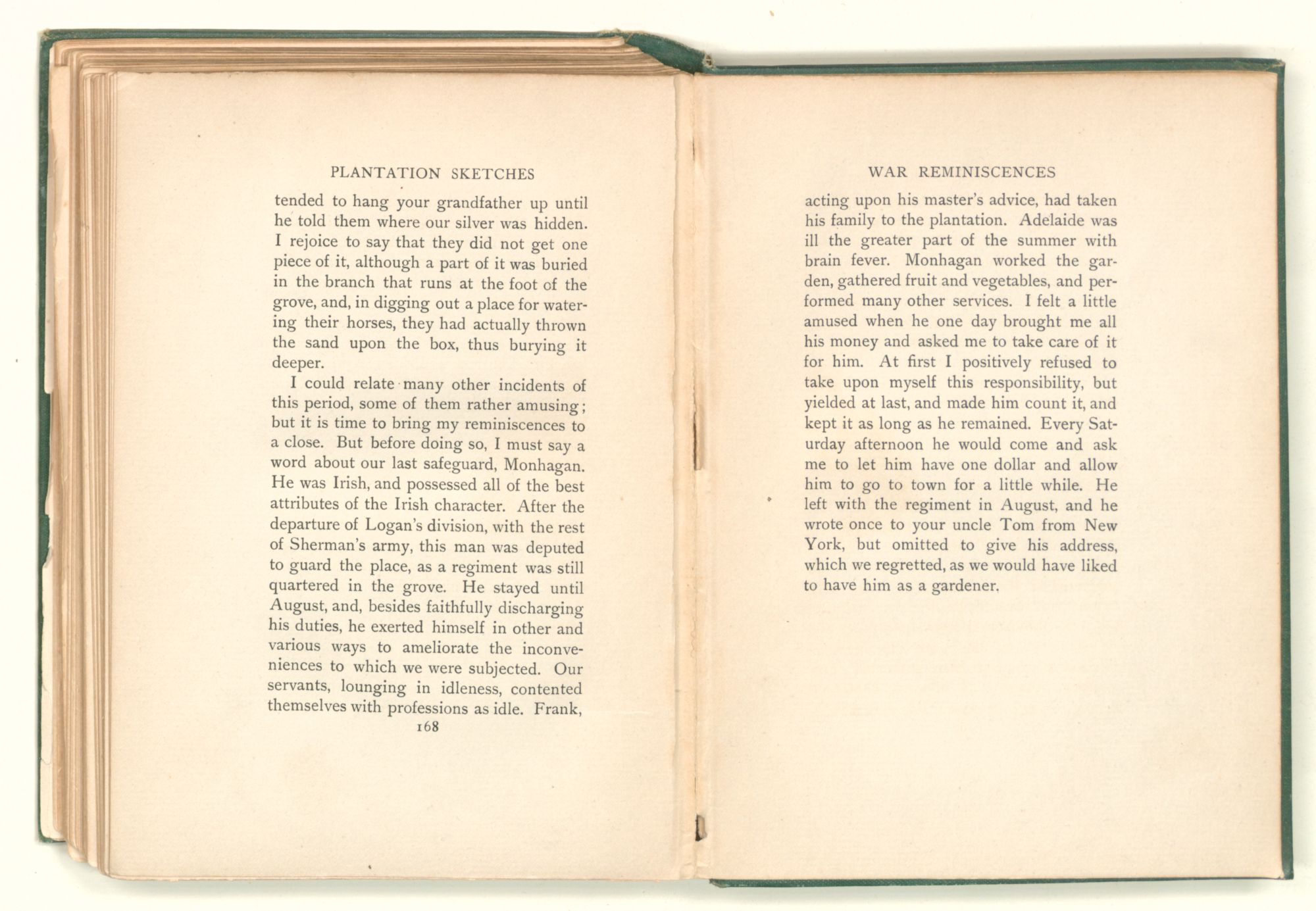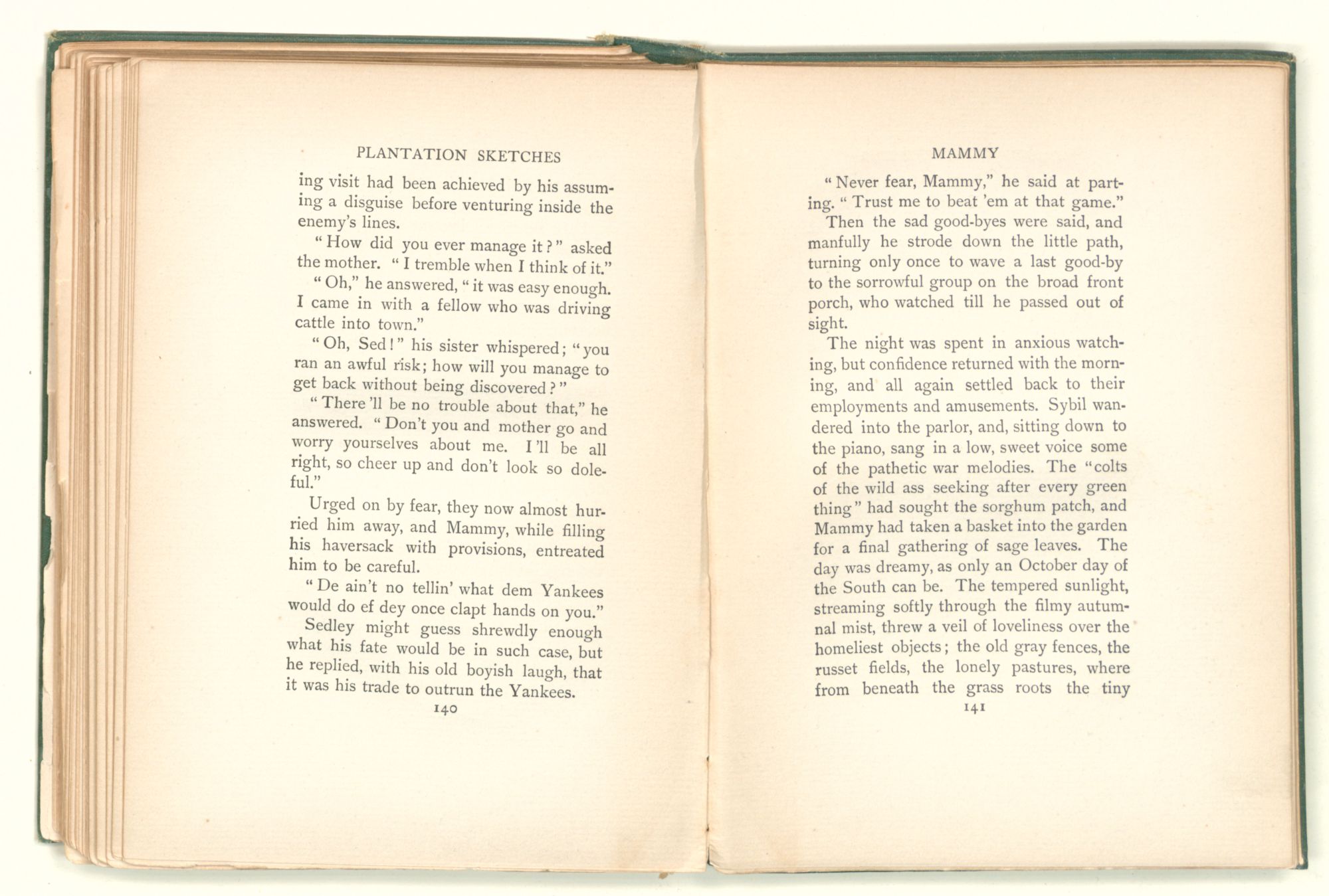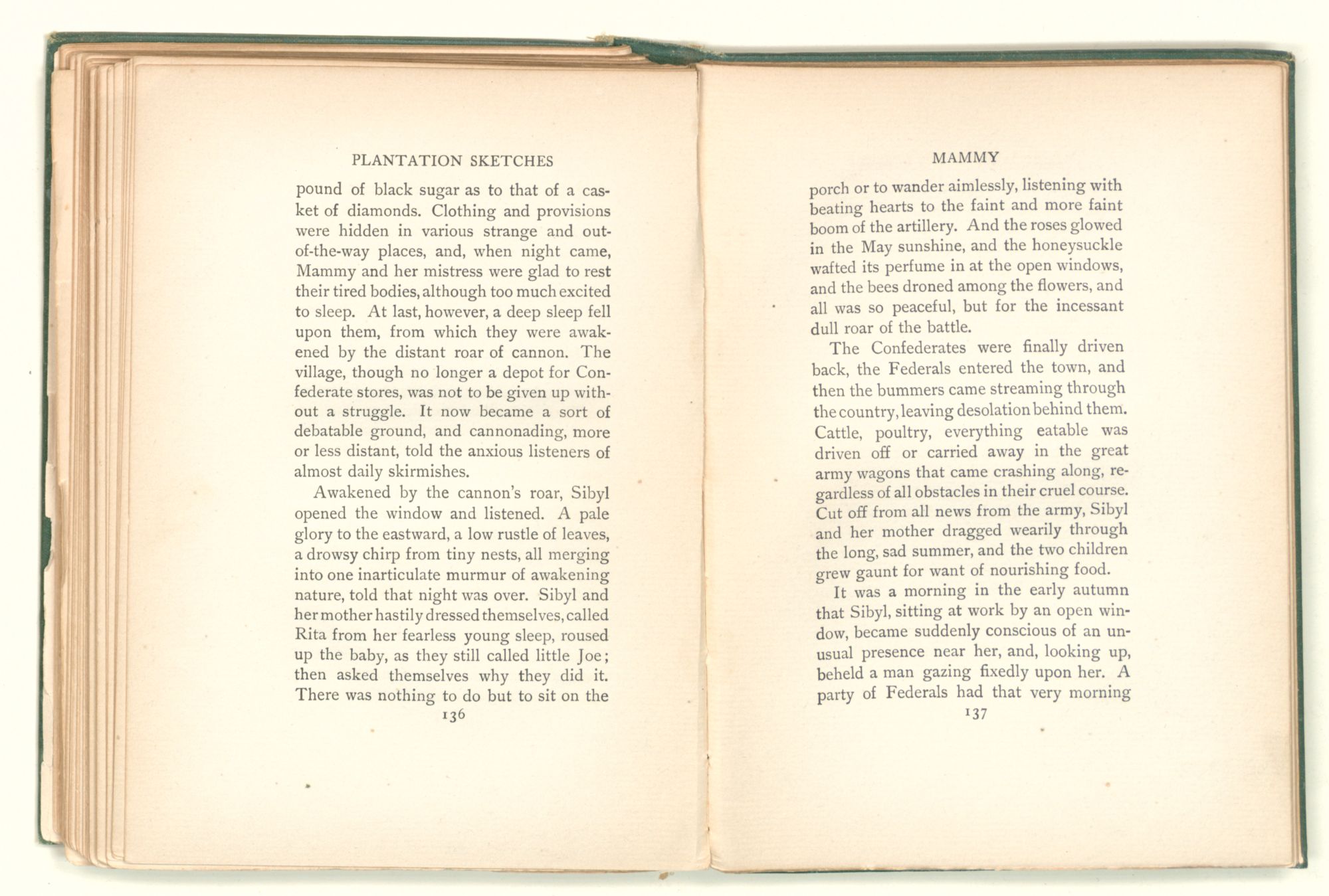 As the “New South,” with all its changes and improvements, rises above the horizon, those whose hearts still cling to the “Old South” look sadly backward and sigh to see it fade away into dimness, to be soon lost to sight and to live only in the memory of the few. Hoping to rescue from oblivion a few of the habits, thoughts, and feelings of the people who made our South what it was, I have drawn from memory a few pen sketches of plantation life, based upon actual events, in which are recorded some of the good and even noble traits of character which were brought forth under the yoke of slavery.