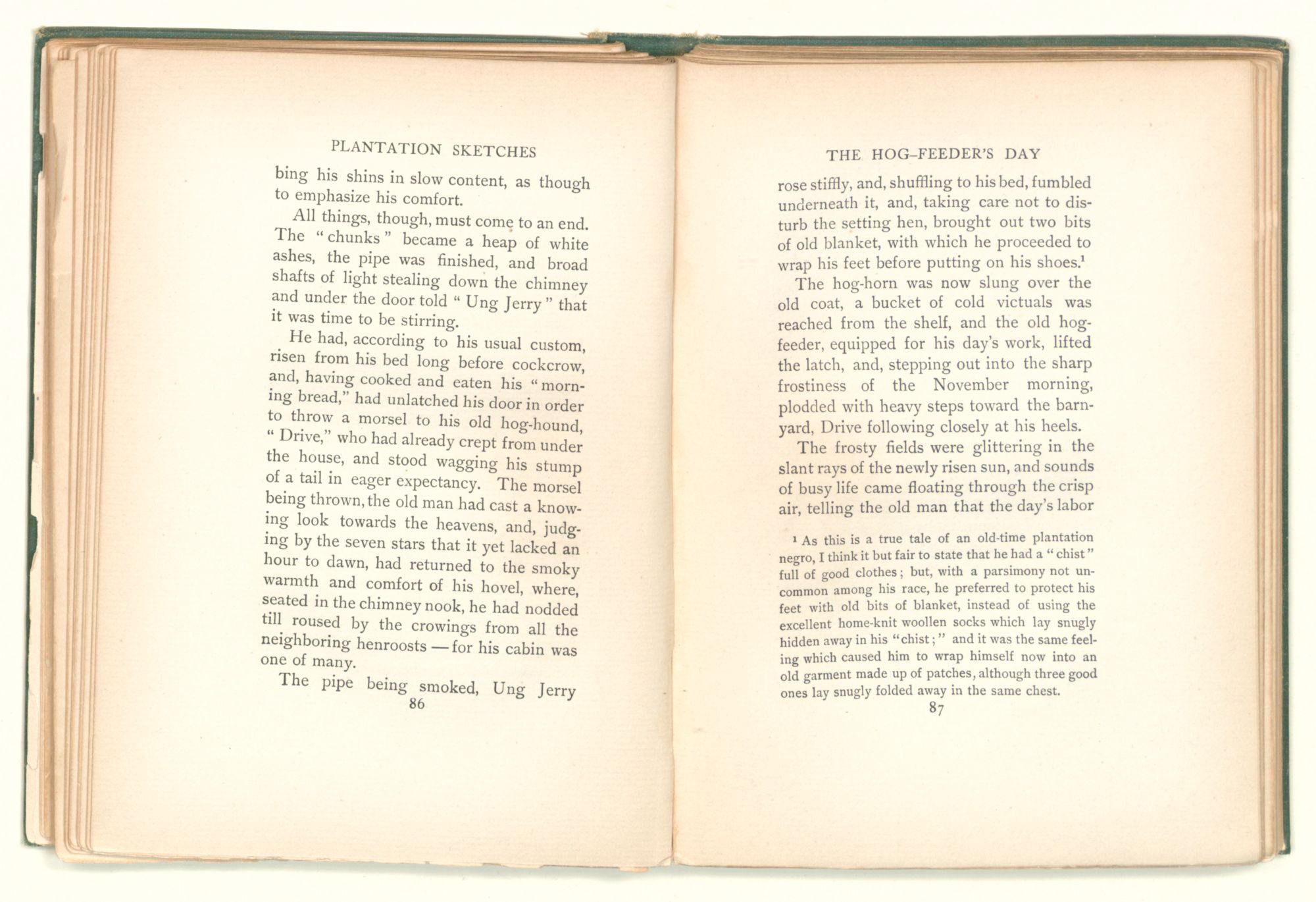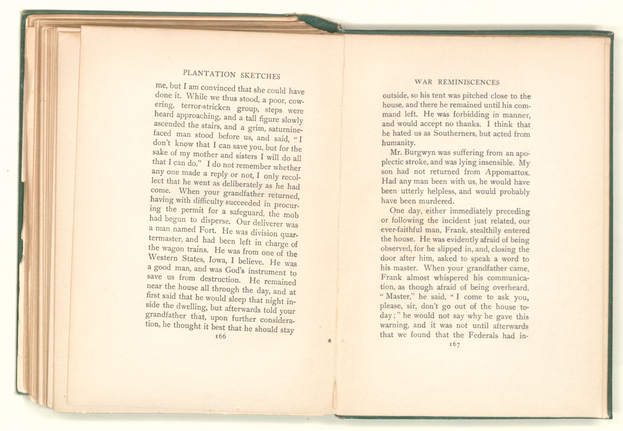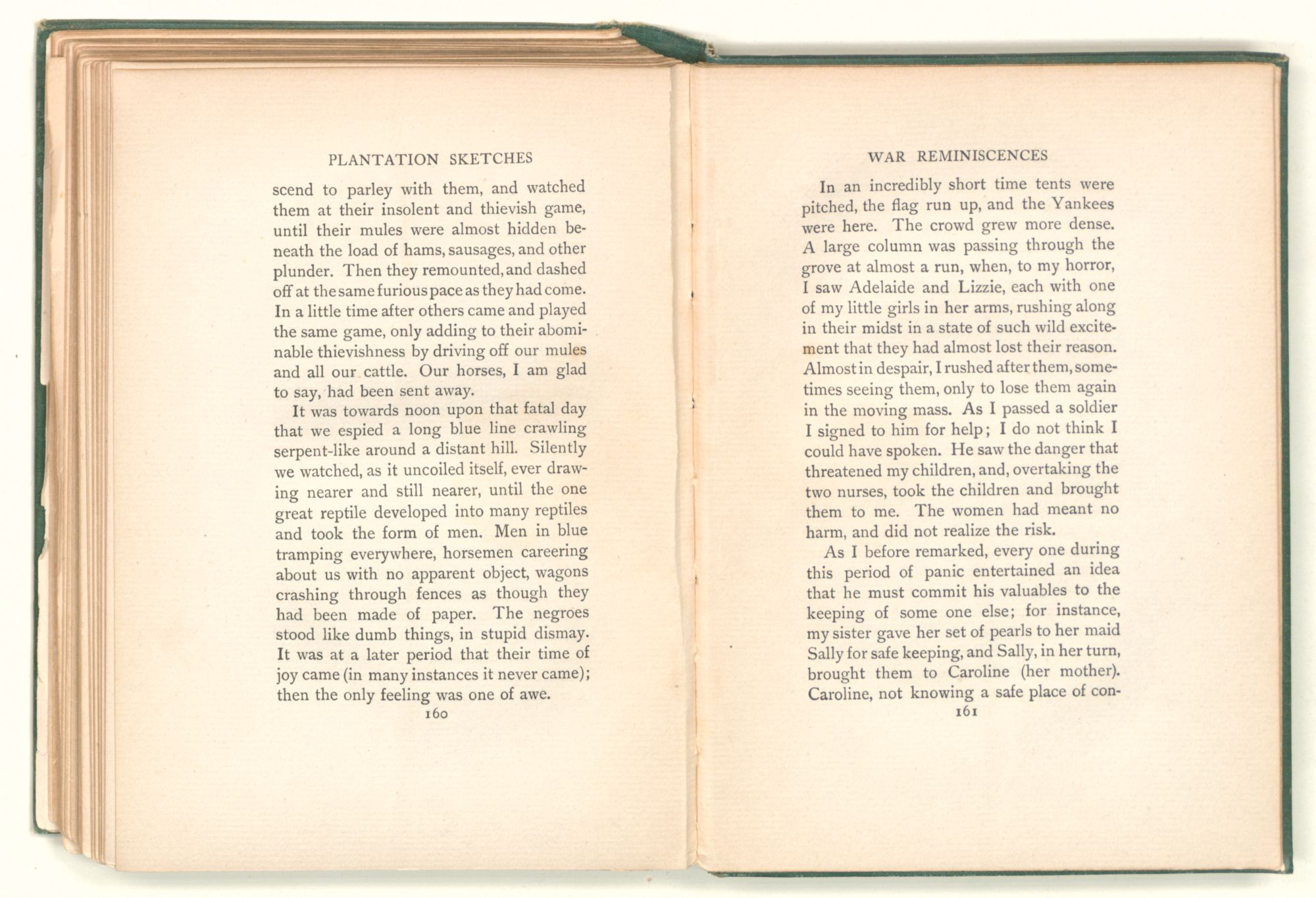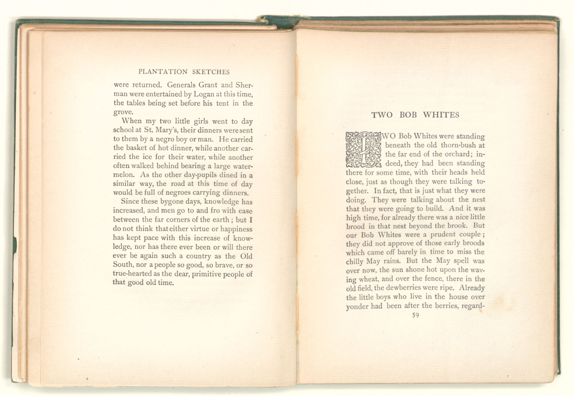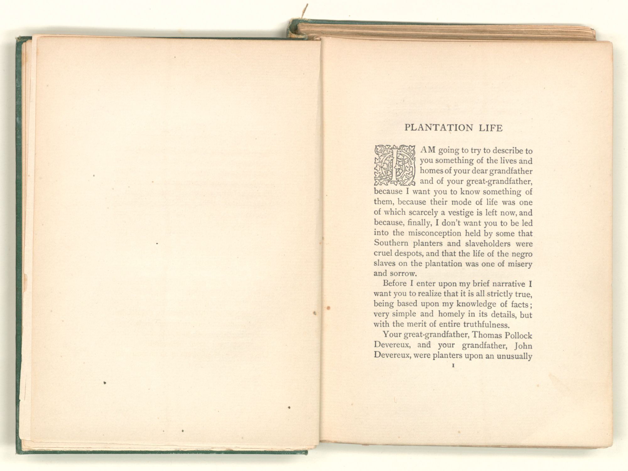 As the “New South,” with all its changes and improvements, rises above the horizon, those whose hearts still cling to the “Old South” look sadly backward and sigh to see it fade away into dimness, to be soon lost to sight and to live only in the memory of the few. Hoping to rescue from oblivion a few of the habits, thoughts, and feelings of the people who made our South what it was, I have drawn from memory a few pen sketches of plantation life, based upon actual events, in which are recorded some of the good and even noble traits of character which were brought forth under the yoke of slavery.