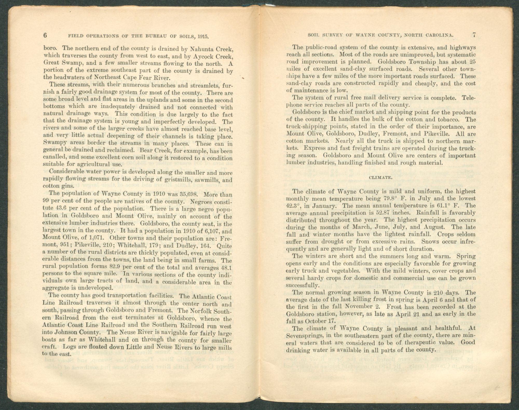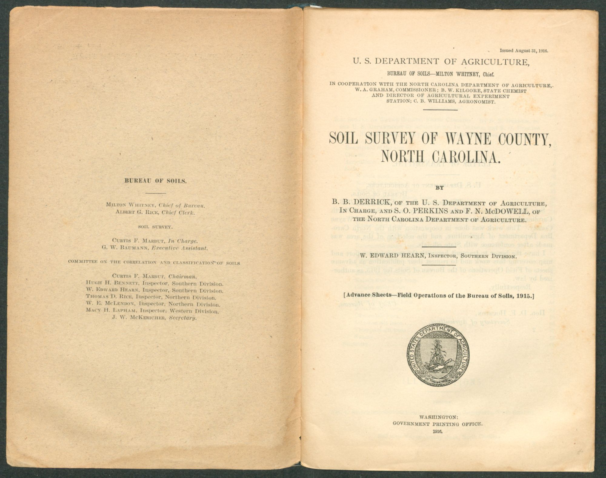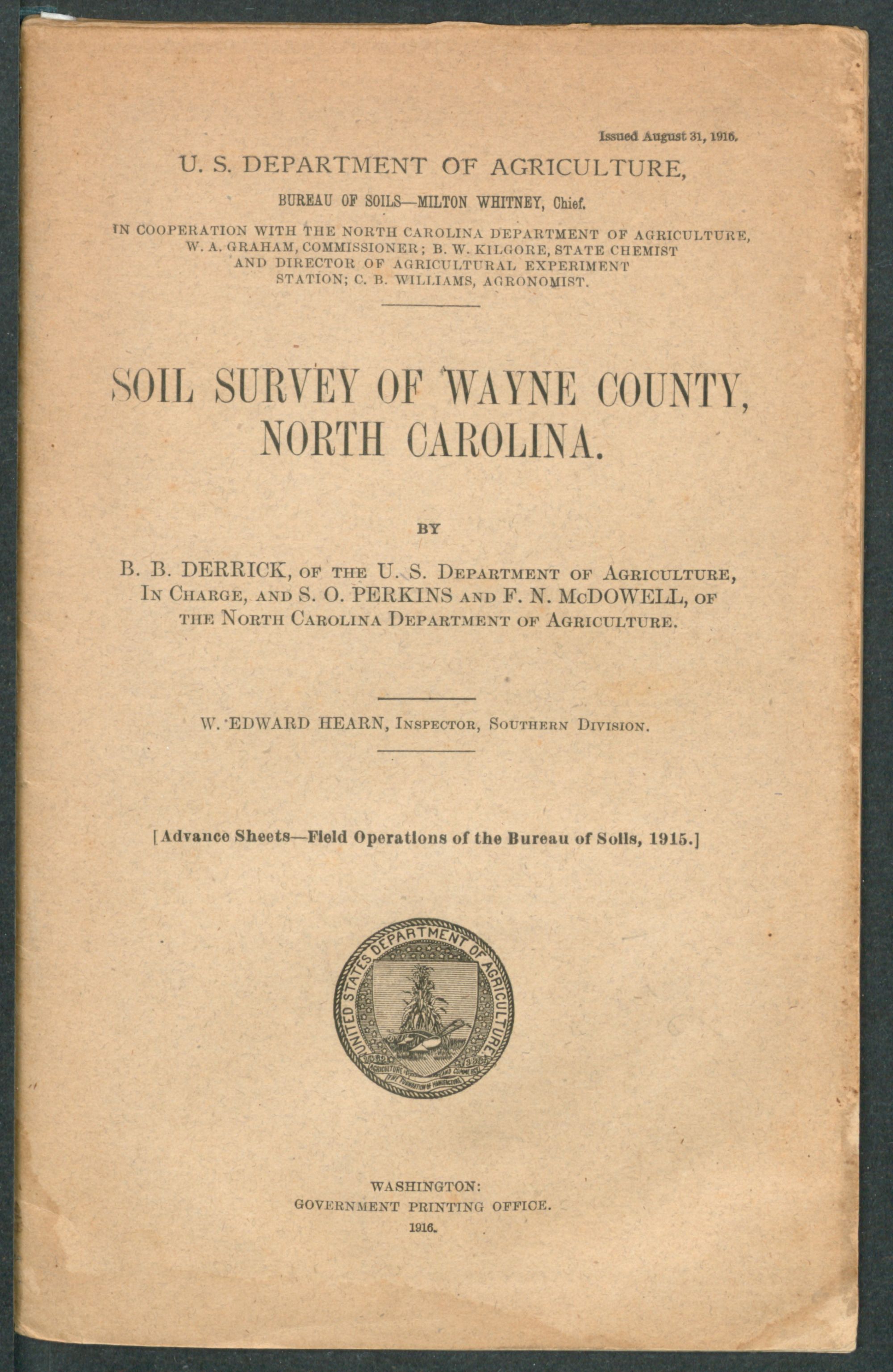 Issued August 31, 1916. U. S. DEPARTMENT OF AGRICULTURE, BUREAU OF SOILS—MILTON WHITNEY, Chief. IN COOPERATION WITH THE NORTH CAROLINA DEPARTMENT OF AGRICULTURE, W. A. GRAHAM, COMMISSIONER; B. W. KILGORE, STATE CHEMIST AND DIRECTOR OF AGRICULTURAL EXPERIMENT STATION; C. B. WILLIAMS, AGRONOMIST. SOIL SURVEY OF WAYNE COUNTY,NORTH CAROLINA.BYB. B. DERRICK, of the U. S. Department of Agriculture, In Charge, andS. O. PERKINSandF. N. McDOWELL, of the North Carolina Department of Agriculture. W. EDWARD HEARN, Inspector, Southern Division. [Advance Sheets—Field Operations of the Bureau of Soils, 1915.]United States Department of Agriculture 1862 Agriculture is the Foundation of Manufacture and Commerce 1889Seal of the United States Department of AgricultureWASHINGTON:GOVERNMENT PRINTING OFFICE.1916.