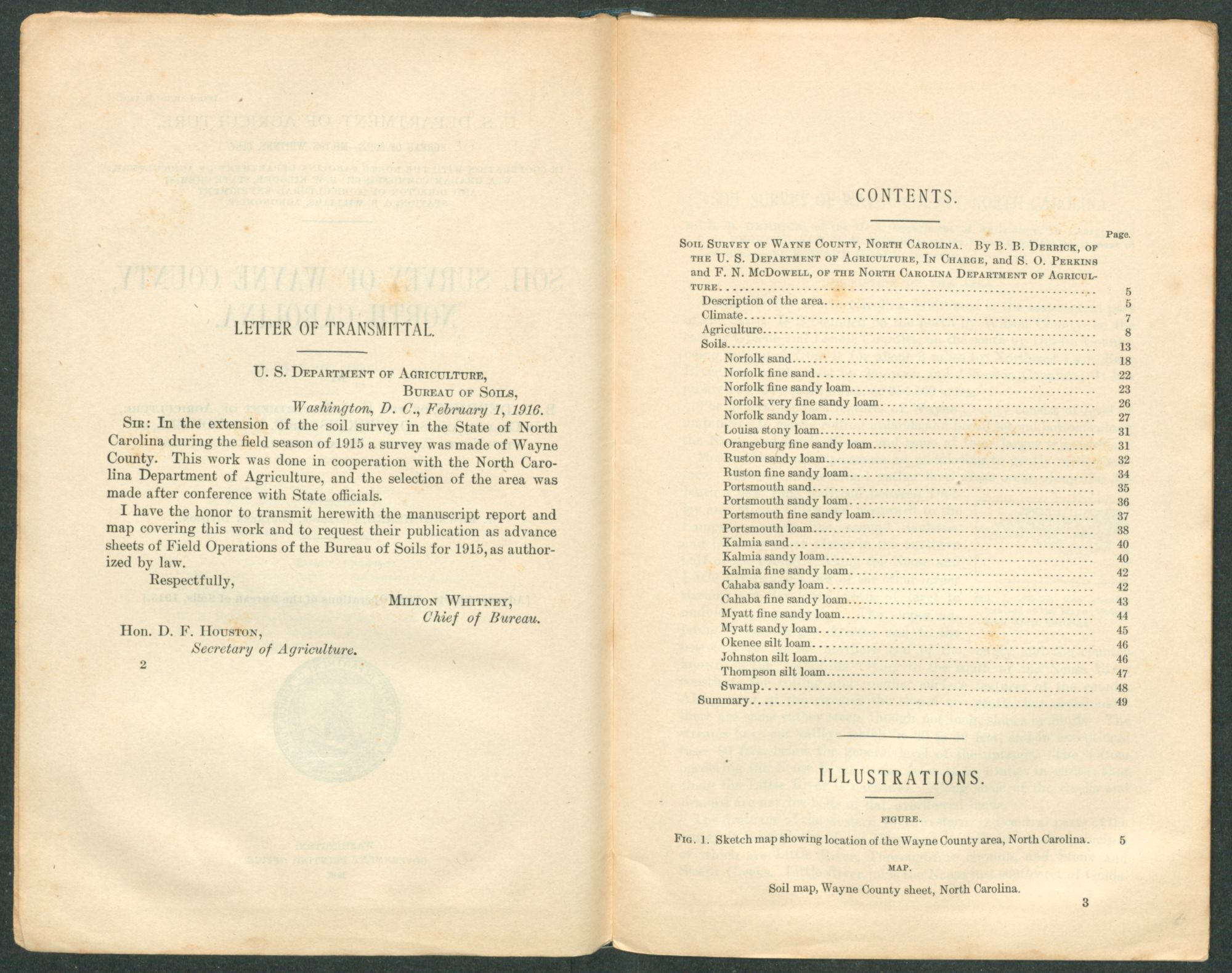 I have the honor to transmit herewith the manuscript report and map covering this work and to request their publication as advance sheets of Field Operations of the Bureau of Soils for 1915, as authorized by law.