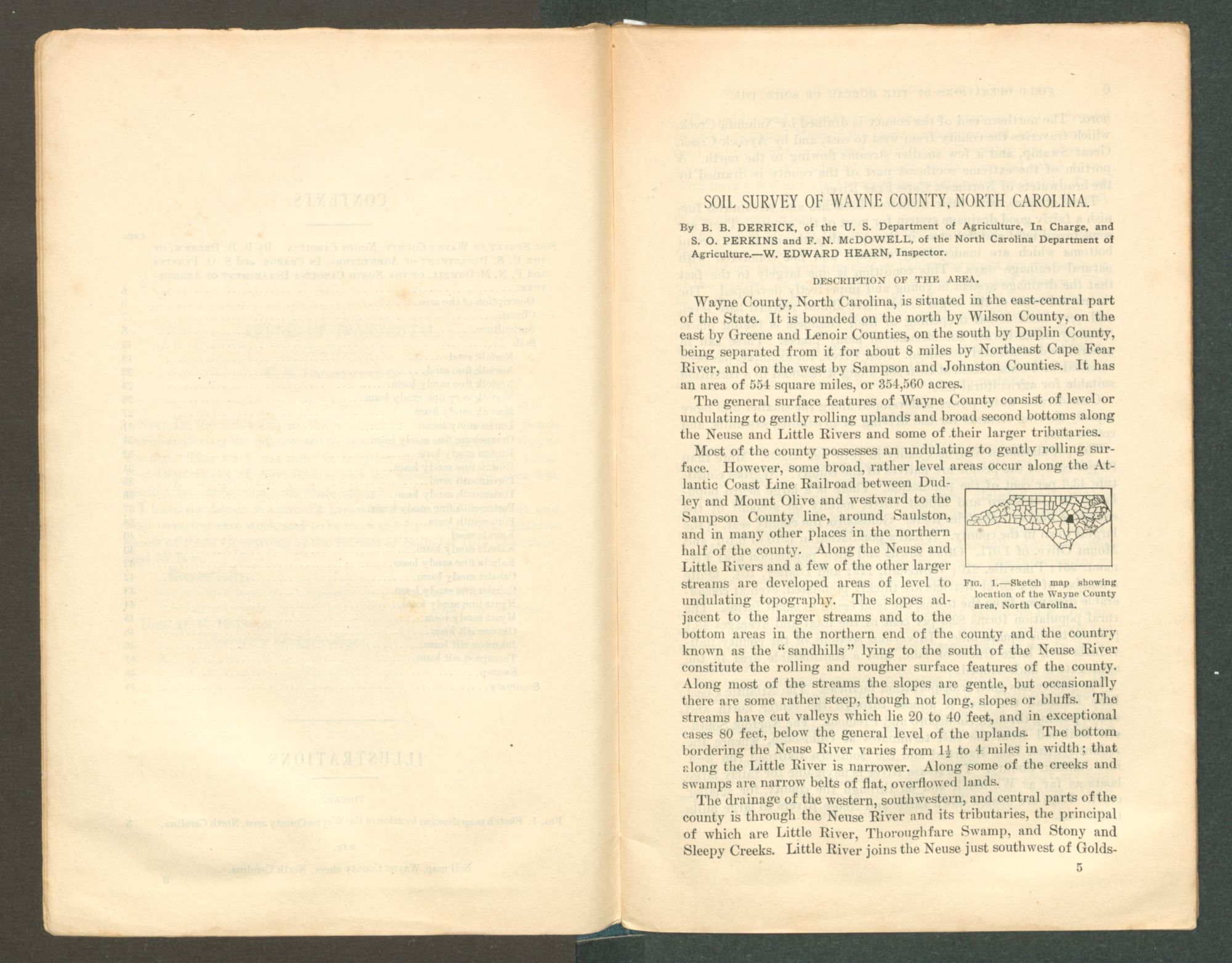 | Soil Survey of Wayne County, North Carolina. By B. B. Derrick, of the U. S. Department of Agriculture, In Charge, and S. O. Perkins and F. N. McDowell, of the North Carolina Department of Agriculture | 5 |