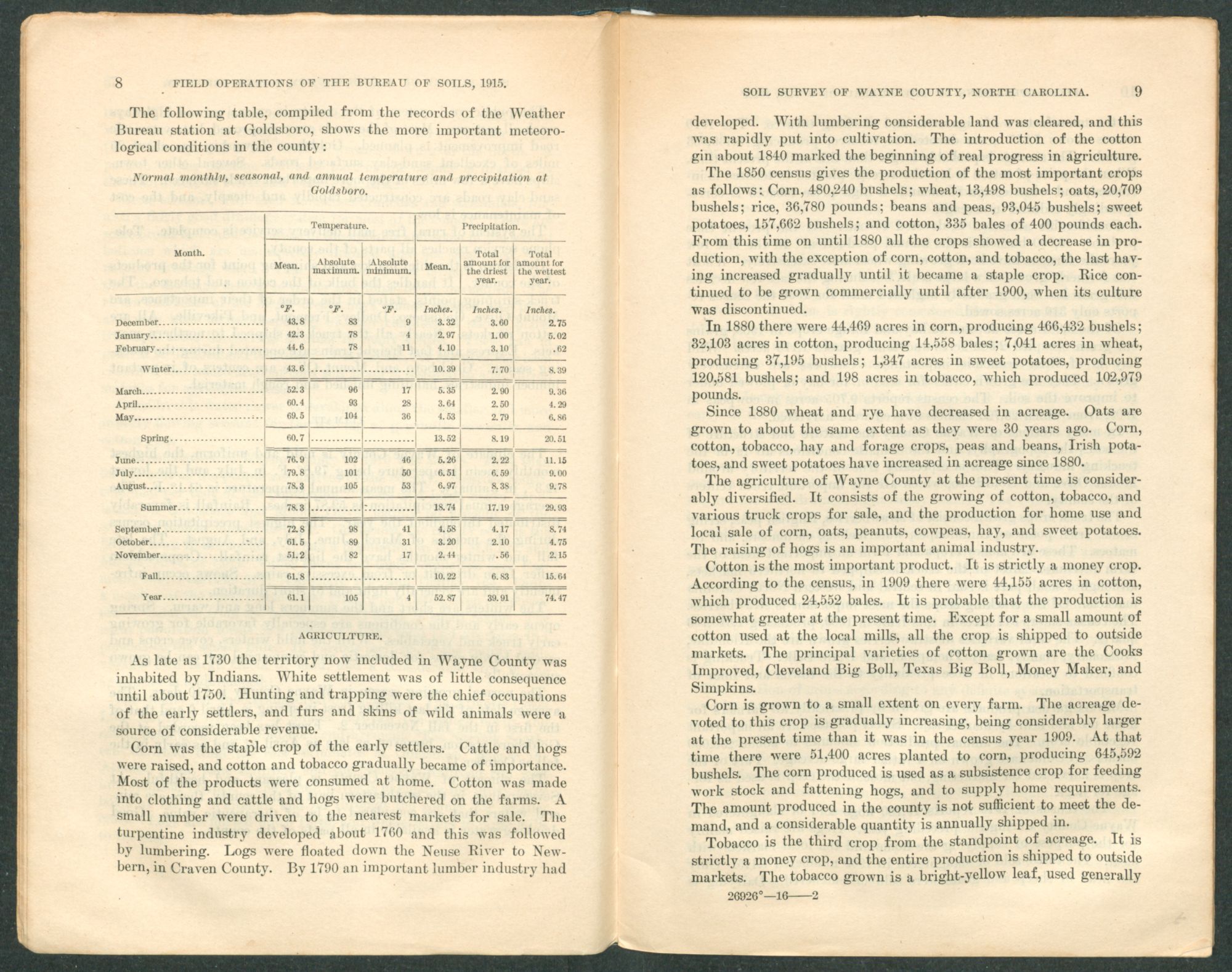 The following table, compiled from the records of the Weather Bureau station at Goldsboro, shows the more important meteorological conditions in the county: