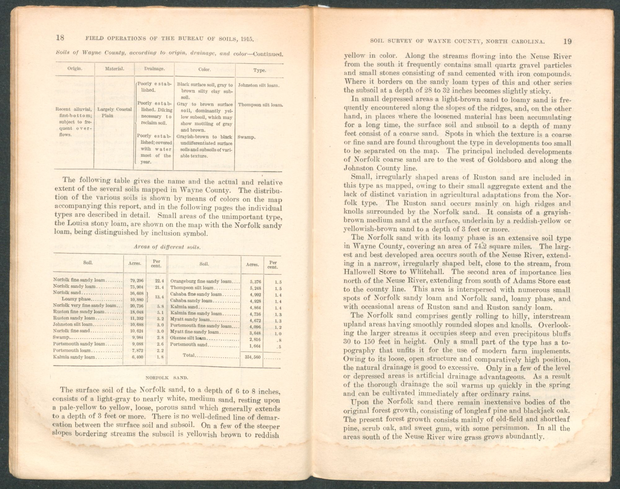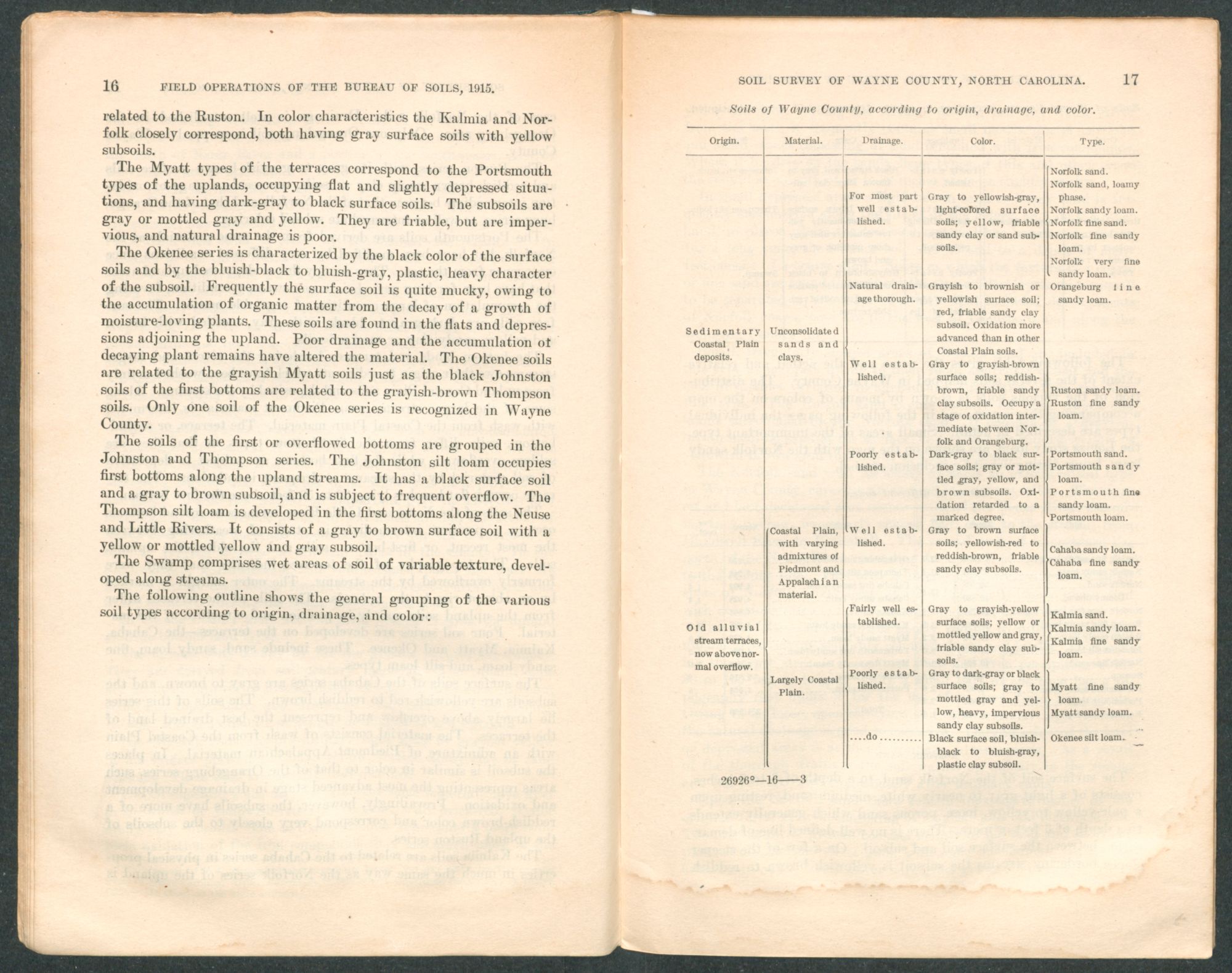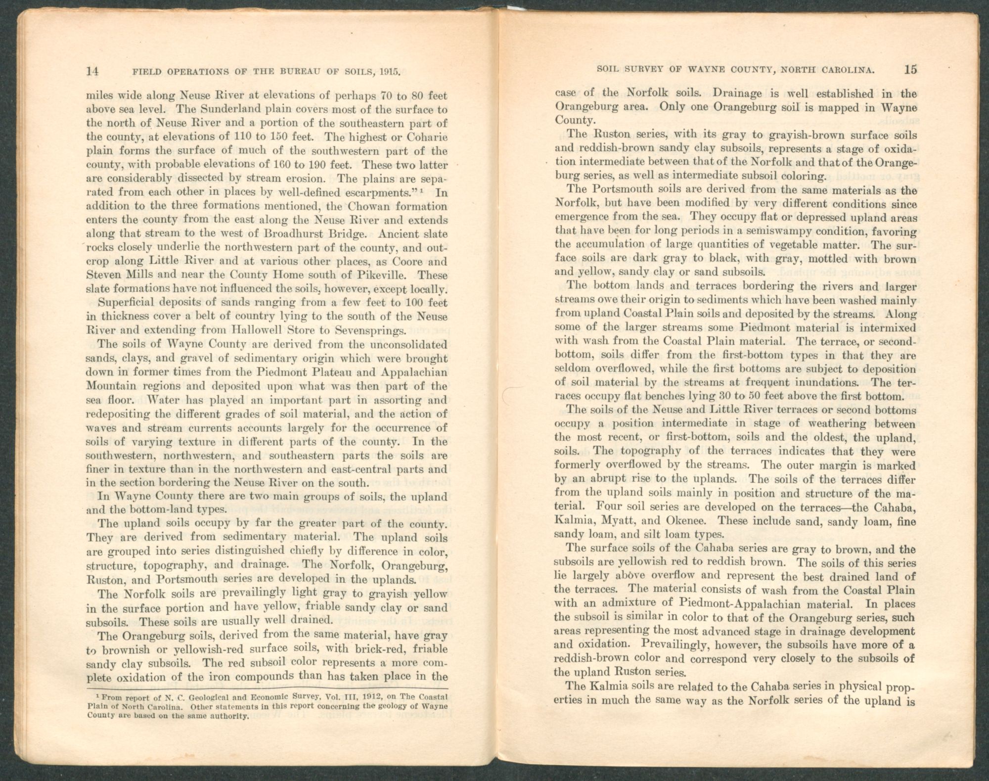 Wayne County lies wholly within the Coastal Plain soil province. The upland soils are derived from unconsolidated sands and clays, the weathering of which gives rise to the four upland series, the Norfolk, Ruston, Orangeburg, and Portsmouth. Bordering the rivers and large creeks are broad areas of second-bottom lands and narrow strips of first bottoms. These alluvial soils consist of reworked Coastal Plain material. On the terraces or second bottoms the Cahaba, Kalmia, Myatt, and Okenee series are developed, while in the first bottoms of the Neuse and Little Rivers the Thompson series is developed. The Johnston series and Swamp occur in the first bottoms along the upland streams.