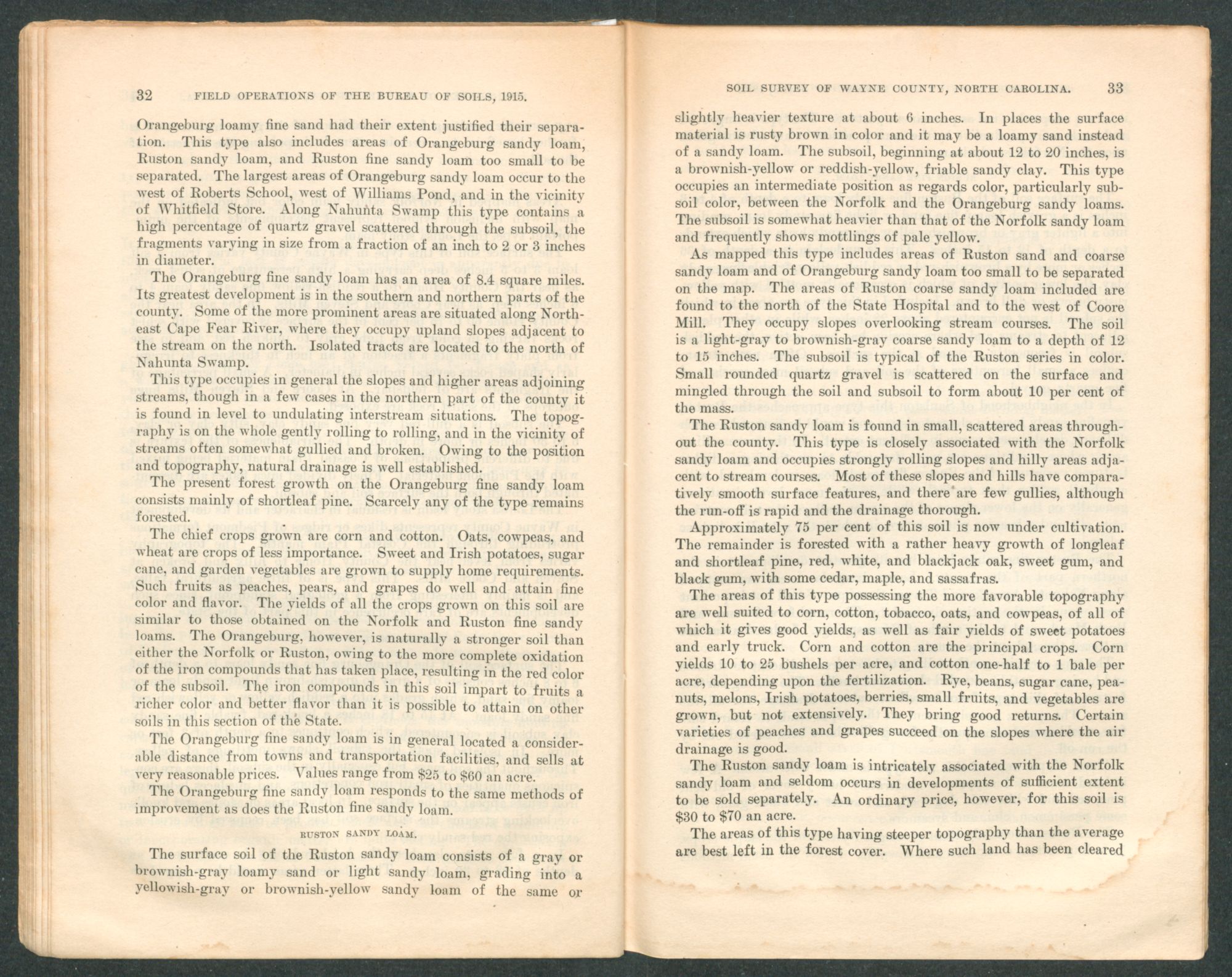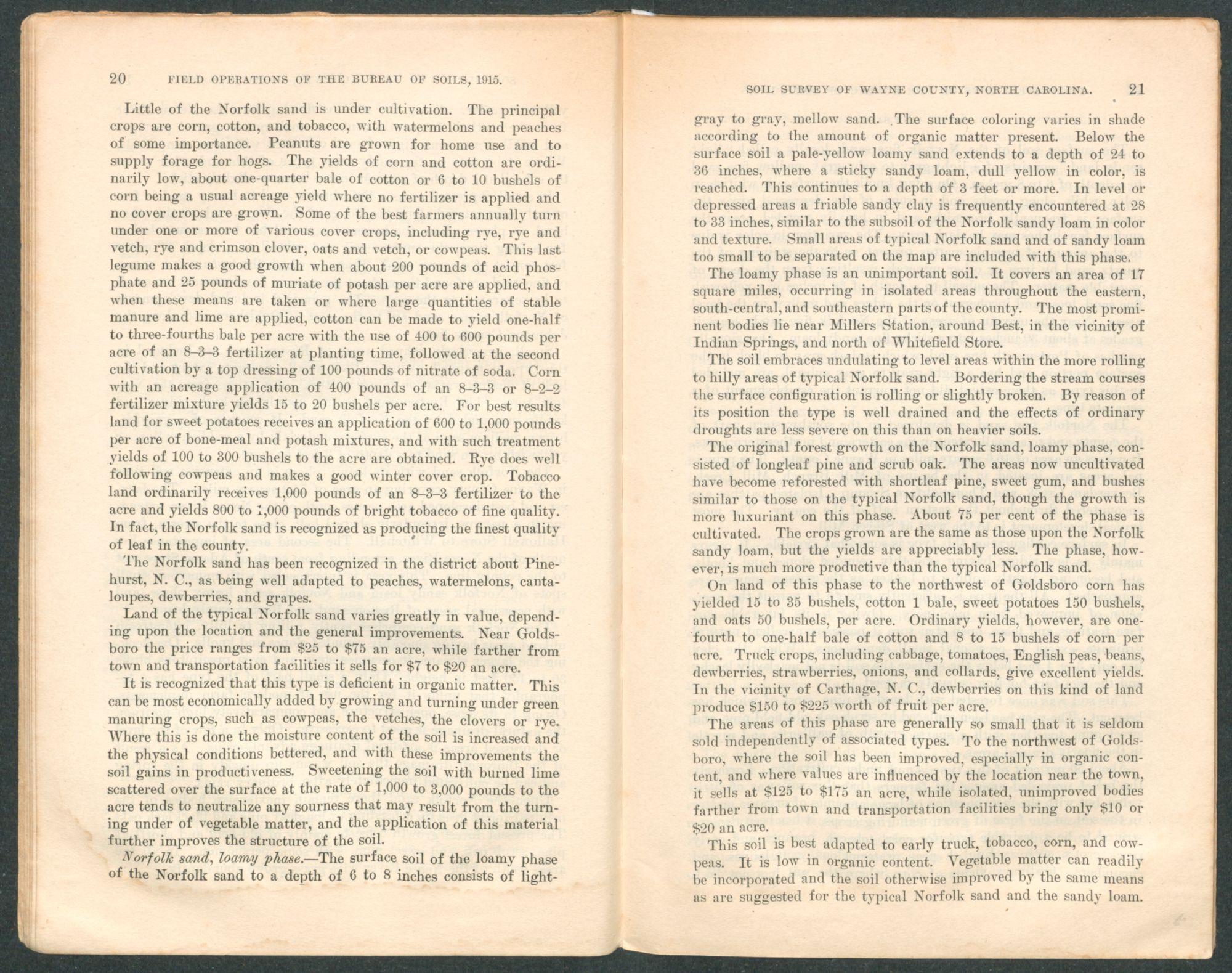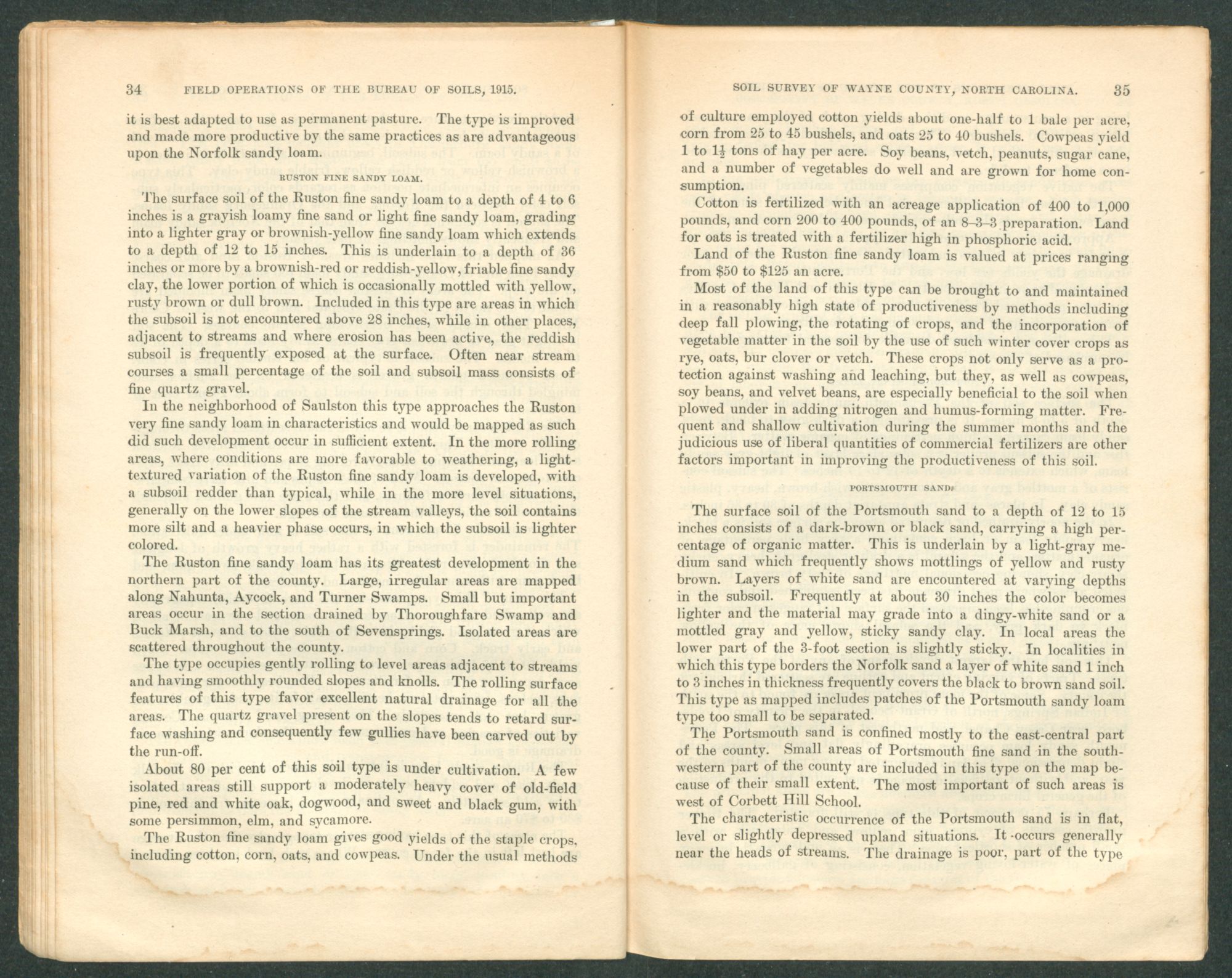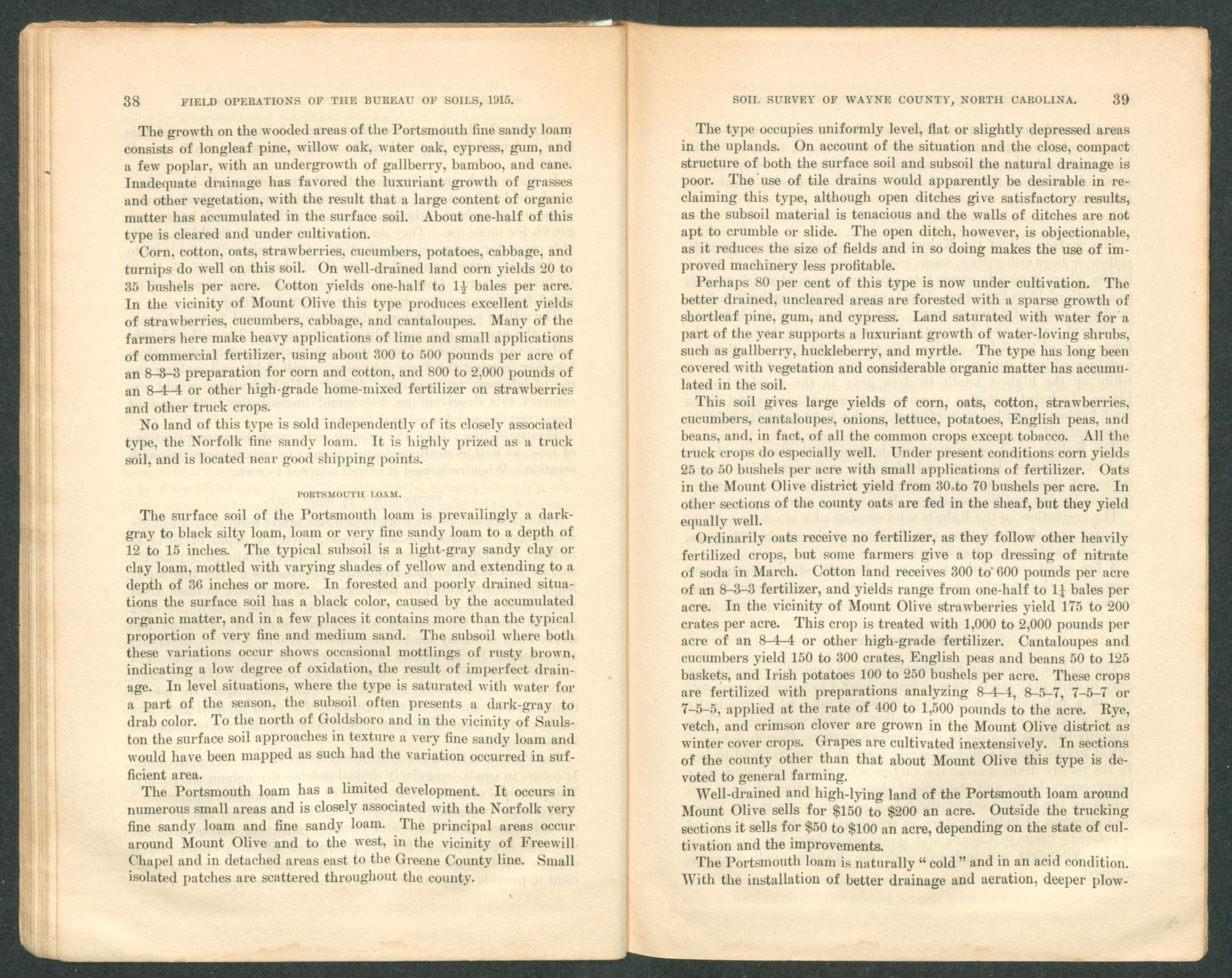 Well-drained and high-lying land of the Portsmouth loam around Mount Olive sells for $150 to $200 an acre. Outside the trucking sections it sells for $50 to $100 an acre, depending on the state of cultivation and the improvements.