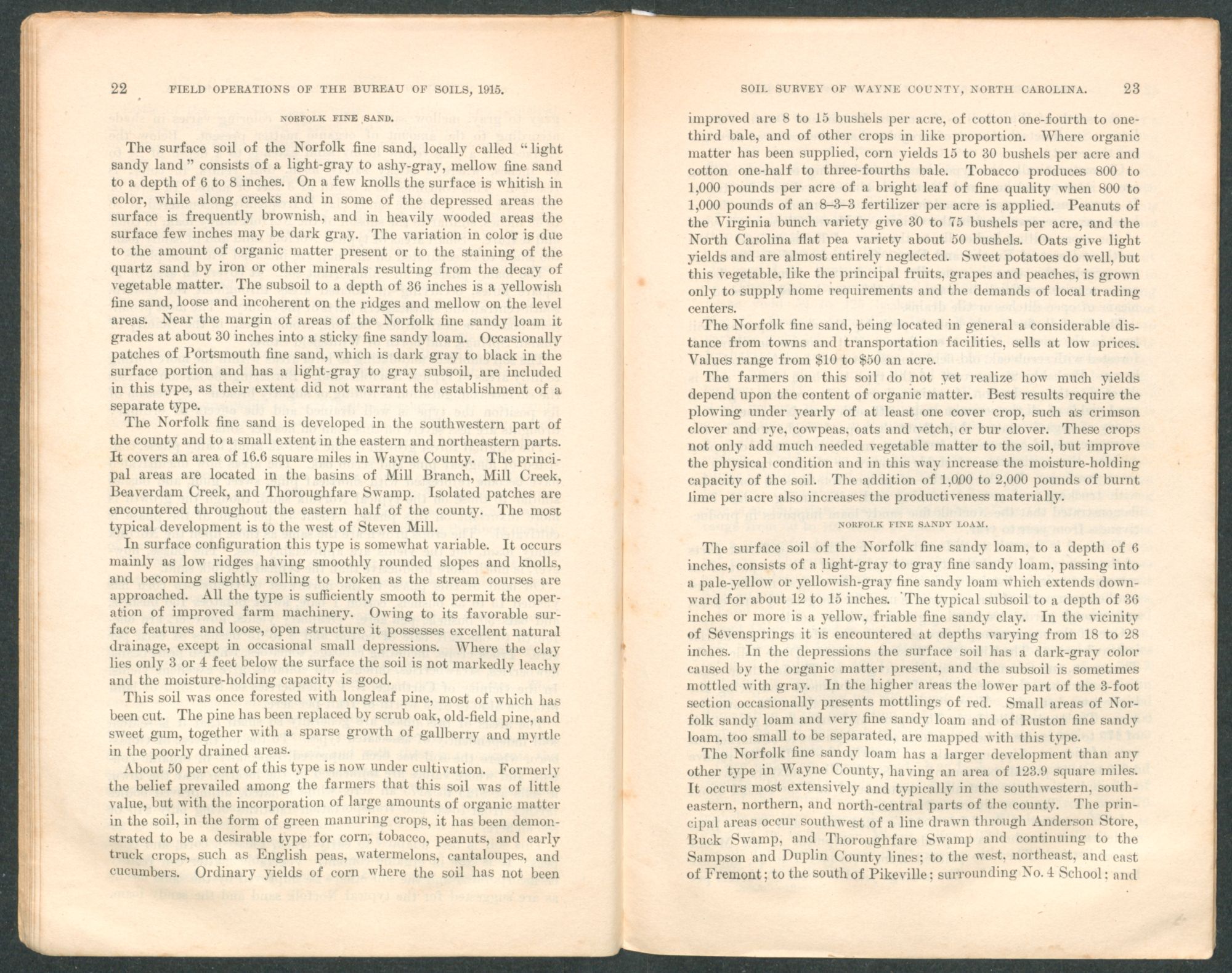 The Norfolk soils predominate throughout the county. They possess excellent natural drainage. They are adapted to cotton, corn, tobacco, peanuts, cowpeas, crimson and bur clover, sweet and Irish potatoes, grapes, peaches, small fruits, and a wide range of truck crops.