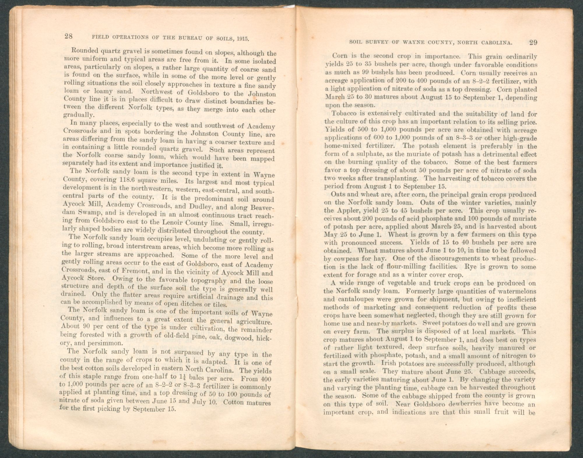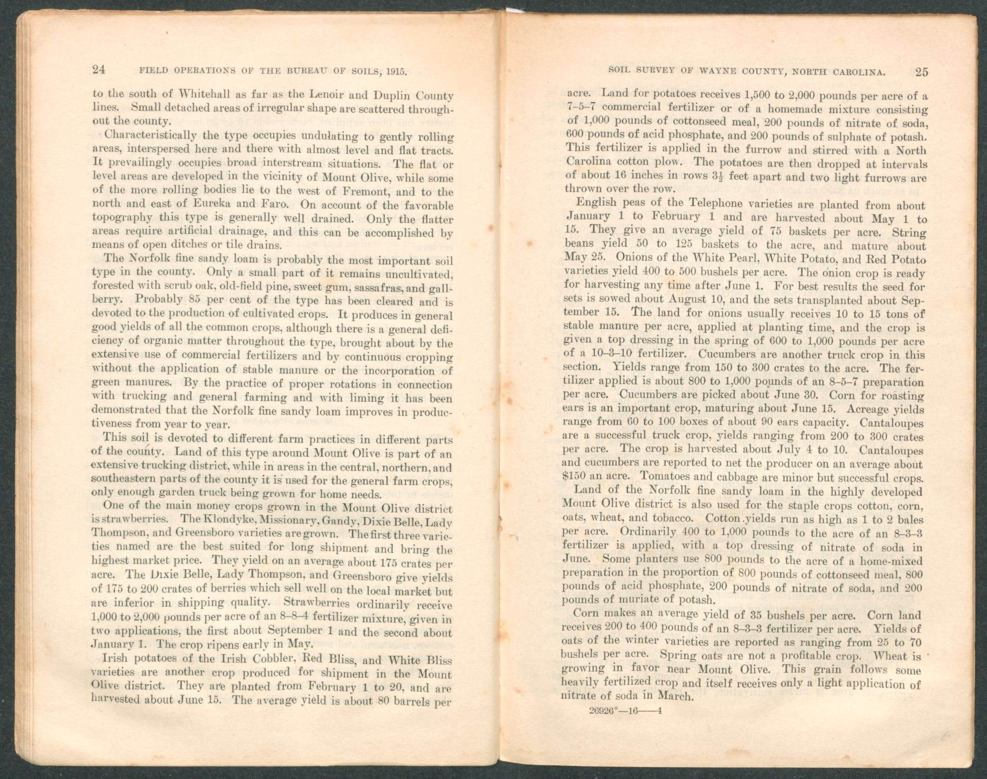 Ordinarily oats receive no fertilizer, as they follow other heavily fertilized crops, but some farmers give a top dressing of nitrate of soda in March. Cotton land receives 300 to 600 pounds per acre of an 8-3-3 fertilizer, and yields range from one-half to 1¼ bales per acre. In the vicinity of Mount Olive strawberries yield 175 to 200 crates per acre. This crop is treated with 1,000 to 2,000 pounds per acre of an 8-4-4 or other high-grade fertilizer. Cantaloupes and cucumbers yield 150 to 300 crates, English peas and beans 50 to 125 baskets, and Irish potatoes 100 to 250 bushels per acre. These crops are fertilized with preparations analyzing 8-4-4, 8-5-7, 7-5-7 or 7-5-5, applied at the rate of 400 to 1,500 pounds to the acre. Rye, vetch, and crimson clover are grown in the Mount Olive district as winter cover crops. Grapes are cultivated inextensively. In sections of the county other than that about Mount Olive this type is devoted to general farming.