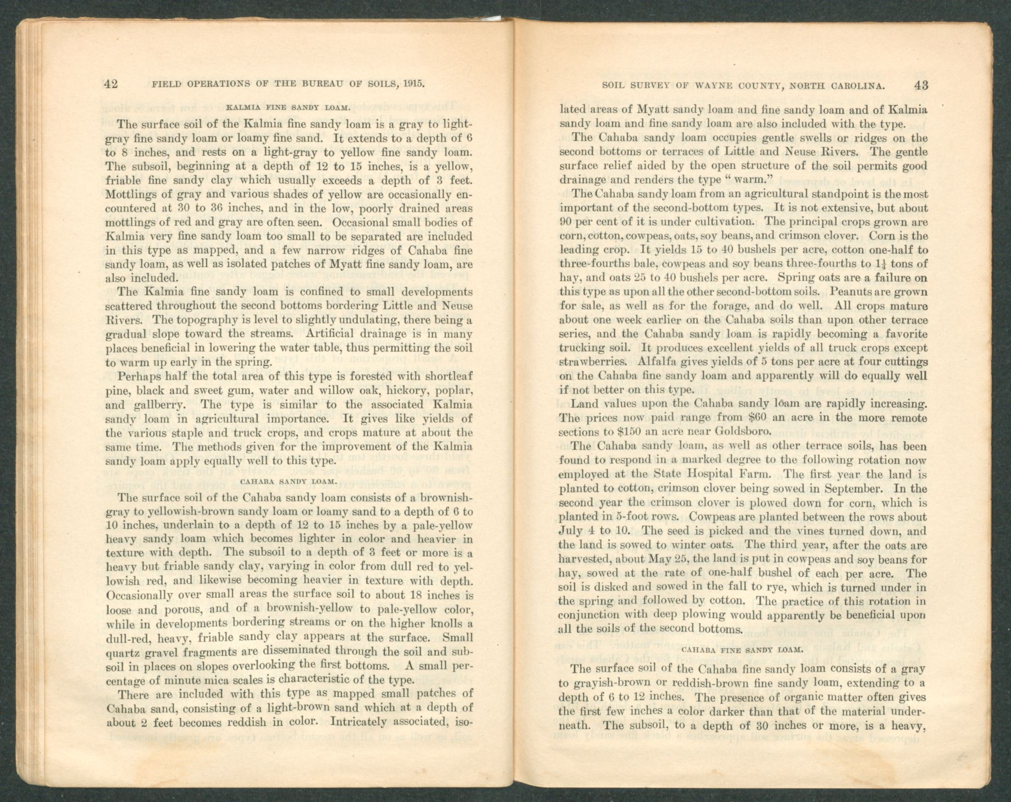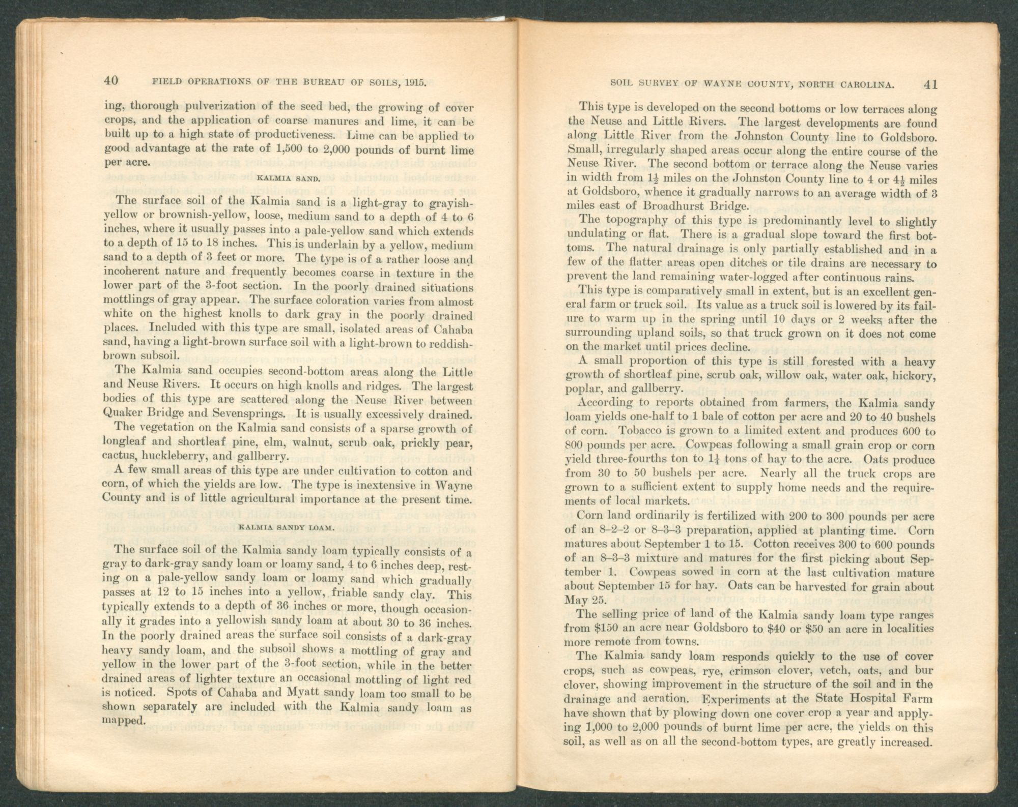 The selling price of land of the Kalmia sandy loam type ranges from $150 an acre near Goldsboro to $40 or $50 an acre in localities more remote from towns.