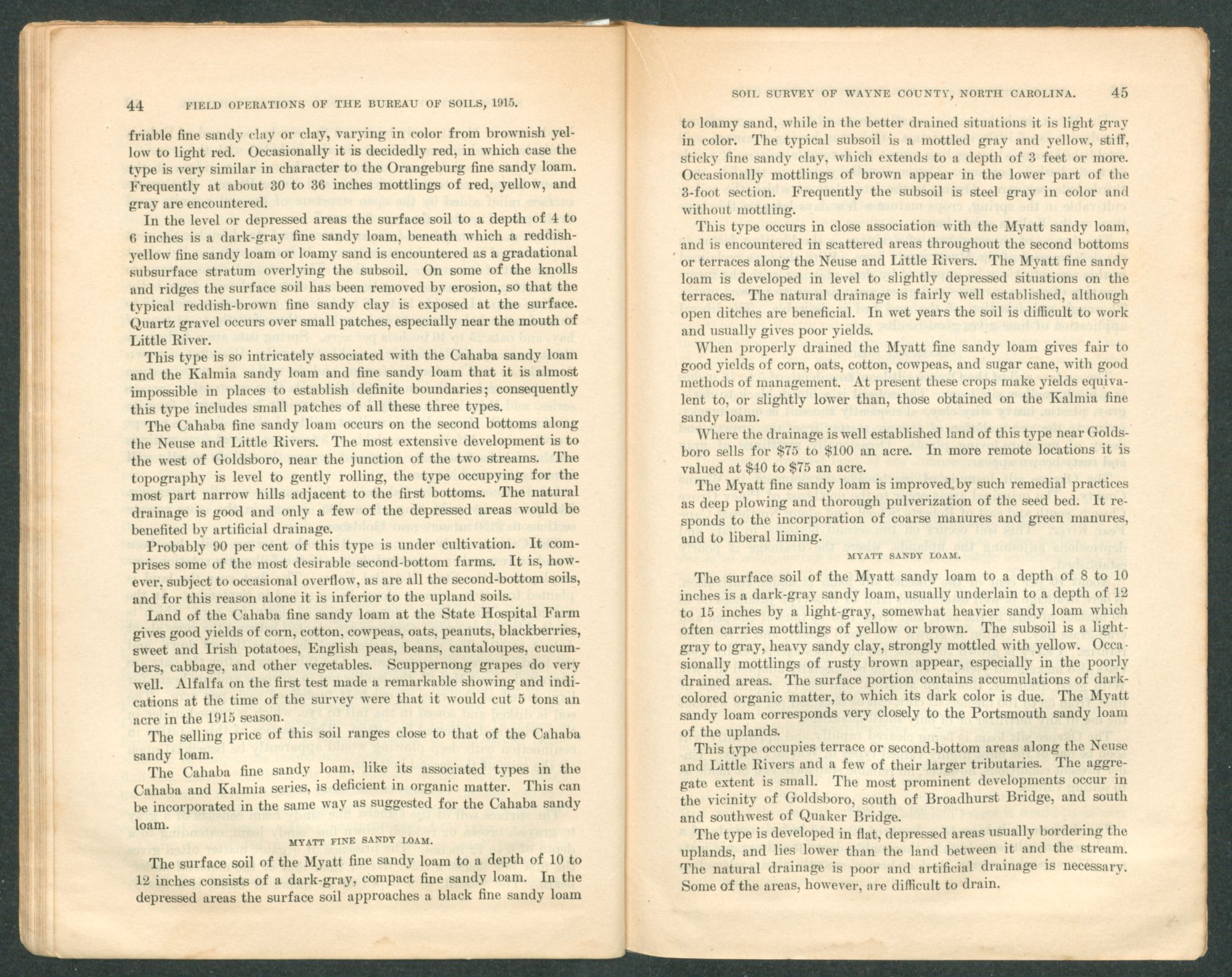 This type occurs in close association with the Myatt sandy loam, and is encountered in scattered areas throughout the second bottoms or terraces along the Neuse and Little Rivers. The Myatt fine sandy loam is developed in level to slightly depressed situations on the terraces. The natural drainage is fairly well established, although open ditches are beneficial. In wet years the soil is difficult to work and usually gives poor yields.
