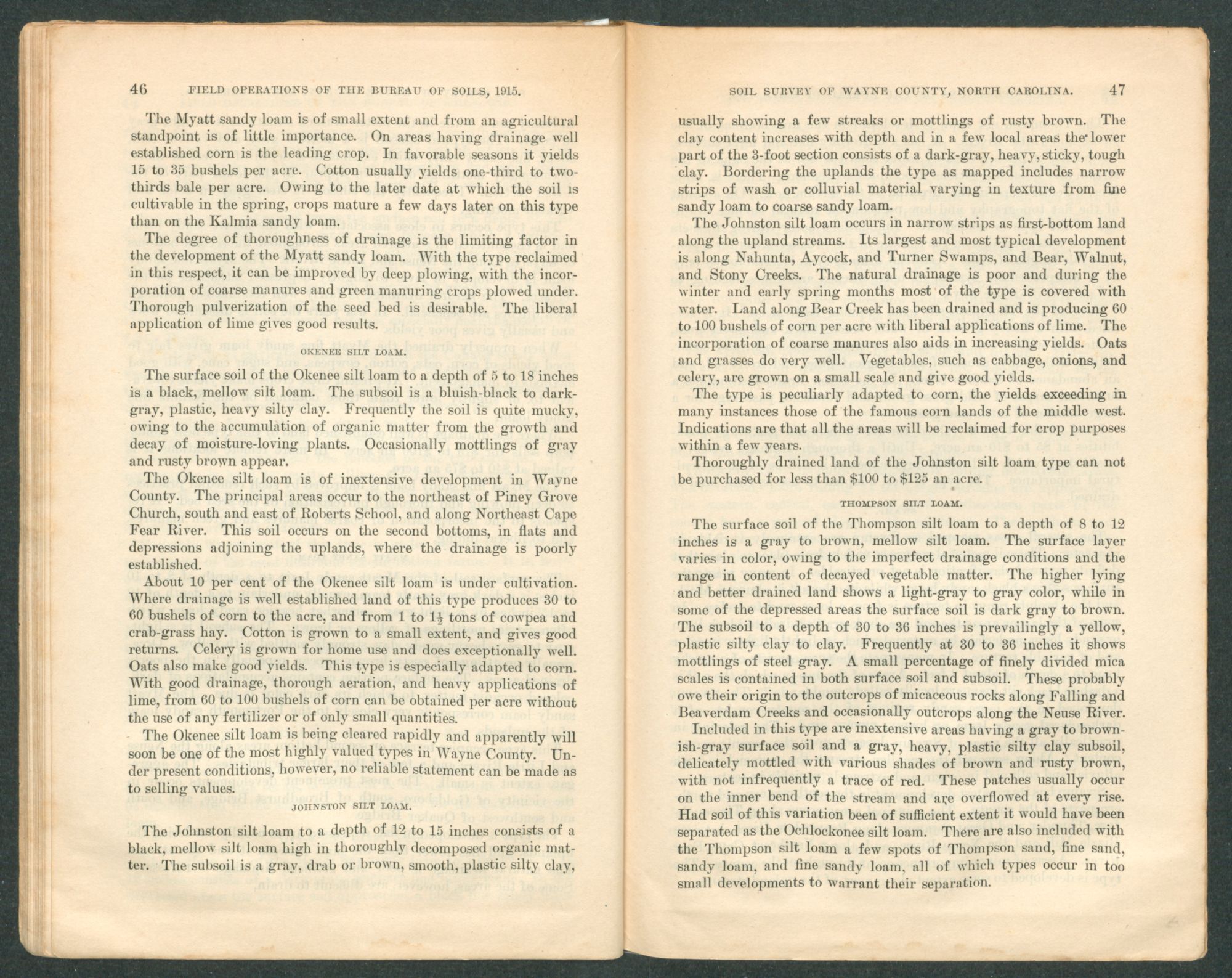 The Johnston silt loam occurs in narrow strips as first-bottom land along the upland streams. Its largest and most typical development is along Nahunta, Aycock, and Turner Swamps, and Bear, Walnut, and Stony Creeks. The natural drainage is poor and during the winter and early spring months most of the type is covered with water. Land along Bear Creek has been drained and is producing 60 to 100 bushels of corn per acre with liberal applications of lime. The incorporation of coarse manures also aids in increasing yields. Oats and grasses do very well. Vegetables, such as cabbage, onions, and celery, are grown on a small scale and give good yields.