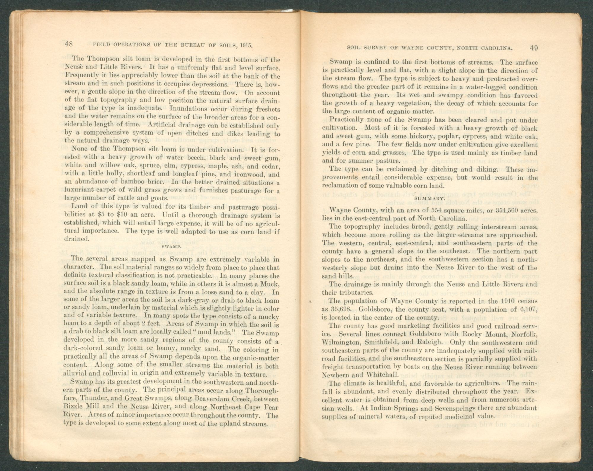Swamp has its greatest development in the southwestern and northern parts of the county. The principal areas occur along Thorough-fare, Thunder, and Great Swamps, along Beaverdam Creek, between Bizzle Mill and the Neuse River, and along Northeast Cape Fear River. Areas of minor importance occur throughout the county. The type is developed to some extent along most of the upland streams.