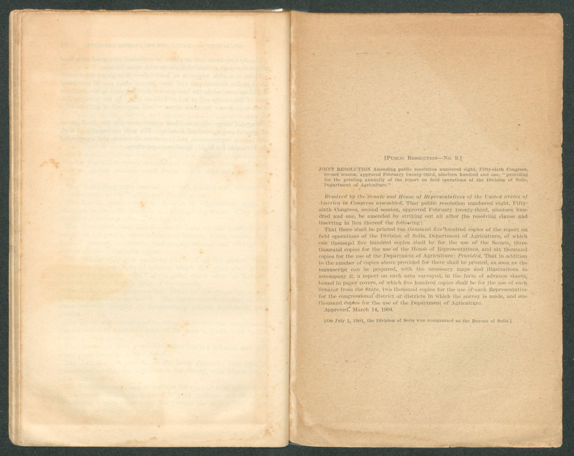 JOINT RESOLUTION Amending public resolution numbered eight, Fifty-sixth Congress, second session, approved February twenty-third, nineteen hundred and one, “providing for the printing annually of the report on field operations of the Division of Soils, Department of Agriculture.”