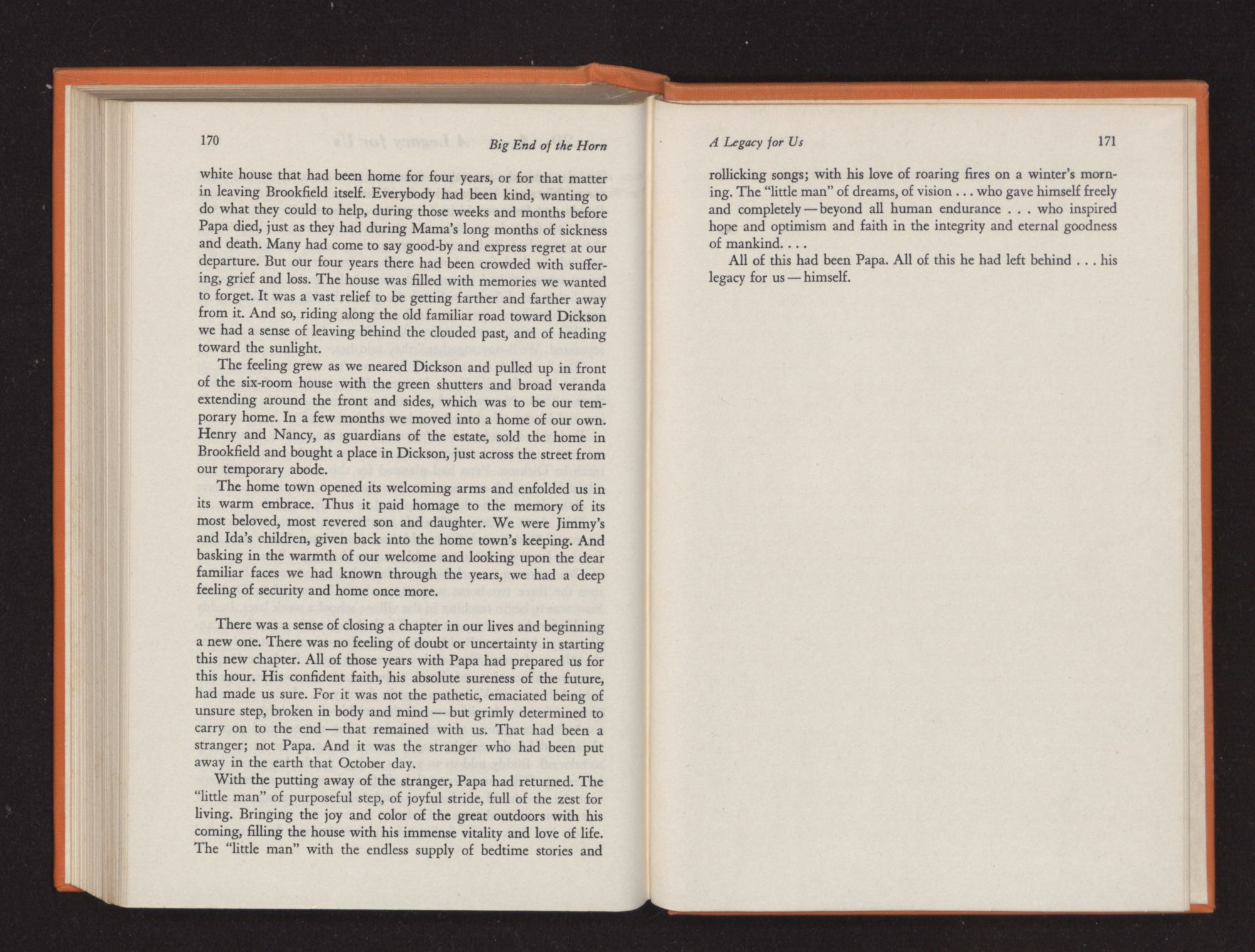 Only those who have actually experienced the birthing of a book can understand the labor pangs involved — especially if it be the author's first production. BIG END OF THE HORN has been a labor of love because it is chiefly about those nearest its author's heart.