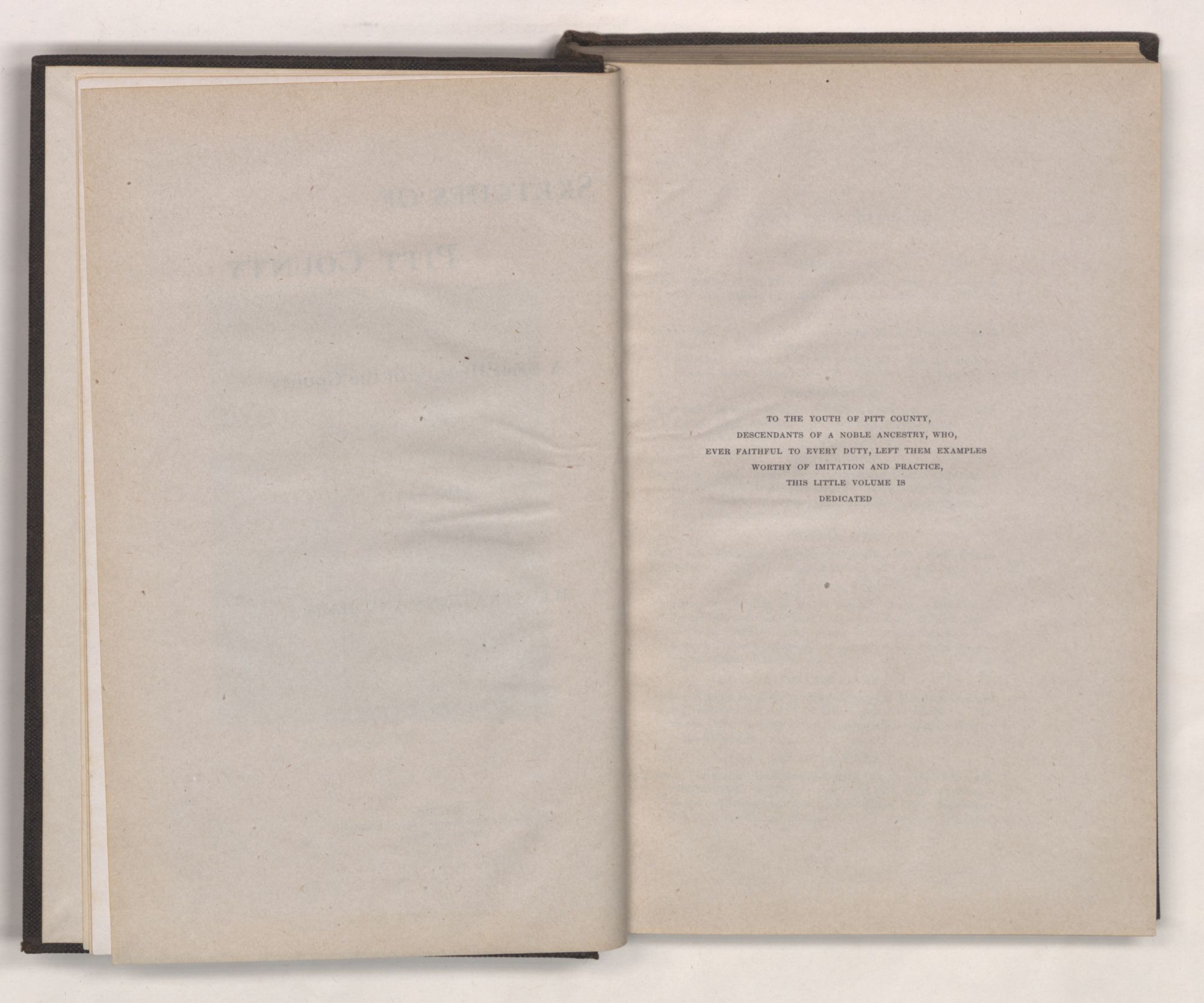 TO THE YOUTH OF PITT COUNTY, DESCENDANTS OF A NOBLE ANCESTRY, WHO, EVER FAITHFUL TO EVERY DUTY, LEFT THEM EXAMPLES WORTHY OF IMITATION AND PRACTICE, THIS LITTLE VOLUME IS DEDICATED