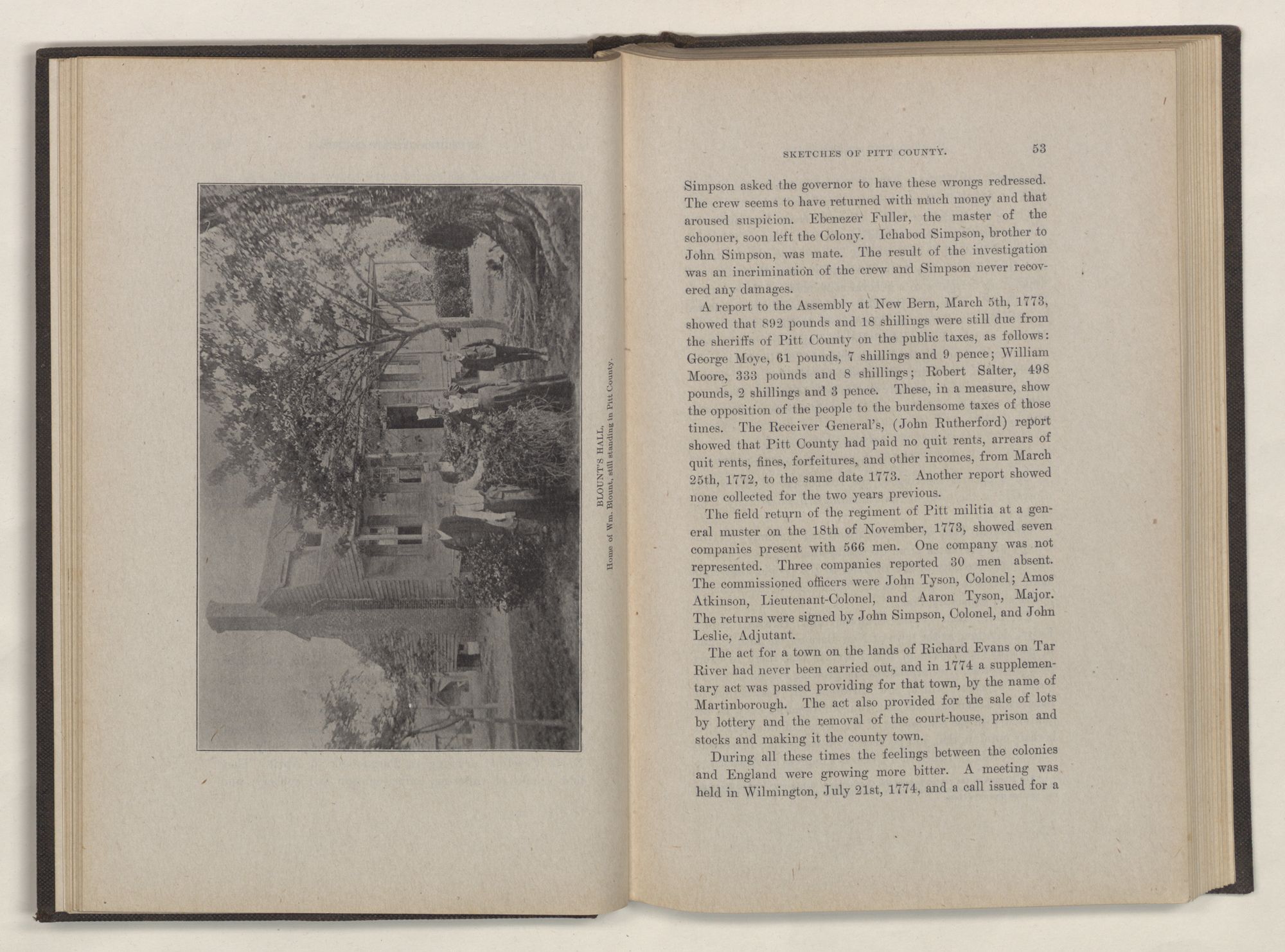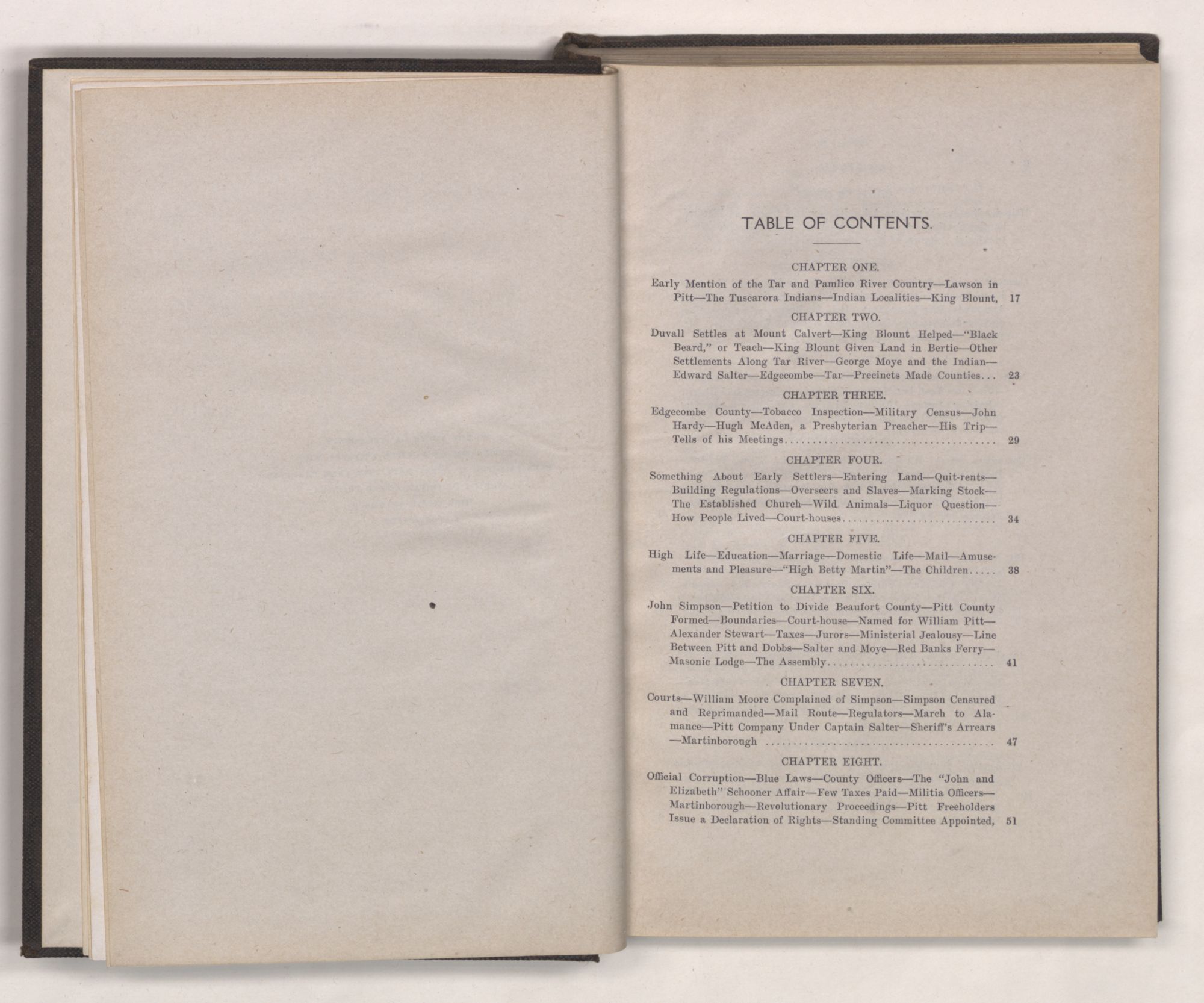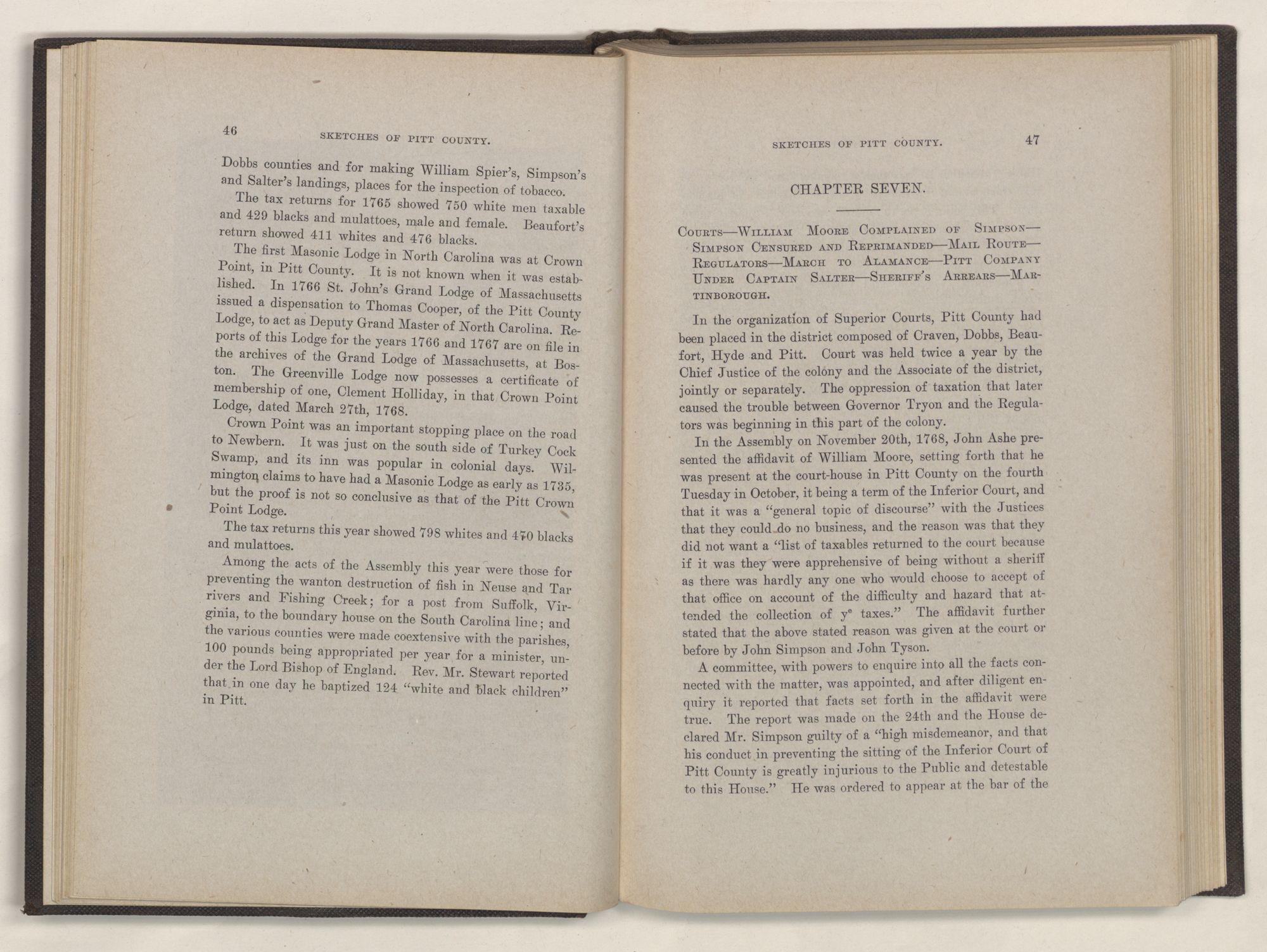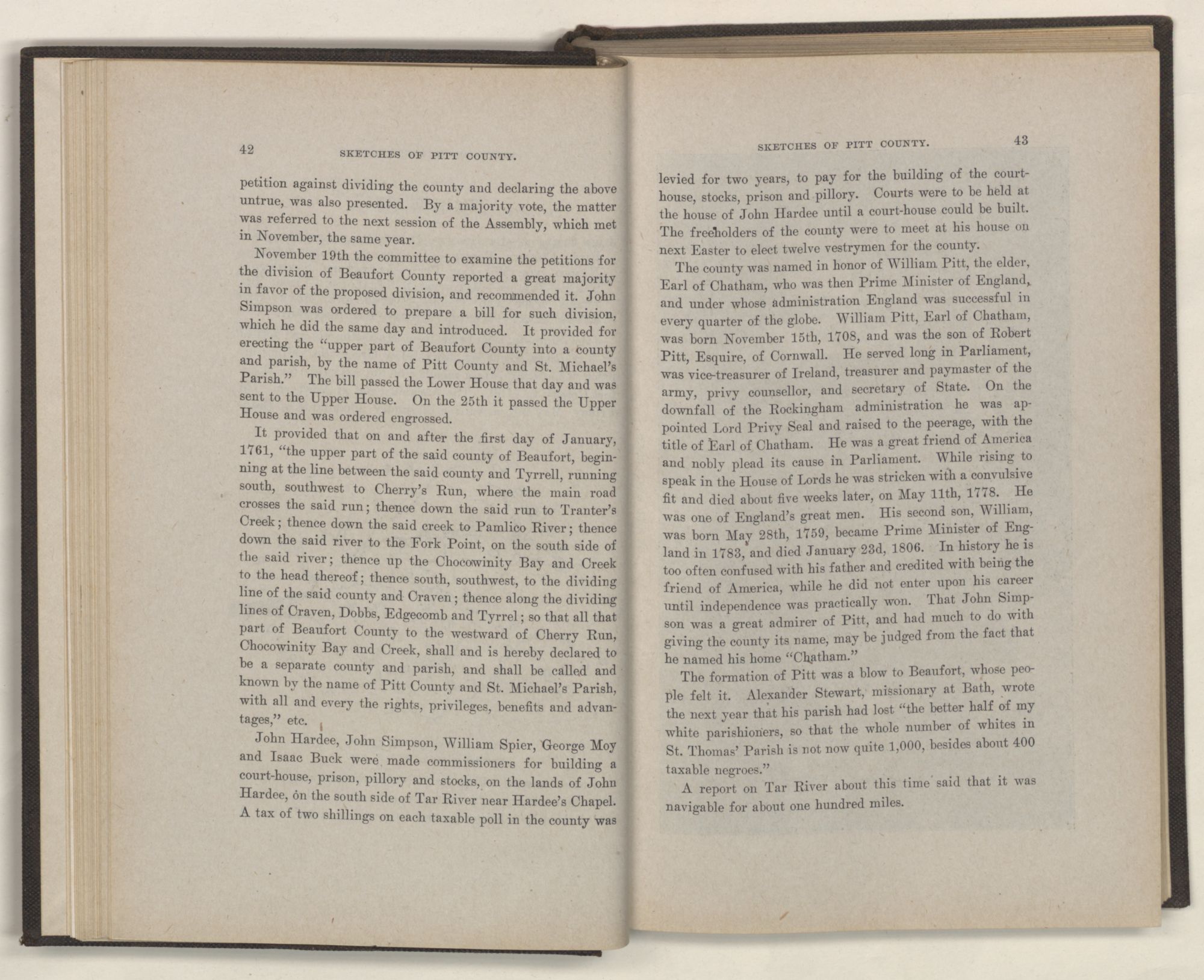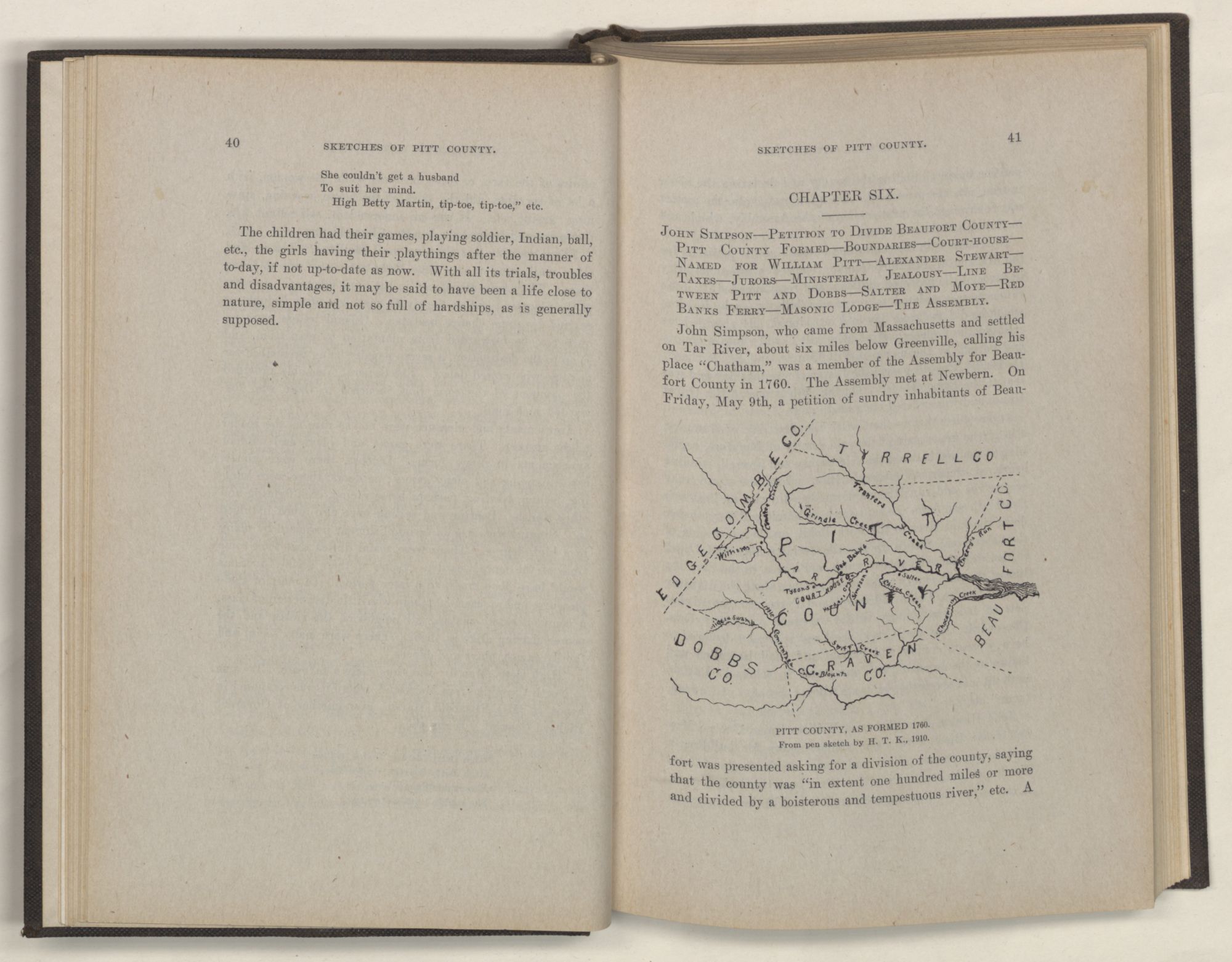 | CHAPTER SIX. John Simpson—Petition to Divide Beaufort County—Pitt County Formed—Boundaries—Court-house—Named for William Pitt—Alexander Stewart—Taxes—Jurors—Ministerial Jealousy—Line Between Pitt and Dobbs—Salter and Moye—Red Banks Ferry—Masonic Lodge—The Assembly | 41 |