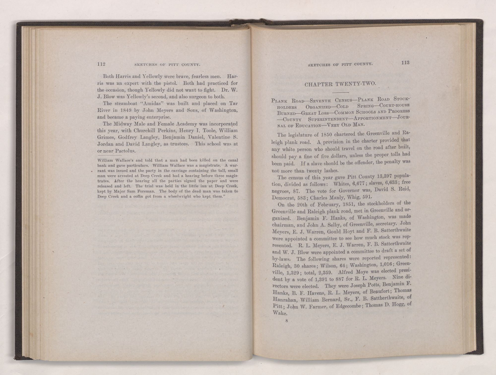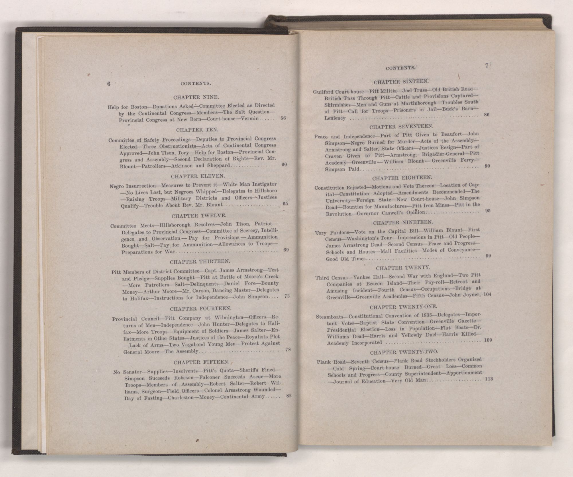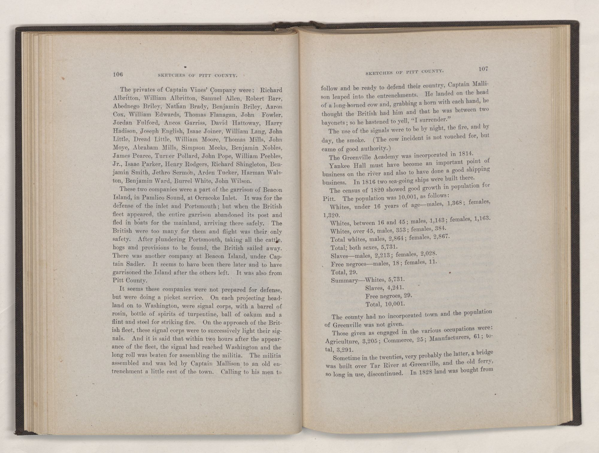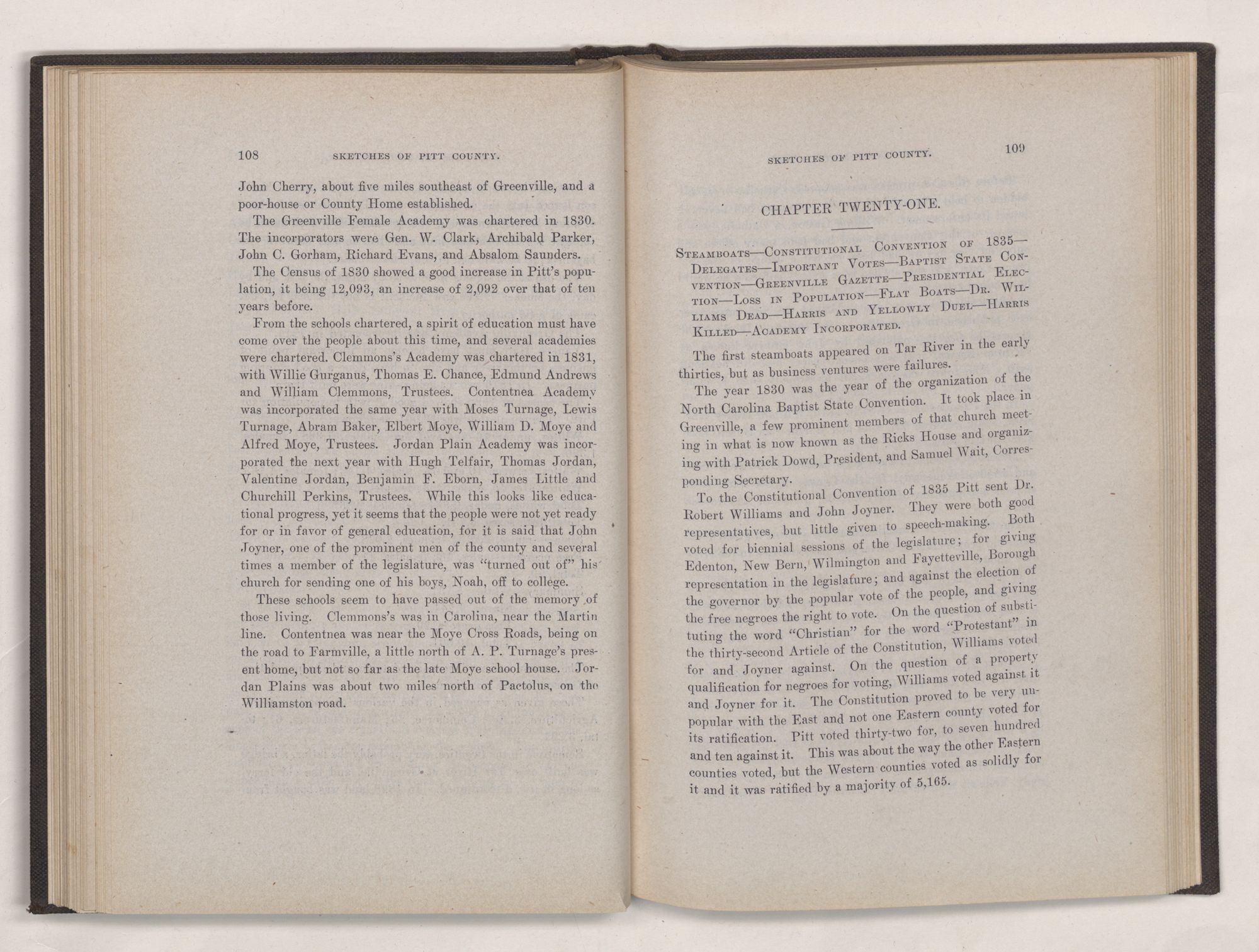 | CHAPTER TWENTY. Third Census—Yankee Hall—Second War with England—Two Pitt Companies at Beacon Island—Their Pay-roll—Retreat and Amusing Incident—Fourth Census—Occupations—Bridge at Greenville—Greenville Academies—Fifth Census—John Joyner, | 104 |