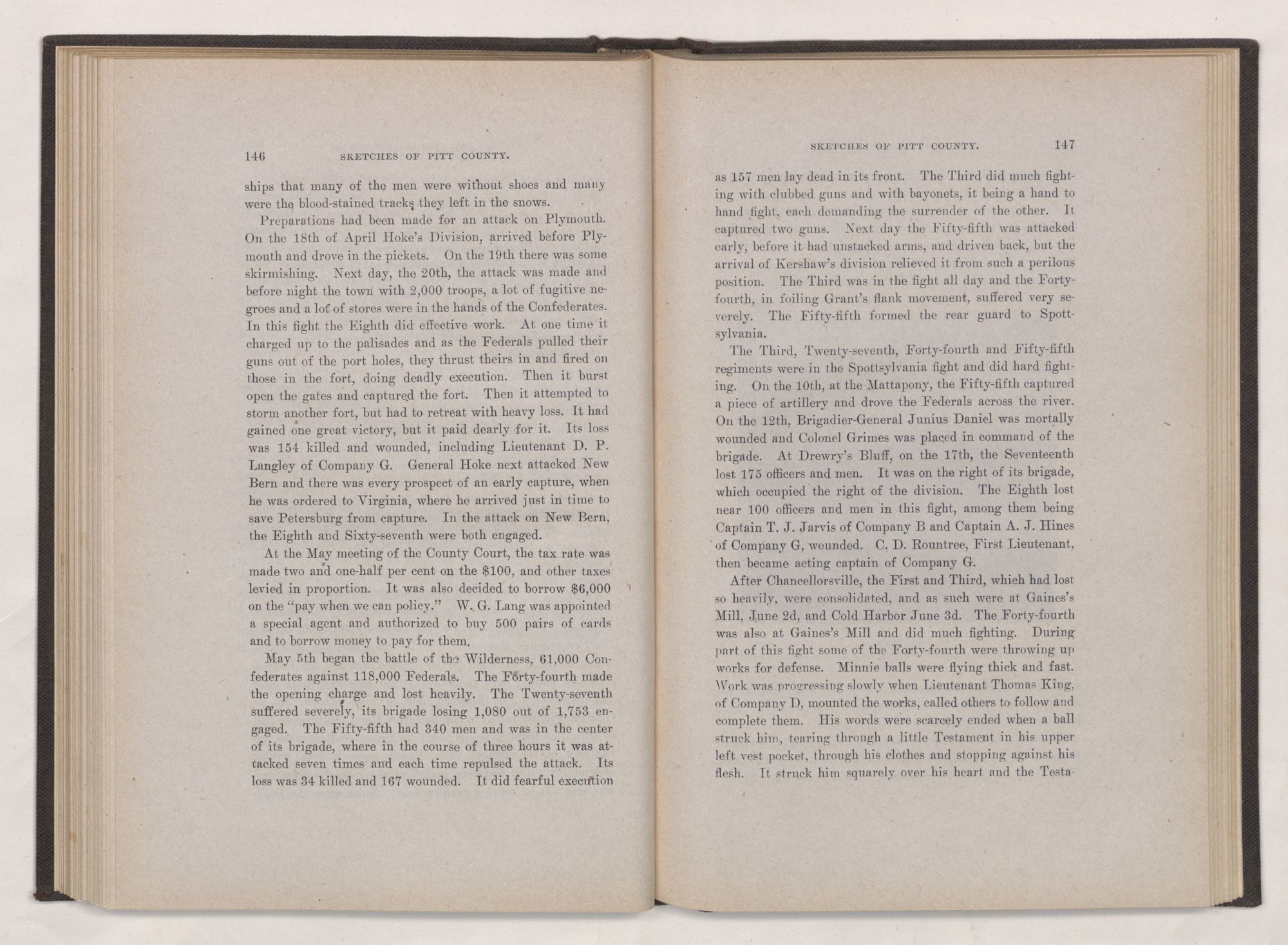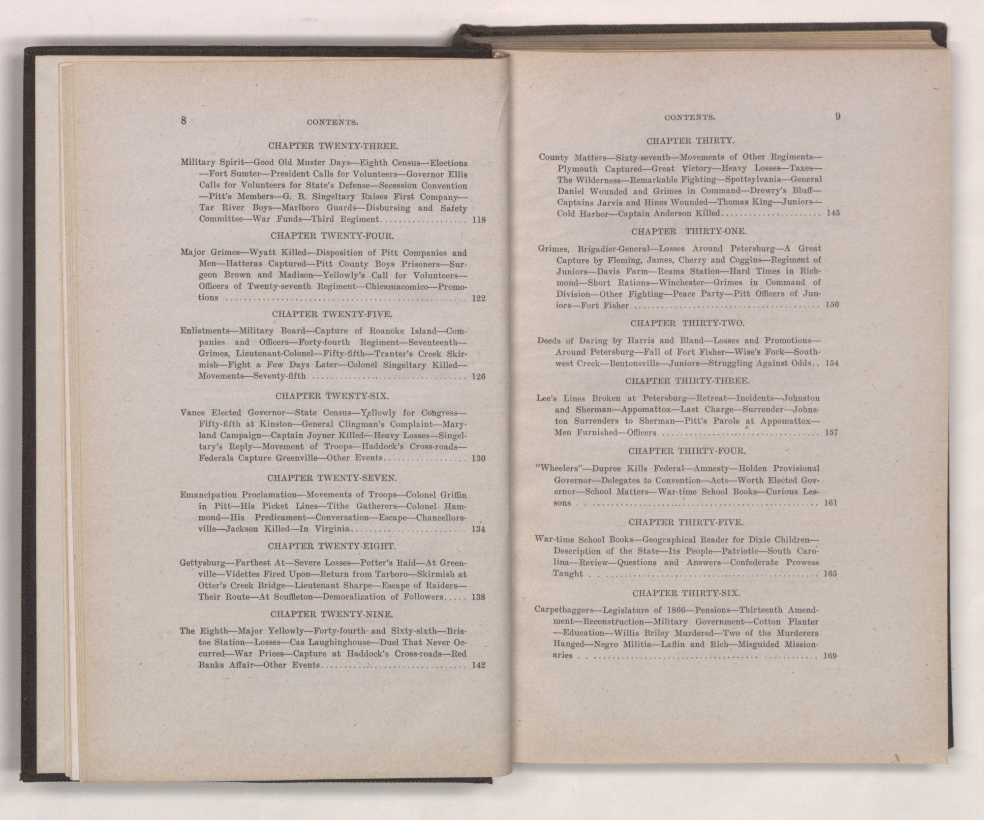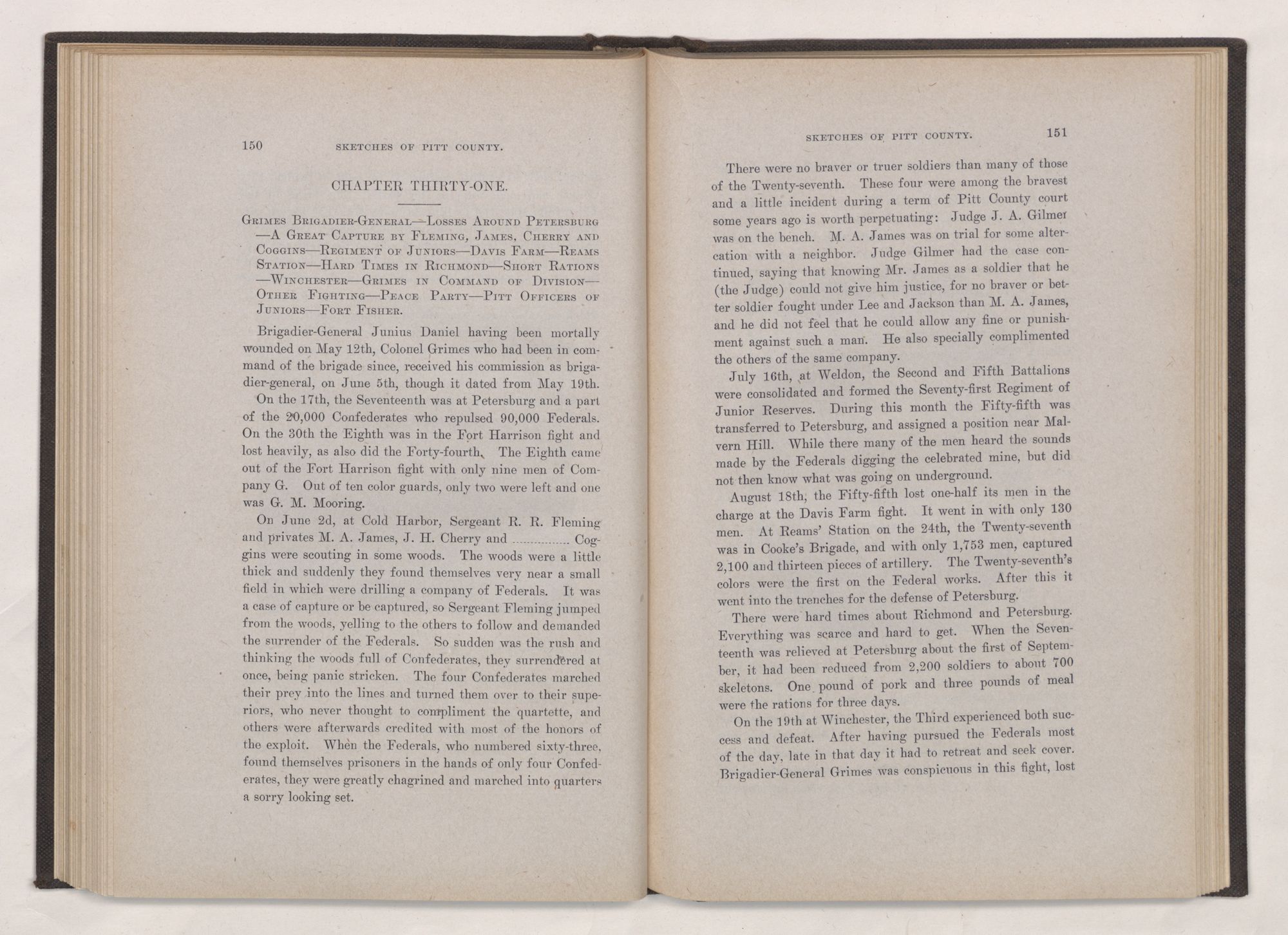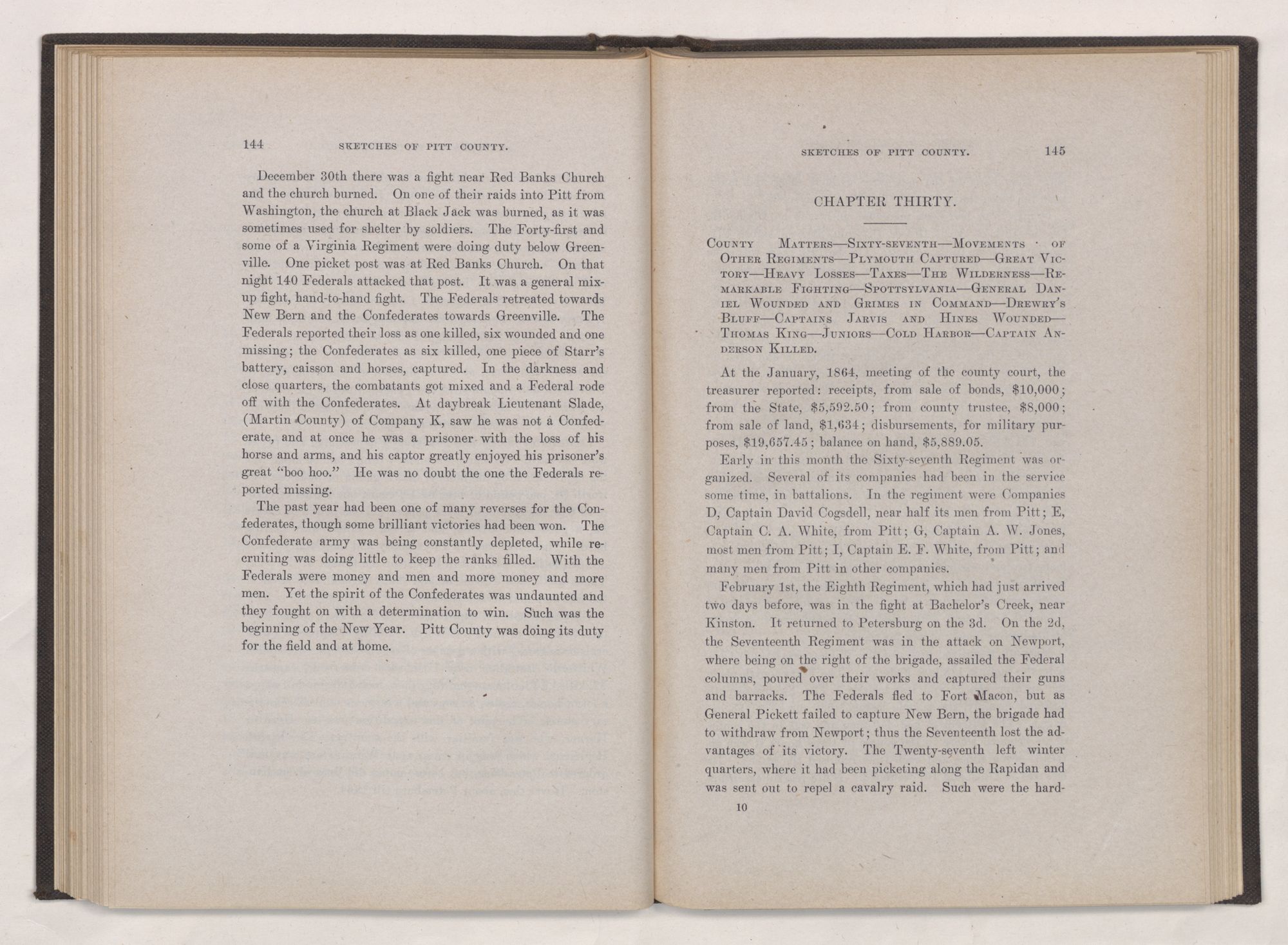 | CHAPTER THIRTY. County Matters—Sixty-seventh—Movements of Other Regiments—Plymouth Captured—Great Victory—Heavy Losses—Taxes—The Wilderness—Remarkable Fighting—Spottsylvania—General Daniel Wounded and Grimes in Command—Drewry's Bluff—Captains Jarvis and Hines Wounded—Thomas King—Juniors—Cold Harbor—Captain Anderson Killed | 145 |