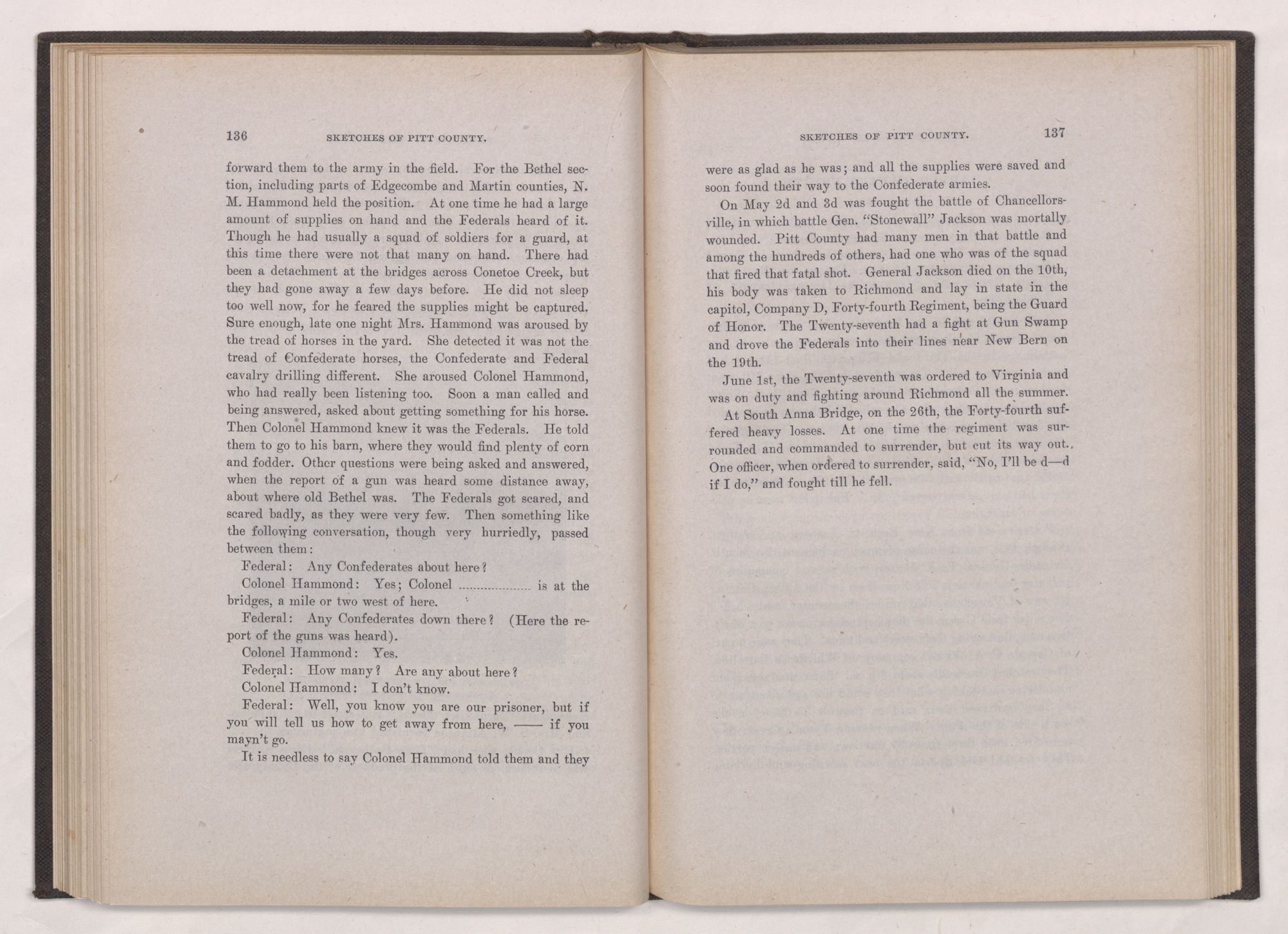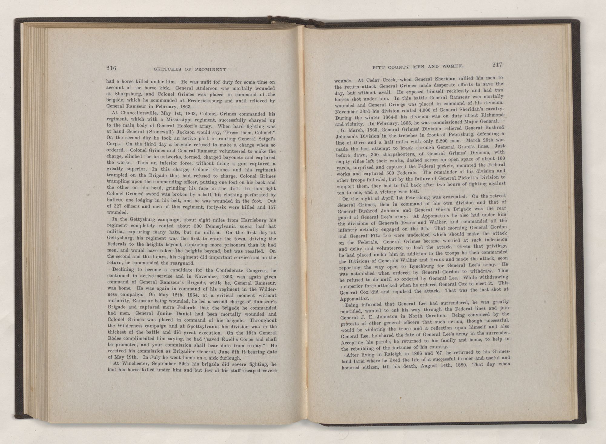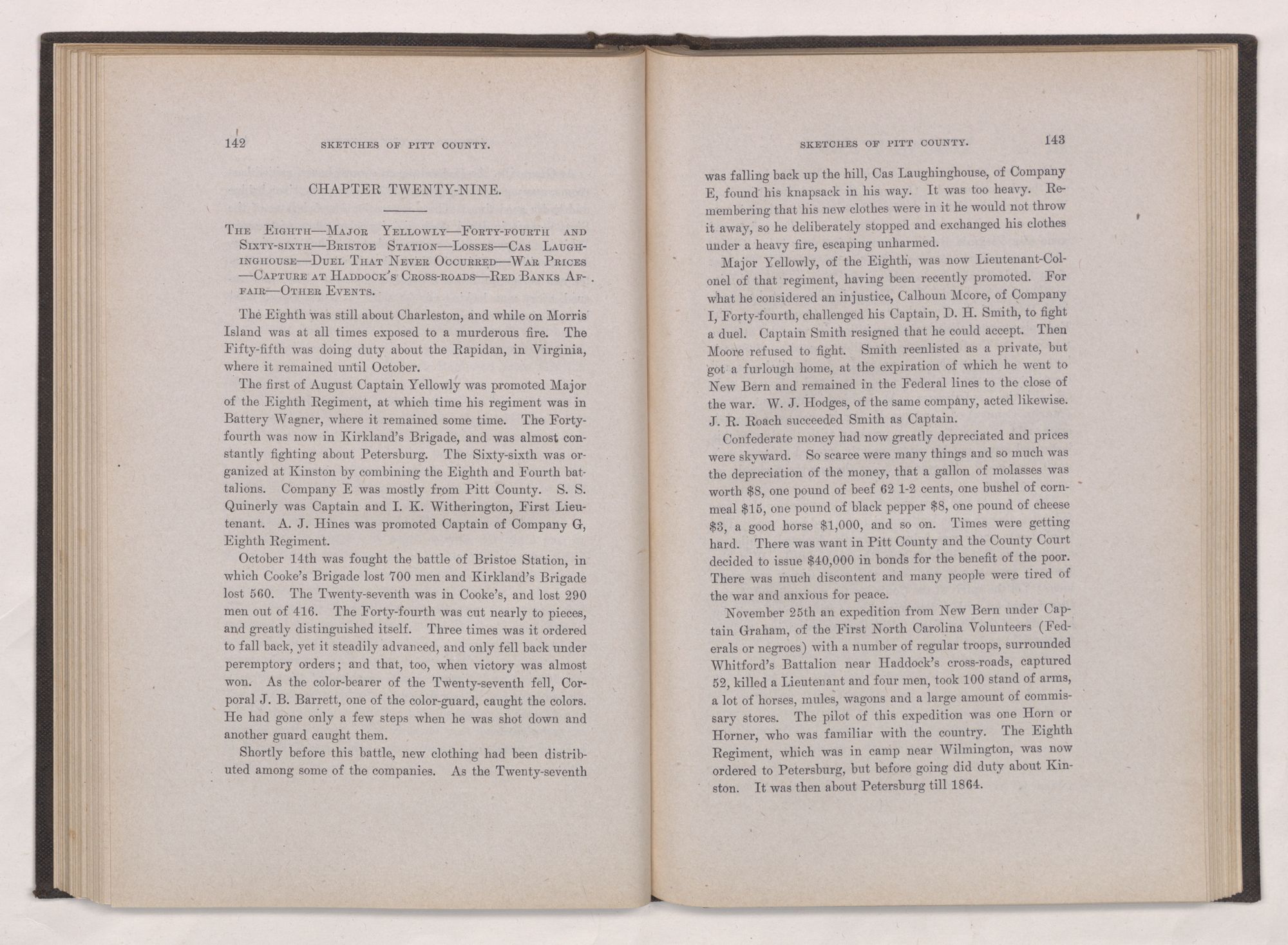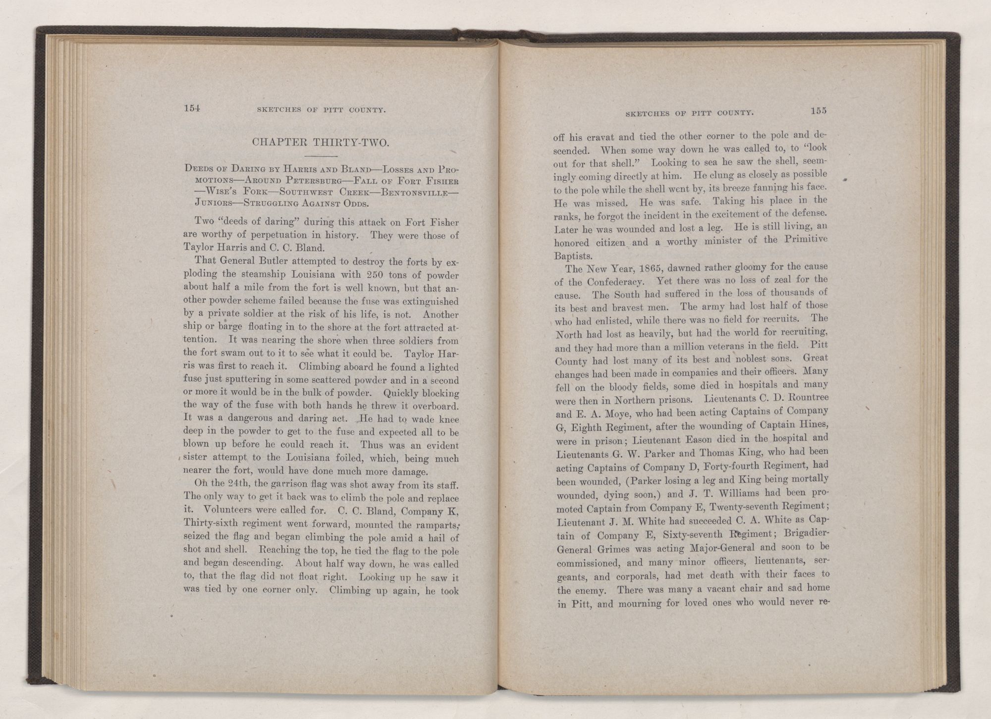 | CHAPTER THIRTY. County Matters—Sixty-seventh—Movements of Other Regiments—Plymouth Captured—Great Victory—Heavy Losses—Taxes—The Wilderness—Remarkable Fighting—Spottsylvania—General Daniel Wounded and Grimes in Command—Drewry's Bluff—Captains Jarvis and Hines Wounded—Thomas King—Juniors—Cold Harbor—Captain Anderson Killed | 145 |