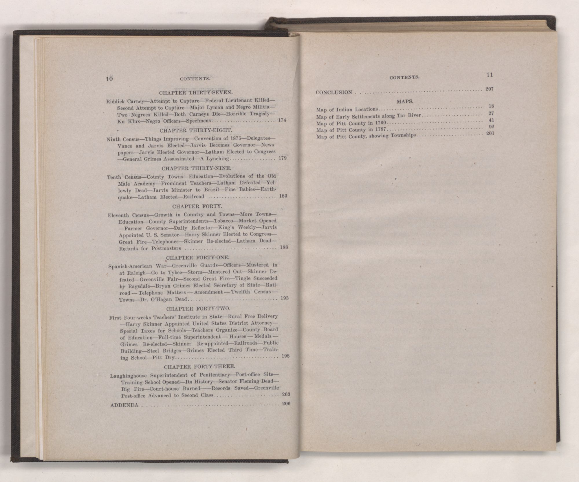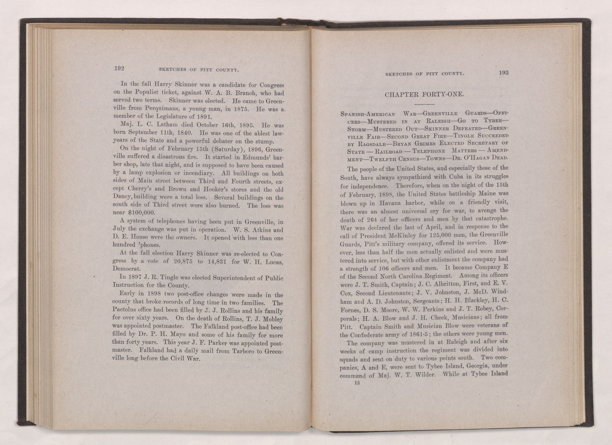 | CHAPTER FORTY-ONE. Spanish-American War—Greenville Guards—Officers—Mustered in at Raleigh—Go to Tybee—Storm—Mustered Out—Skinner Defeated—Greenville Fair—Second Great Fire—Tingle Succeeded by Ragsdale—Bryan Grimes Elected Secretary of State—Railroad — Telephone Matters — Amendment — Twelfth Census — Towns—Dr. O'Hagan Dead | 193 |