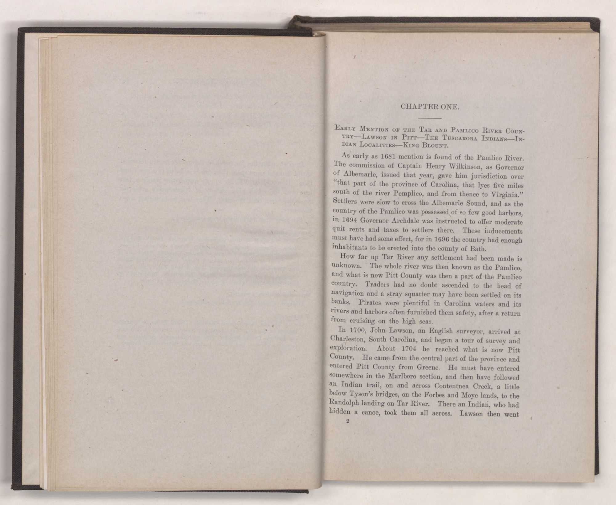 | CHAPTER ONE. Early Mention of the Tar and Pamlico River Country—Lawson in Pitt—The Tuscarora Indians—Indian Localities—King Blount, | 17 |