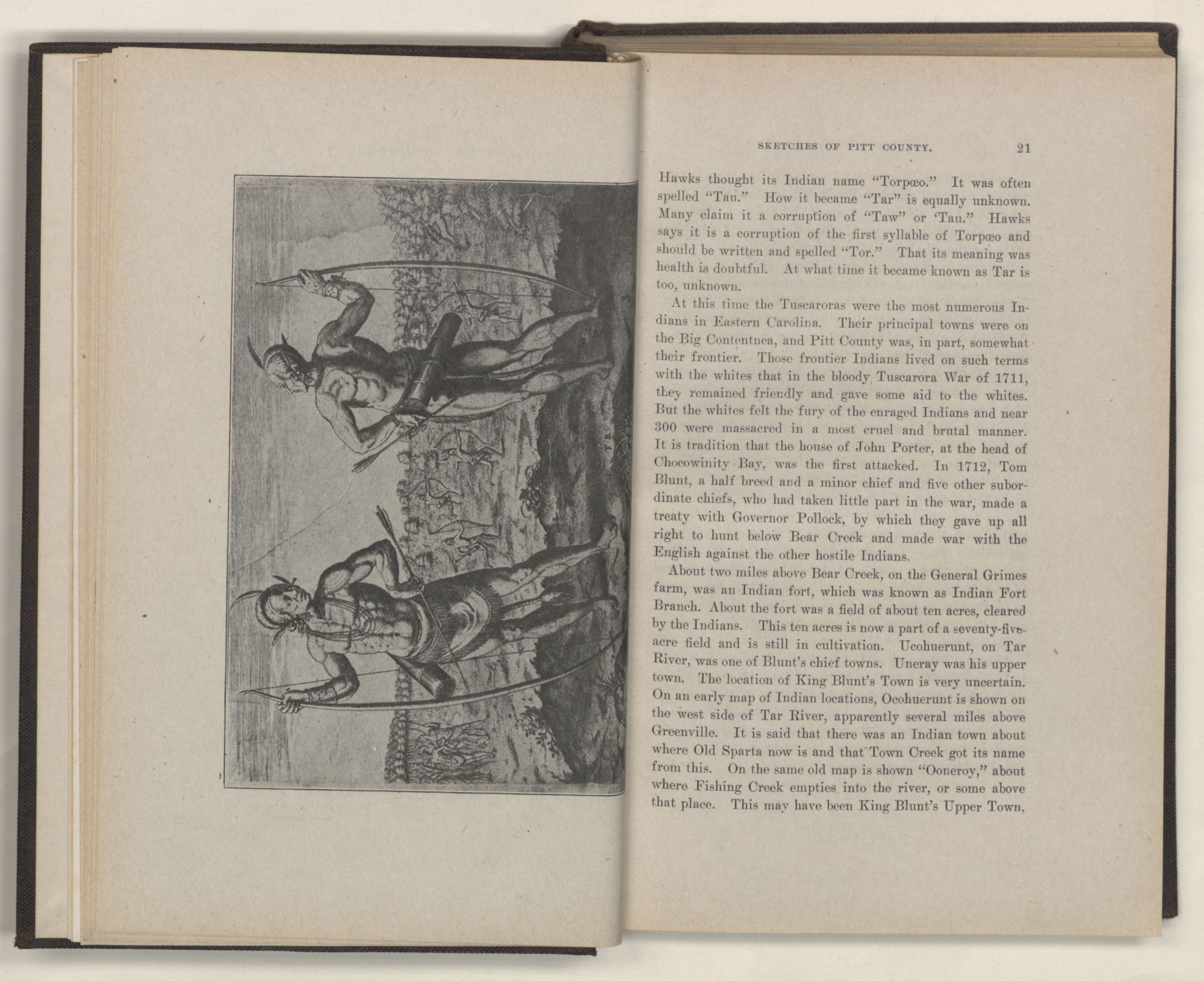 About two miles above Bear Creek, on the General Grimes farm, was an Indian fort, which was known as Indian Fort Branch. About the fort was a field of about ten acres, cleared by the Indians. This ten acres is now a part of a seventy-five-acre field and is still in cultivation. Ucohuerunt, on Tar River, was one of Blunt's chief towns. Uneray was his upper town. The location of King Blunt's Town is very uncertain. On an early map of Indian locations, Ocohuerunt is shown on the west side of Tar River, apparently several miles above Greenville. It is said that there was an Indian town about where Old Sparta now is and that Town Creek got its name from this. On the same old map is shown “Ooneroy,” about where Fishing Creek empties into the river, or some above that place. This may have been King Blunt's Upper Town,