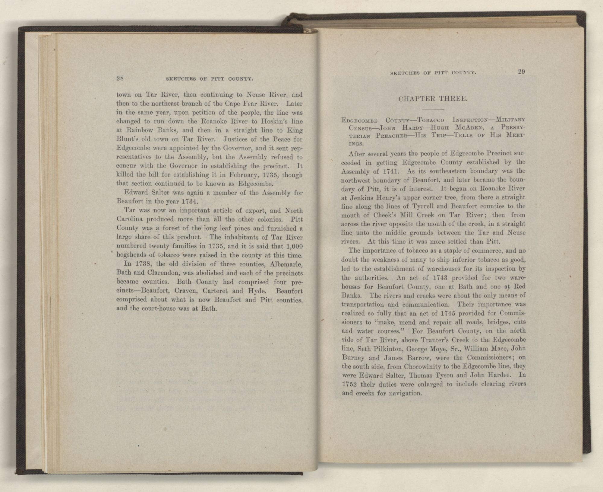 | CHAPTER THREE. Edgecombe County—Tobacco Inspection—Military Census—John Hardy—Hugh McAden, a Presbyterian Preacher—His Trip—Tells of his Meetings | 29 |