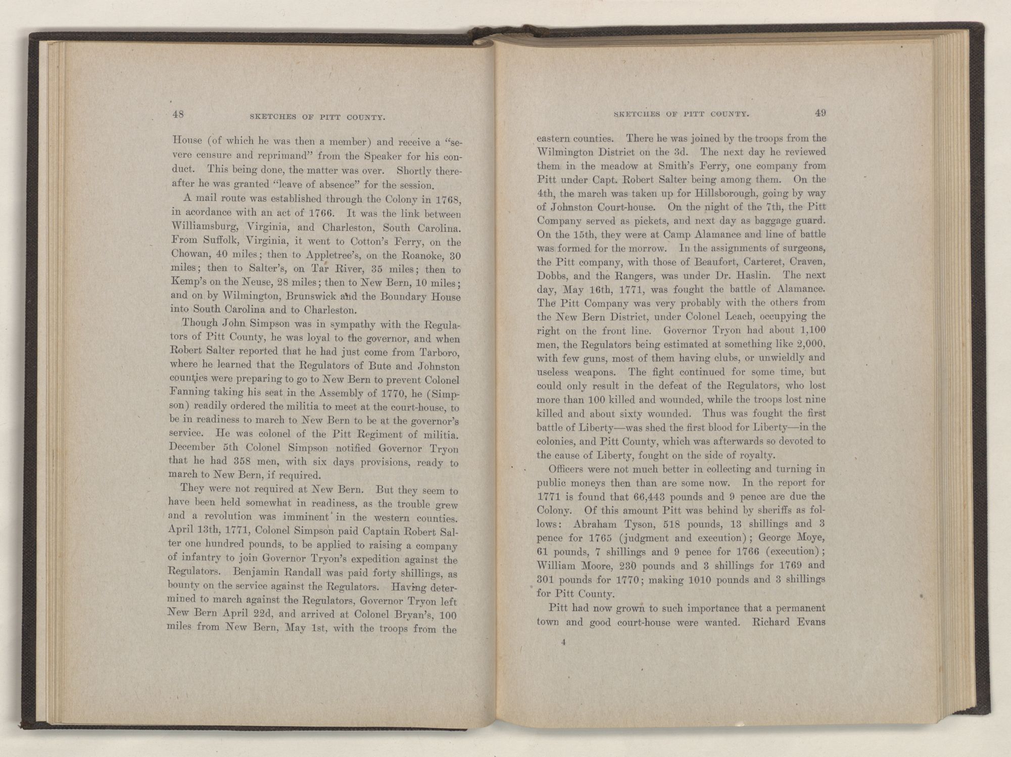 | CHAPTER SEVEN. Courts—William Moore Complained of Simpson—Simpson Censured and Reprimanded—Mail Route—Regulators—March to Alamance—Pitt Company Under Captain Salter—Sheriff's Arrears—Martinborough | 47 |