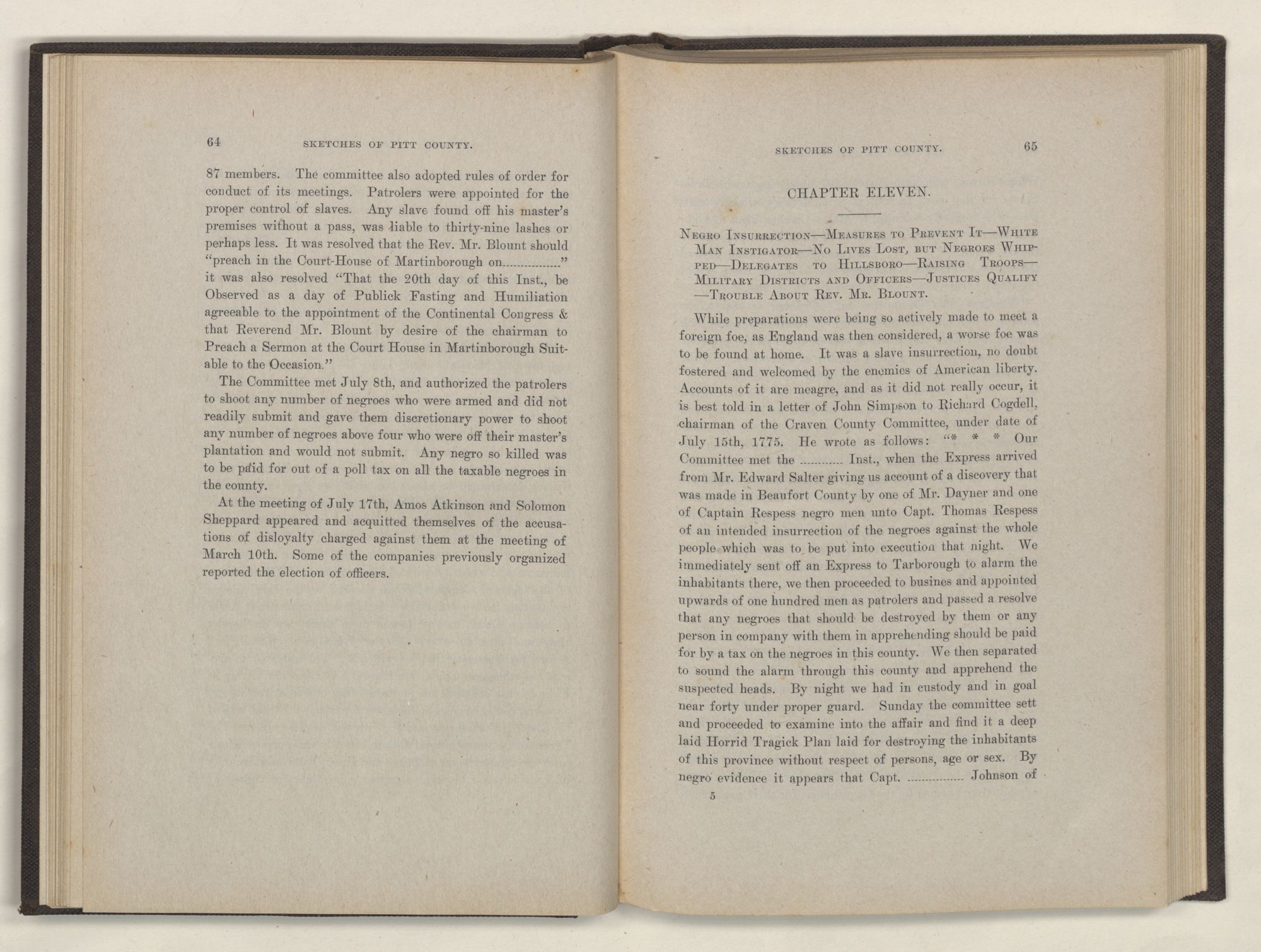 | CHAPTER ELEVEN. Negro Insurrection—Measures to Prevent it—White Man Instigator—No Lives Lost, but Negroes Whipped—Delegates to Hillsboro—Raising Troops—Military Districts and Officers—Justices Qualify—Trouble About Rev. Mr. Blount | 65 |