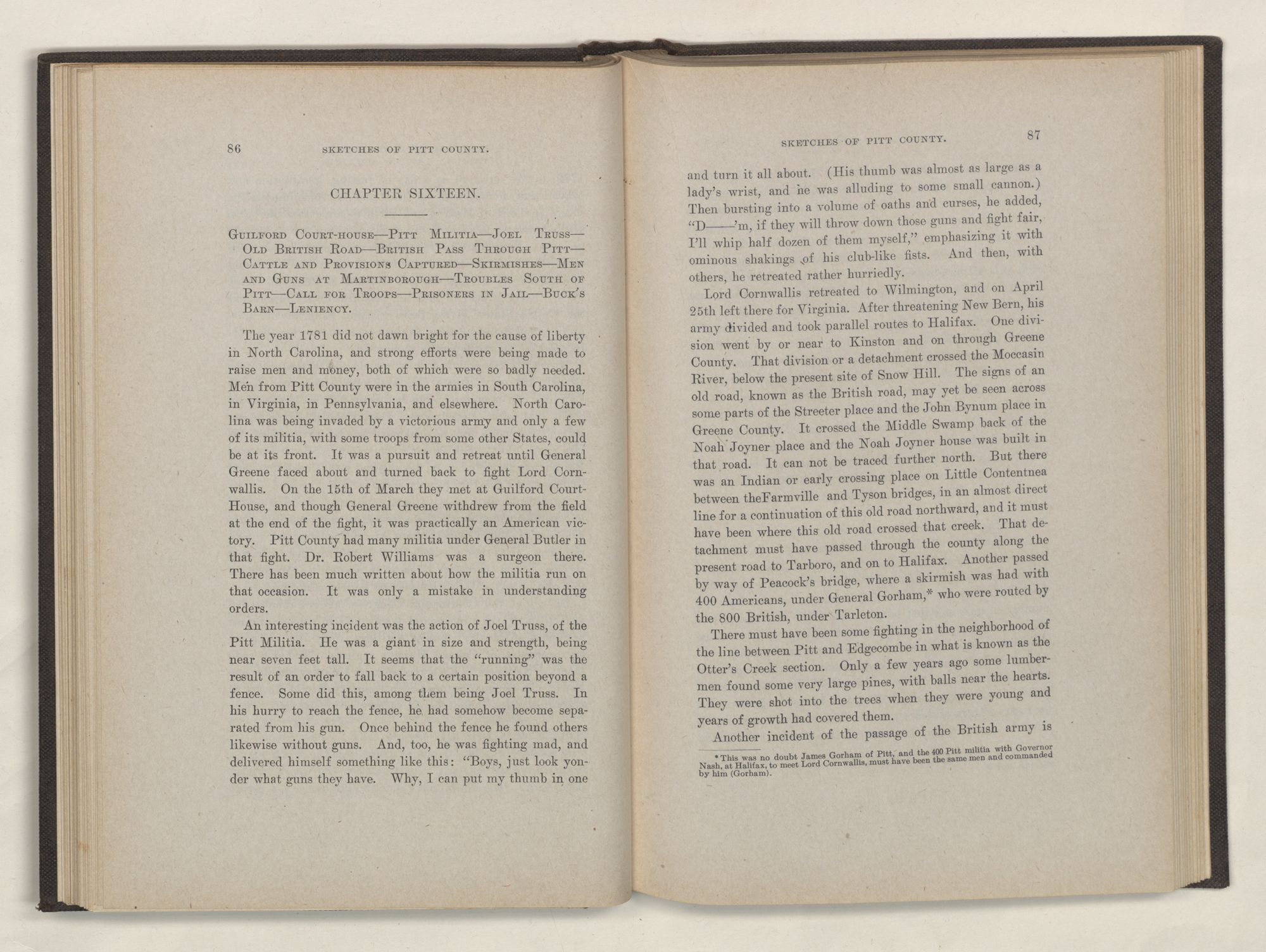 | CHAPTER SIXTEEN. Guilford Court-house—Pitt Militia—Joel Truss—Old British Road—British Pass Through Pitt—Cattle and Provisions Captured—Skirmishes—Men and Guns at Martinborough—Troubles South of Pitt—Call for Troops—Prisoners in Jail—Buck's Barn—Leniency | 86 |