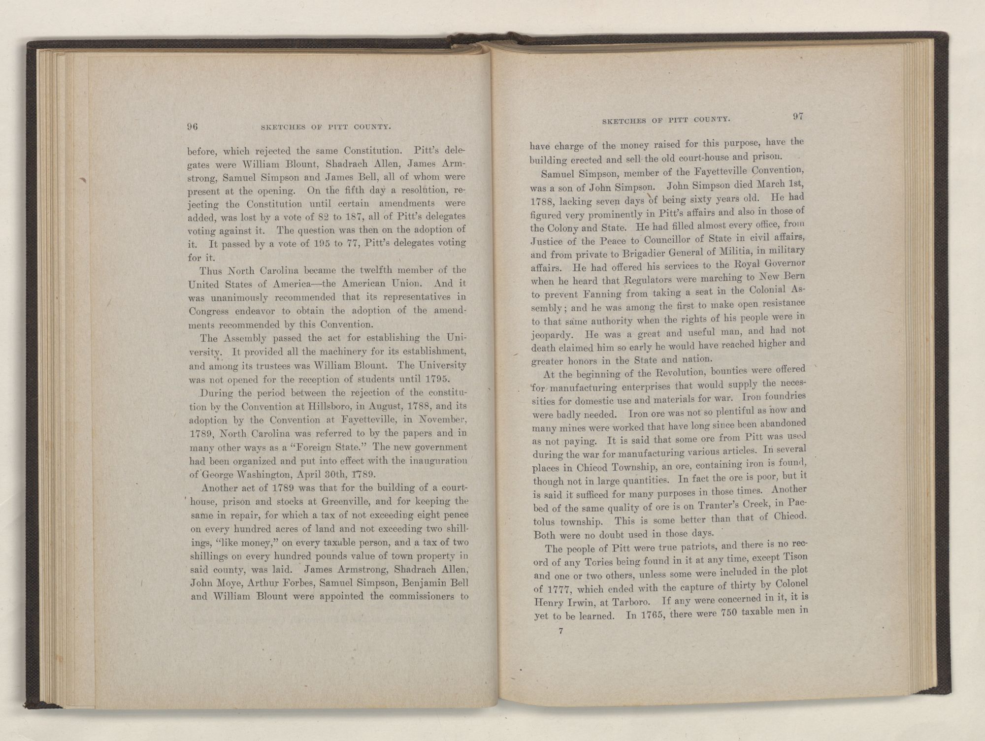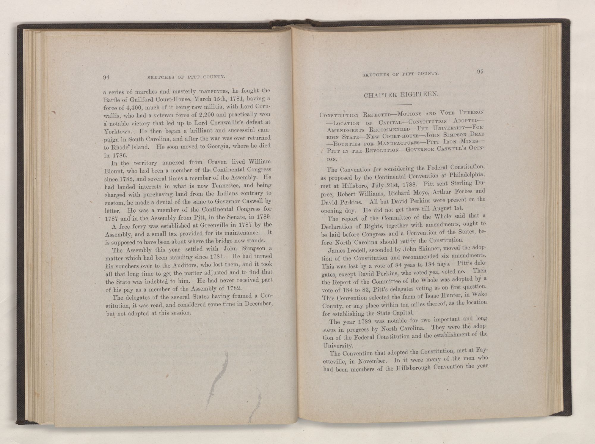 | CHAPTER EIGHTEEN. Constitution Rejected—Motions and Vote Thereon—Location of Capital—Constitution Adopted—Amendments Recommended—The University—Foreign State—New Court-house—John Simpson Dead—Bounties for Manufactures—Pitt Iron Mines—Pitt in the Revolution—Governor Caswell's Opinion | 95 |