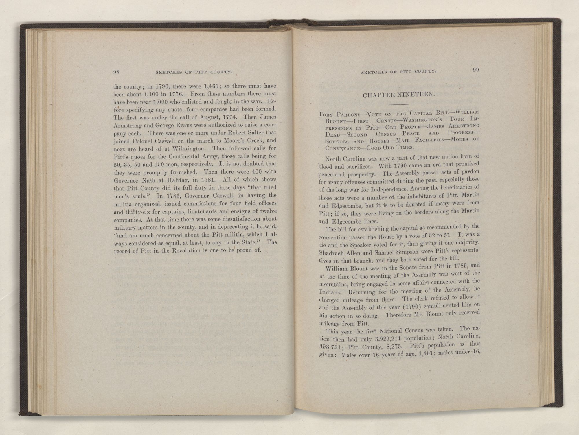 | CHAPTER NINETEEN. Tory Pardons—Vote on the Capital Bill—William Blount—First Census—Washington's Tour—Impressions in Pitt—Old People—James Armstrong Dead—Second Census—Peace and Progress—Schools and Houses—Mail Facilities—Modes of Conveyance—Good Old Times | 99 |